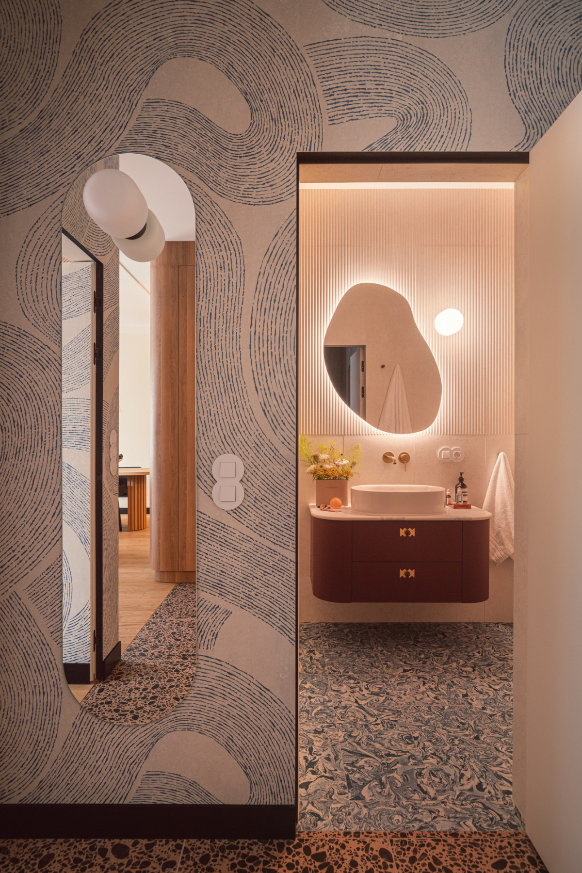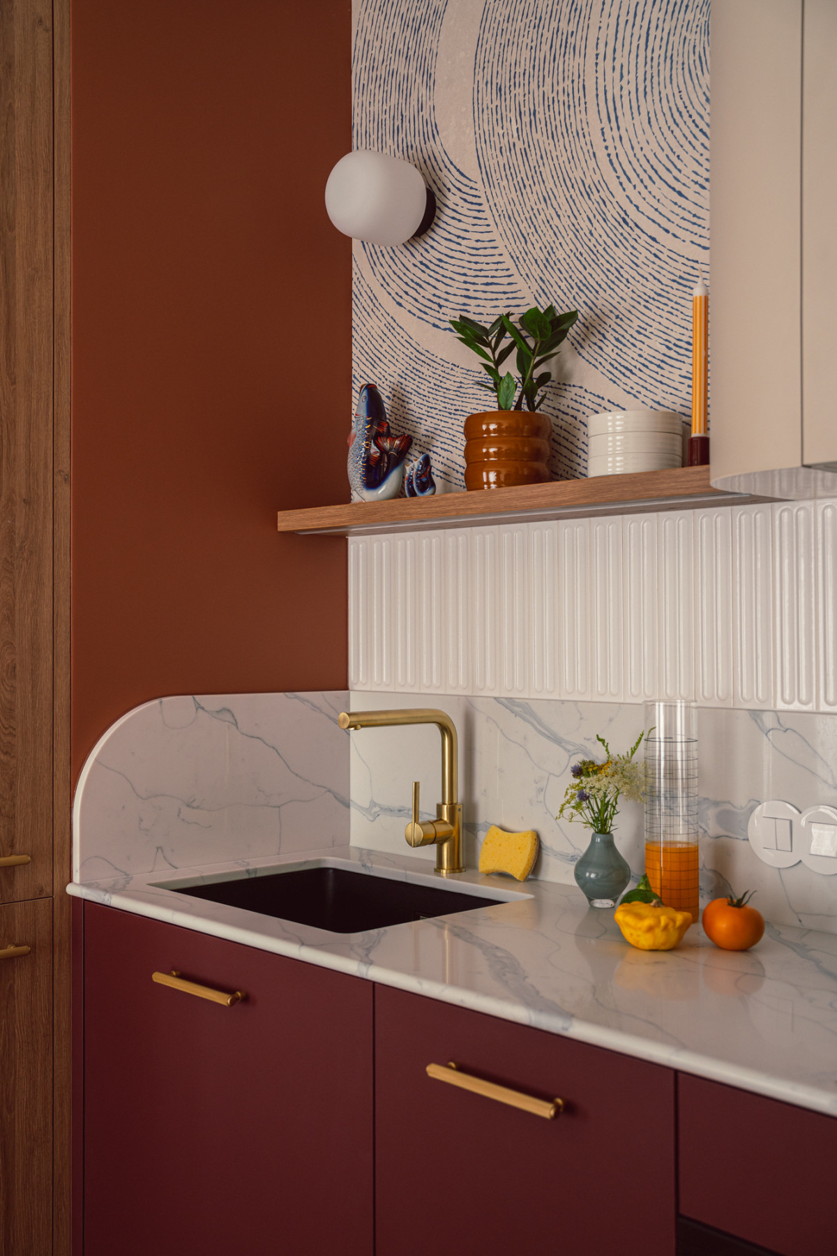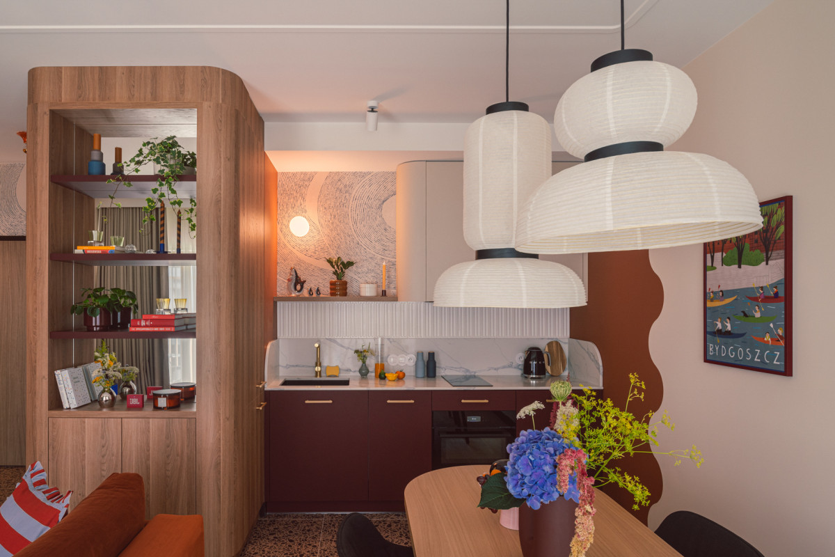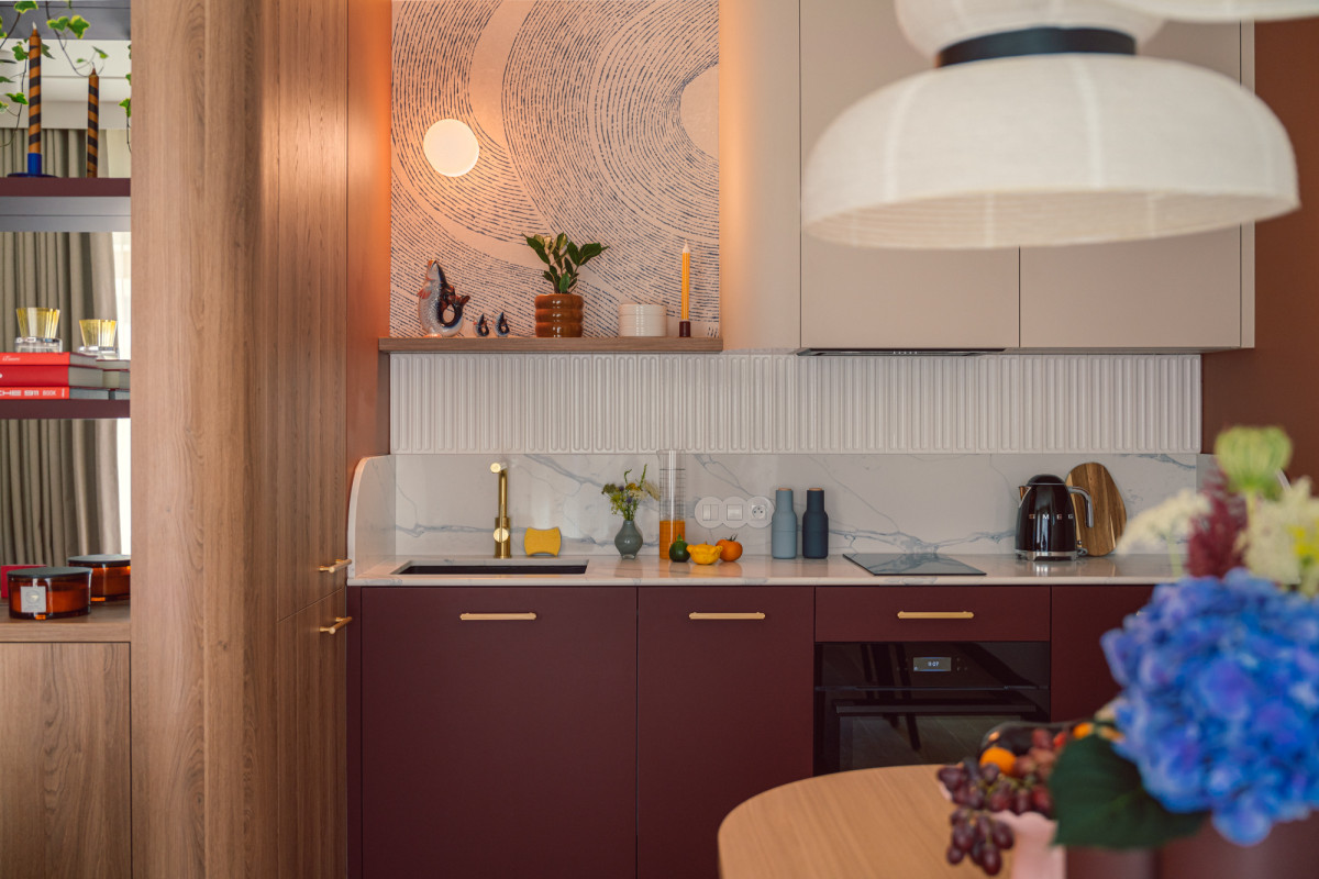 W kuchni, fronty dolnej zabudowy w kolorze głębokiego burgundu harmonizują z różowymi płytkami ceramicznymi na podłodze, a zaoblone górne, beżowe szafki i blat nawiązują do pozostałych elementów mieszkania. Graficzna tapeta przeniesiona z holu i rudy falowany wzór na ścianie dodają kuchennej strefie lekkości i swobody.