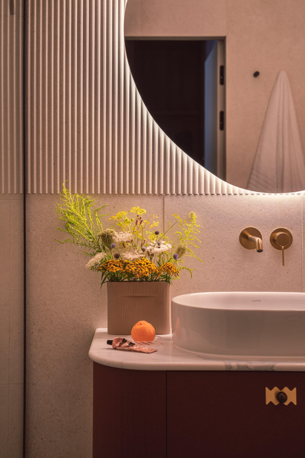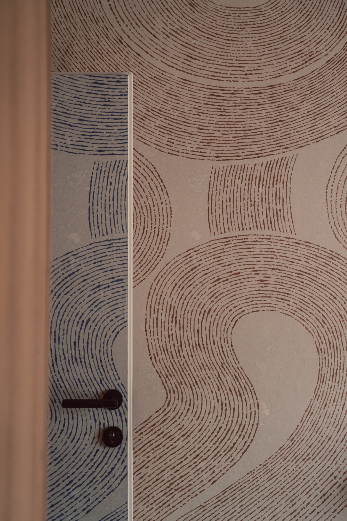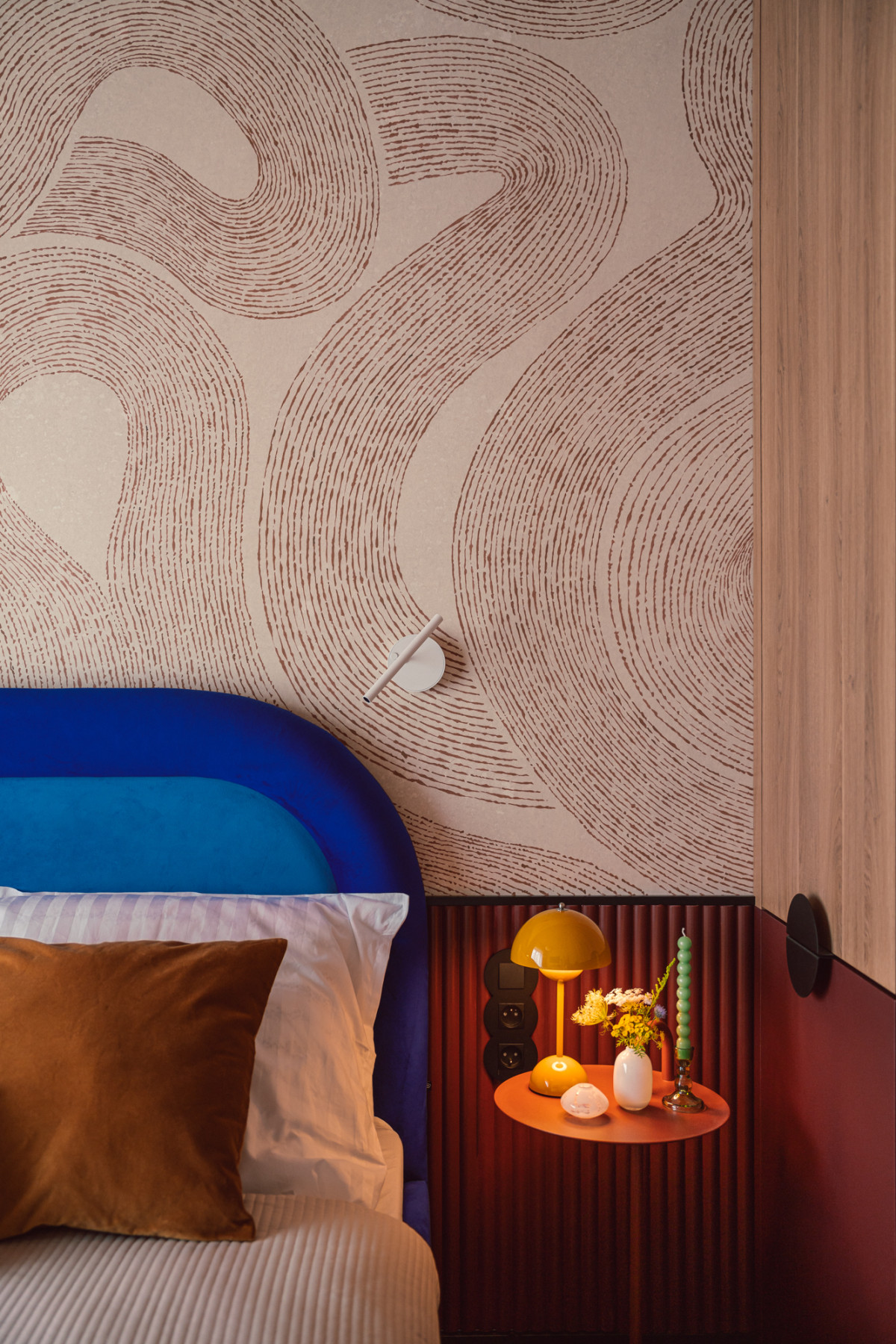 W kuchni, fronty dolnej zabudowy w kolorze głębokiego burgundu harmonizują z różowymi płytkami ceramicznymi na podłodze, a zaoblone górne, beżowe szafki i blat nawiązują do pozostałych elementów mieszkania. Graficzna tapeta przeniesiona z holu i rudy falowany wzór na ścianie dodają kuchennej strefie lekkości i swobody.