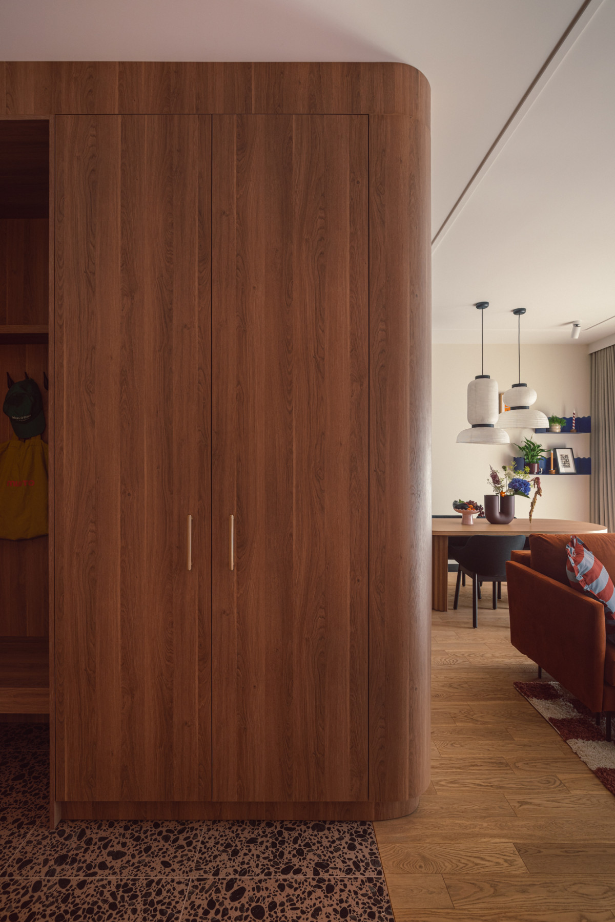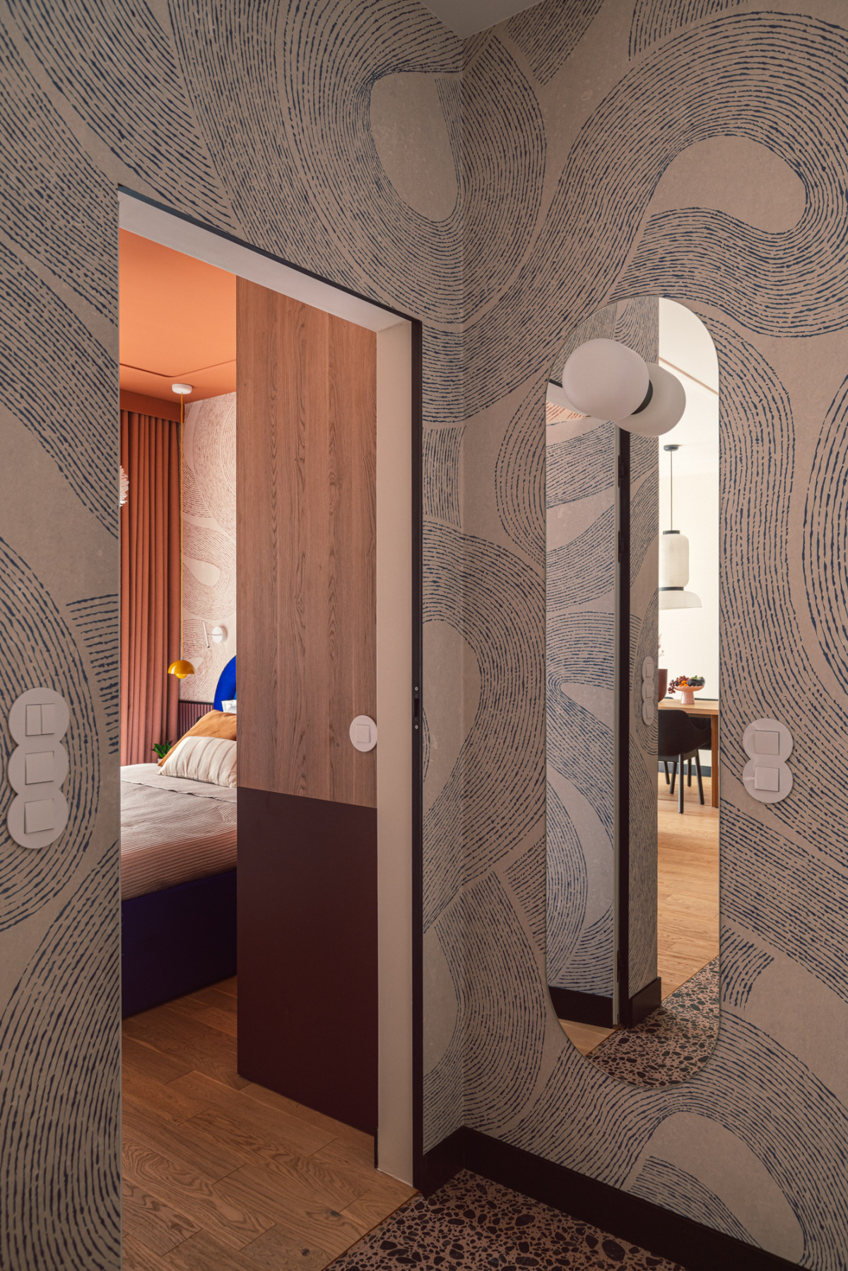 Hol i cała strefa wejścia wyróżnia się odważnym zestawem wzorów i kolorów. Uwagę zwraca tu tapeta z mocnym, niebieskim wzorem, różowo-czarne płytki przypominające bruk – słynne „kocie łby” z bydgoskiej starówki, a także zabudowa meblowa nadająca ton całej przestrzeni.