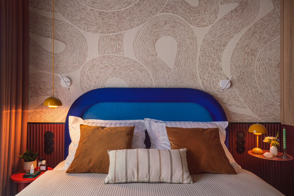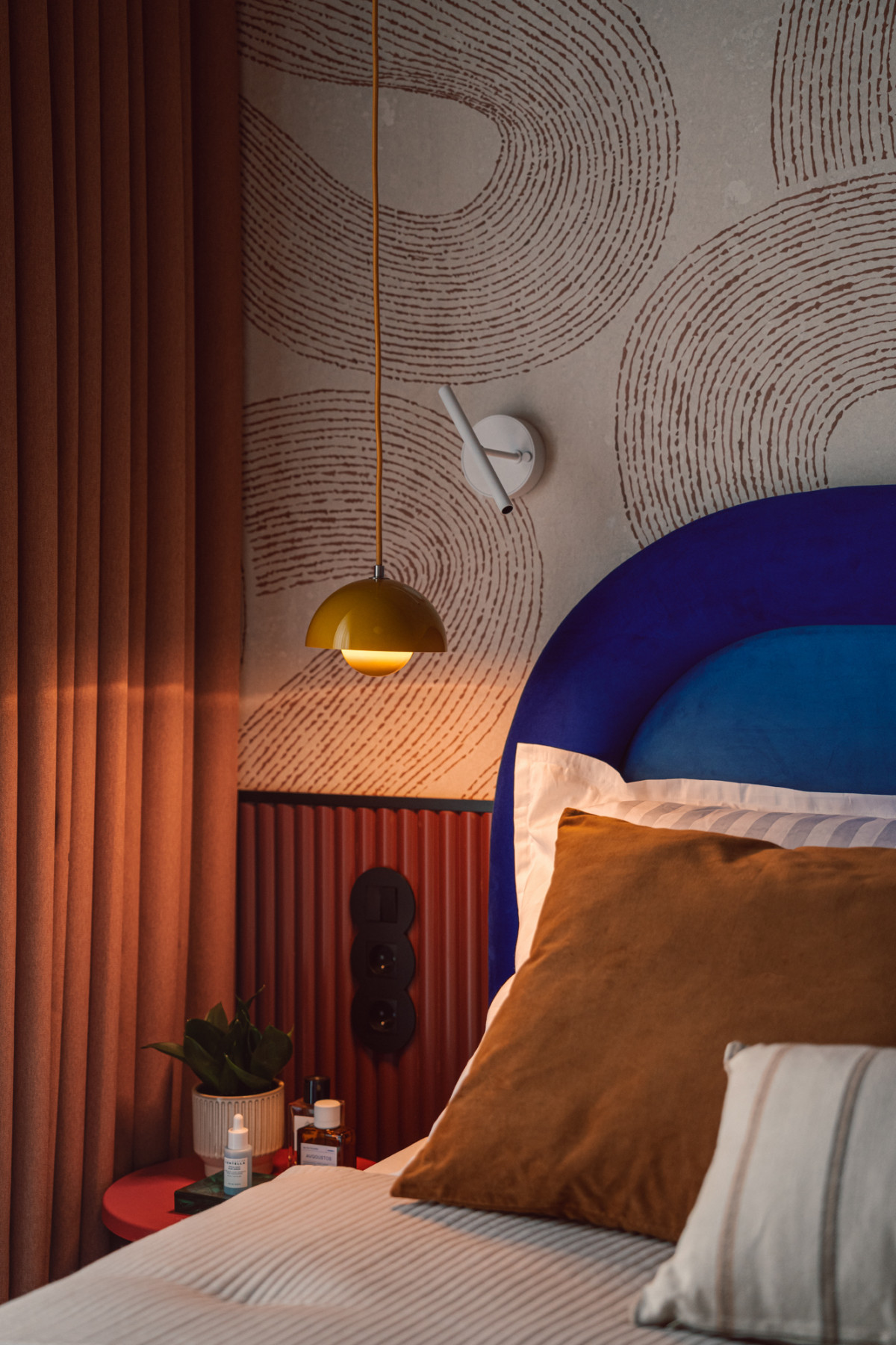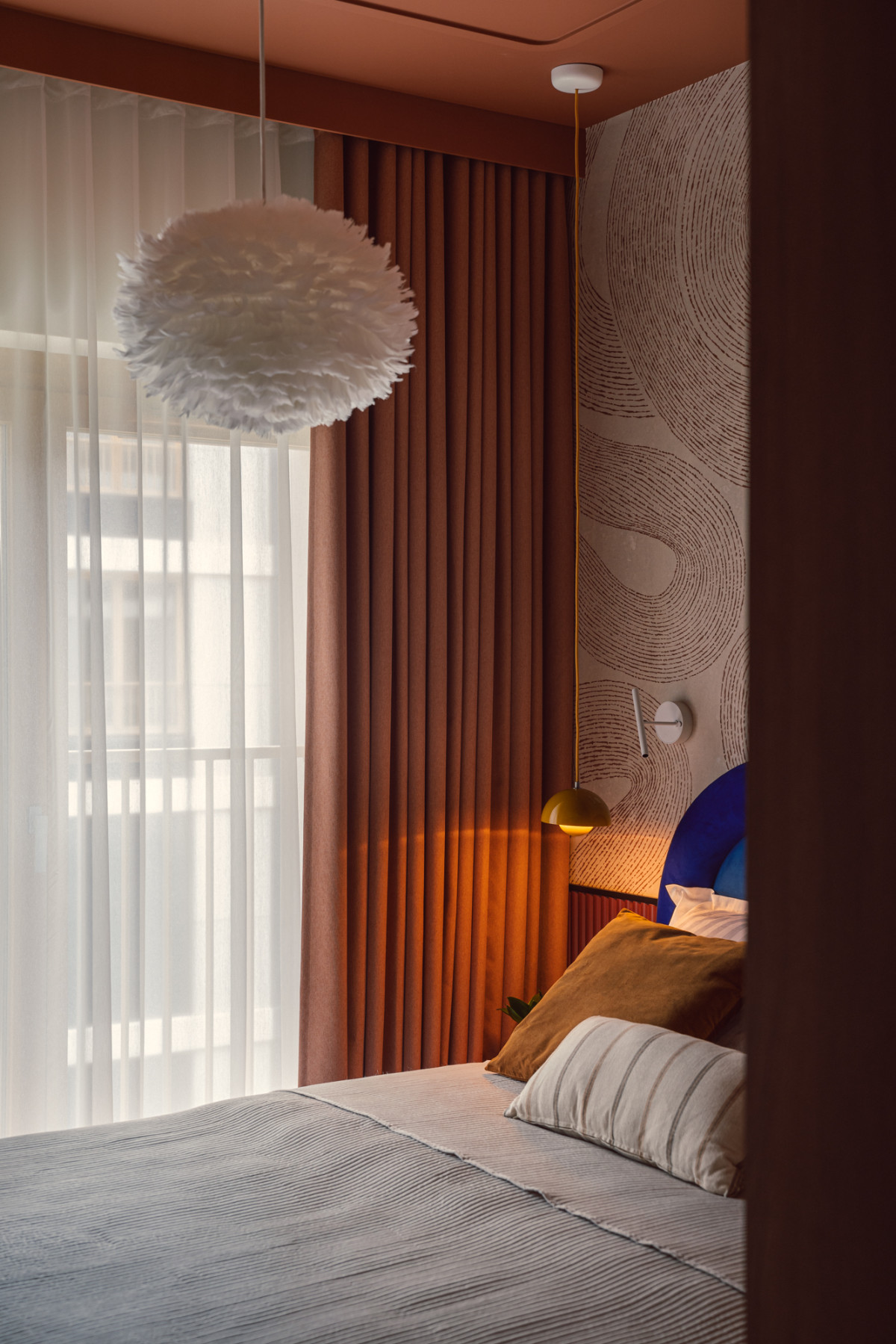 Sypialnia to z kolei przytulna, wyciszona przestrzeń, idealna do wypoczynku, w której dominuje rudy kolor – na suficie, zasłonach czy w formie tapety w centralnej części sypialni za zagłówkiem. Kolorystykę dopełniają burgundowe lamele i miodowa lampa dodająca aranżacji uroku.