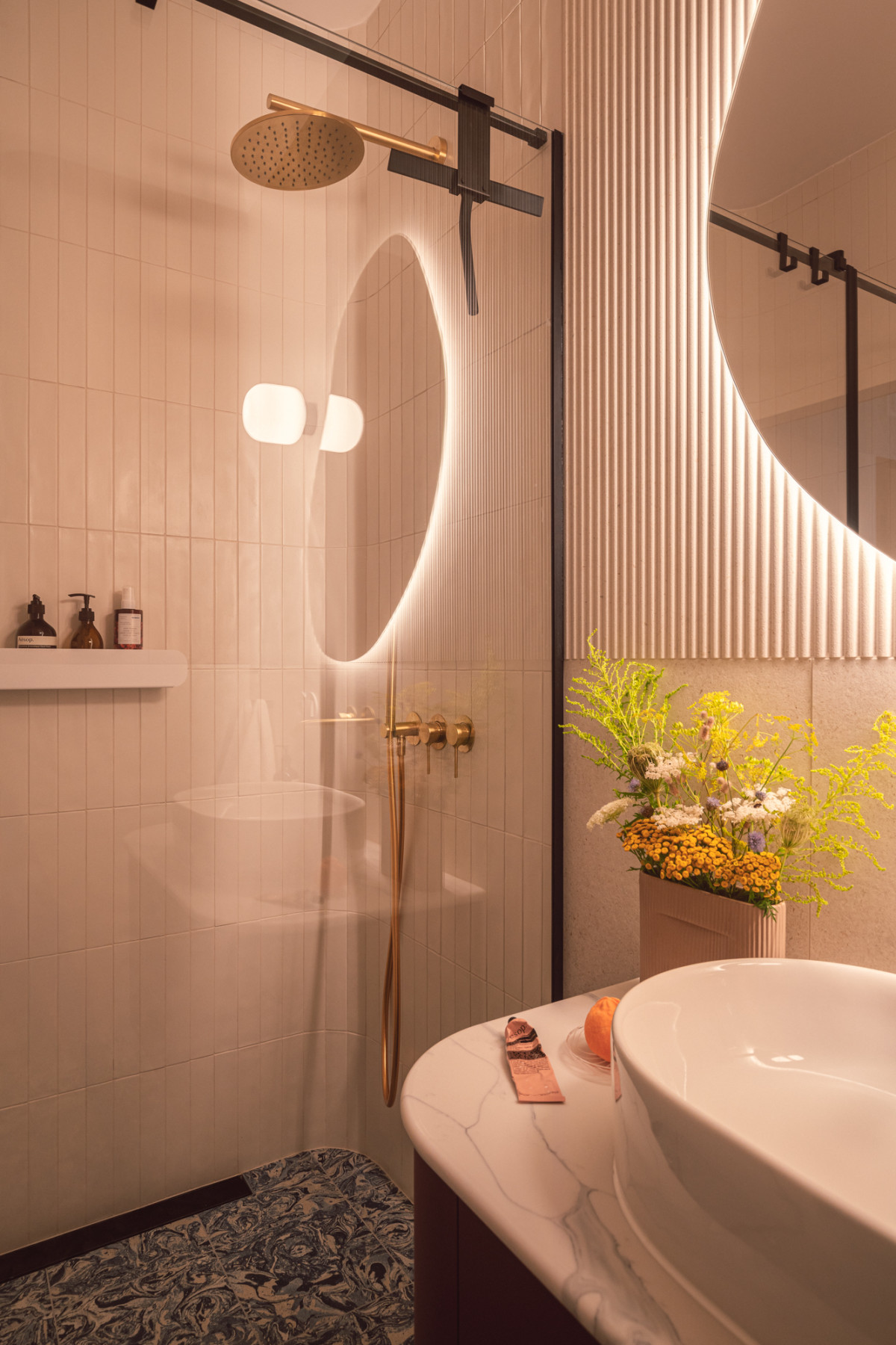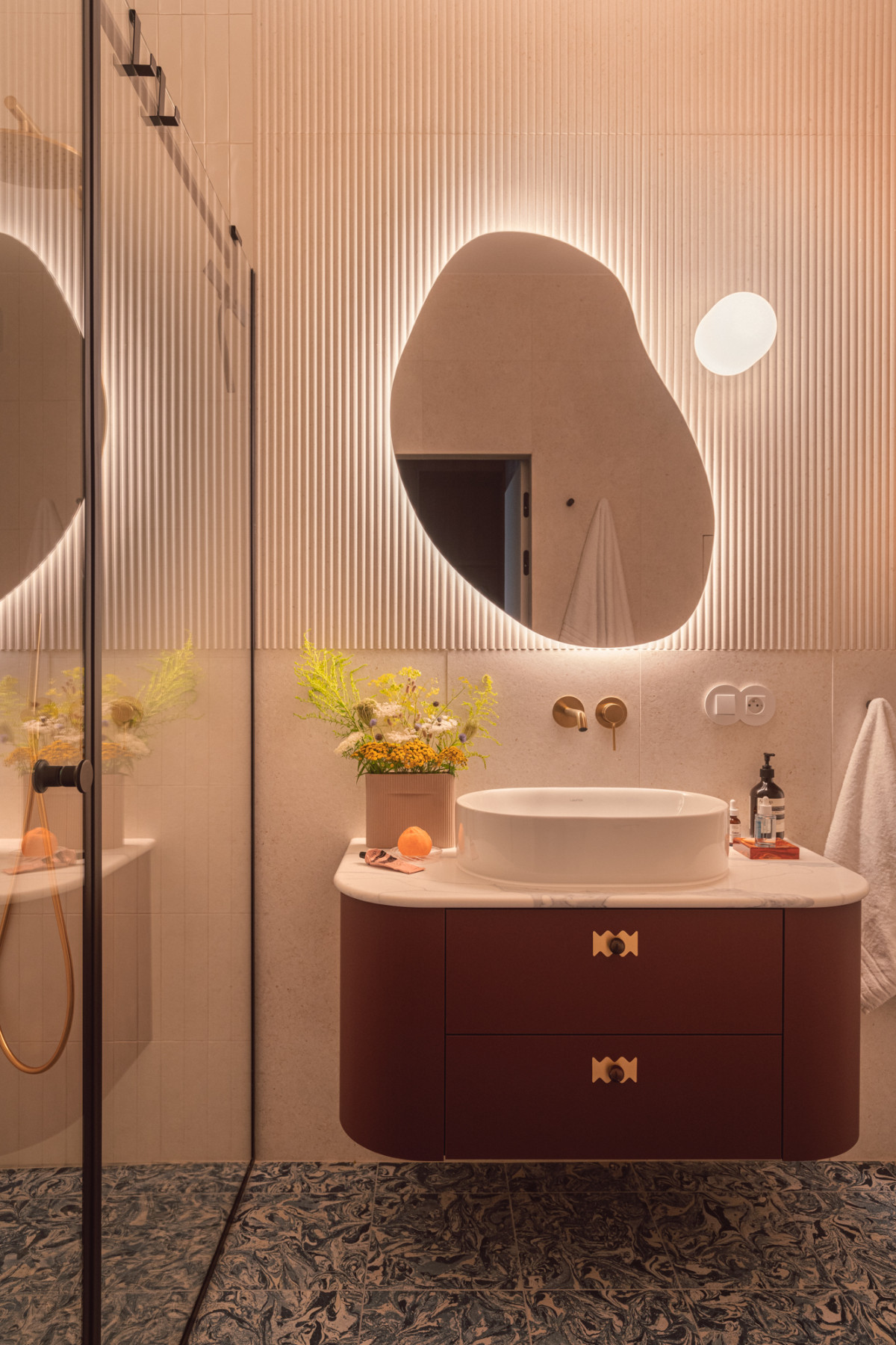 W łazience bordowa szafka pod umywalką tworzy kontrastujący zestaw z niebieskimi płytkami podłogowymi imitującymi powierzchnię wody. Ten wyrazisty zestaw łagodzą białe i beżowe elementy wykończeniowe oraz płynne, organiczne formy, m.in. zaokrąglony blat i strefa prysznicowa, frezowane płytki czy lustro o miękkiej linii.