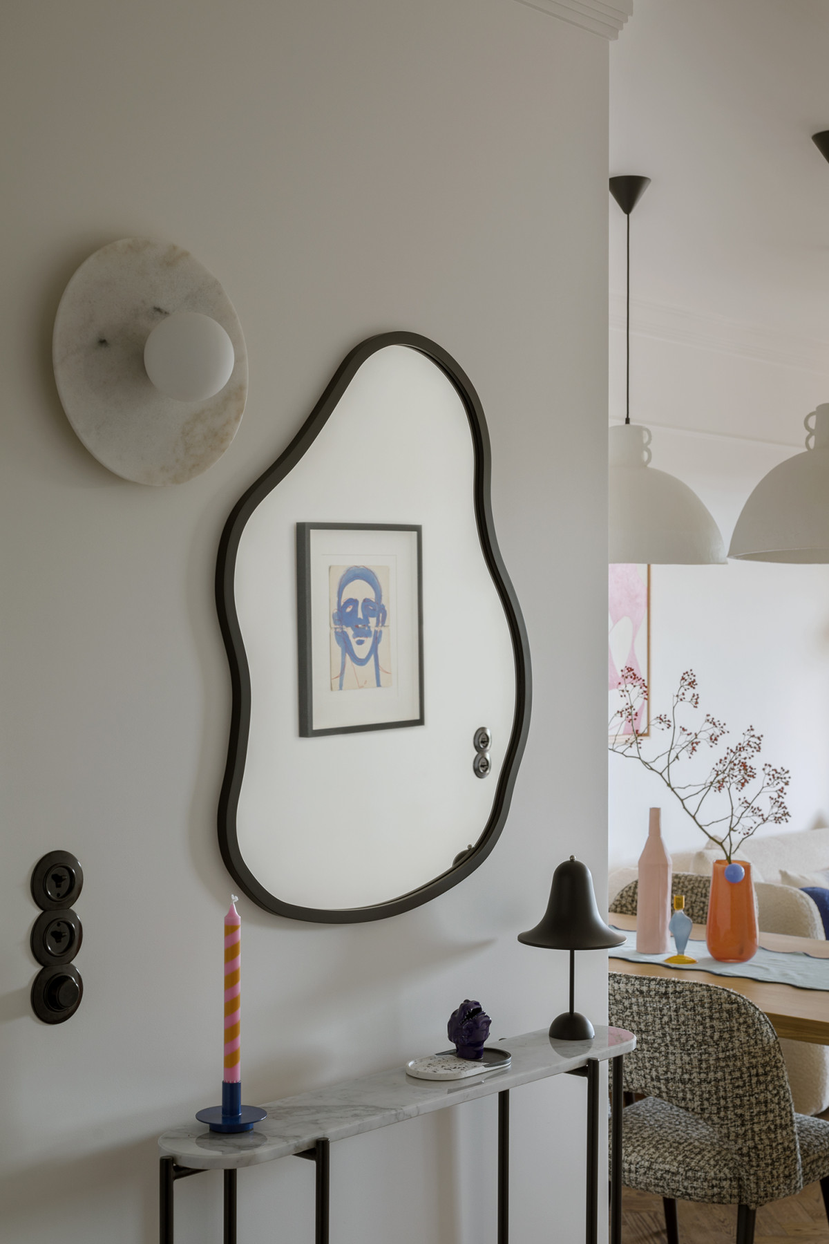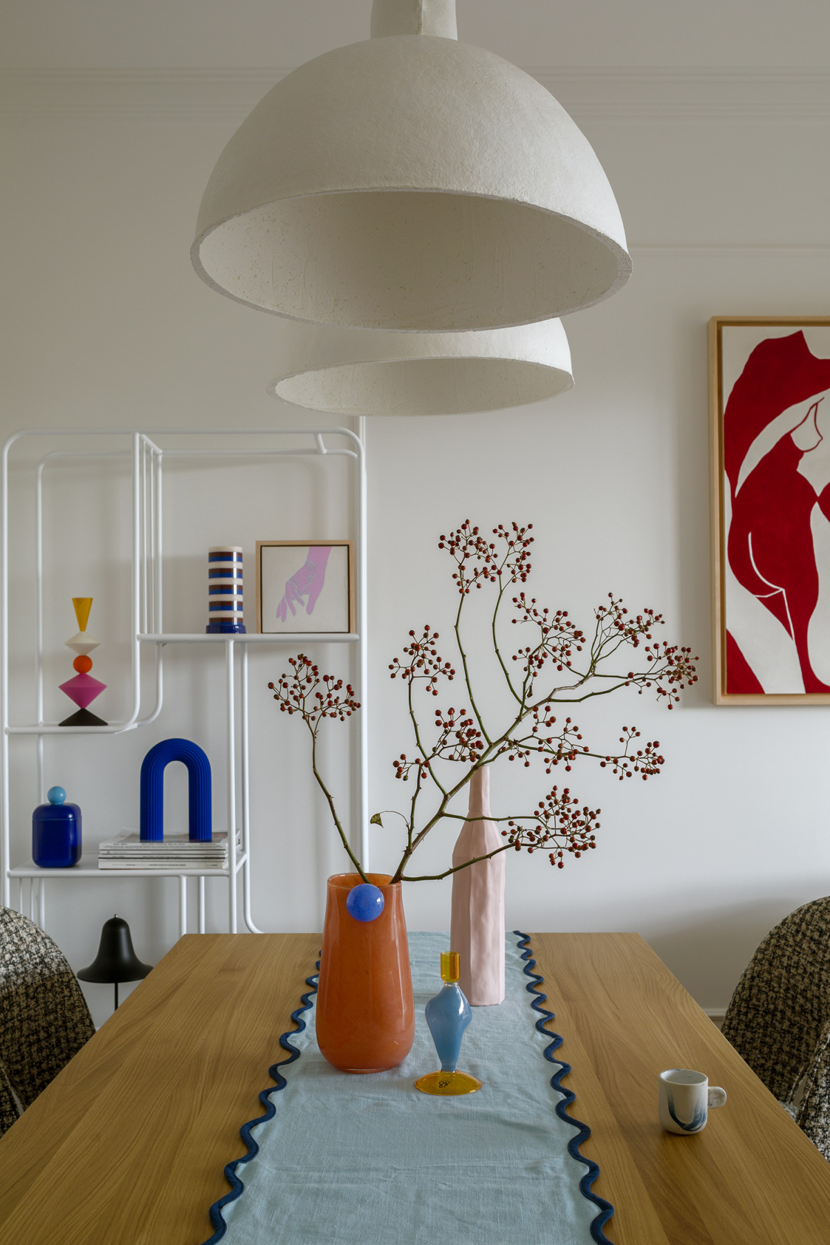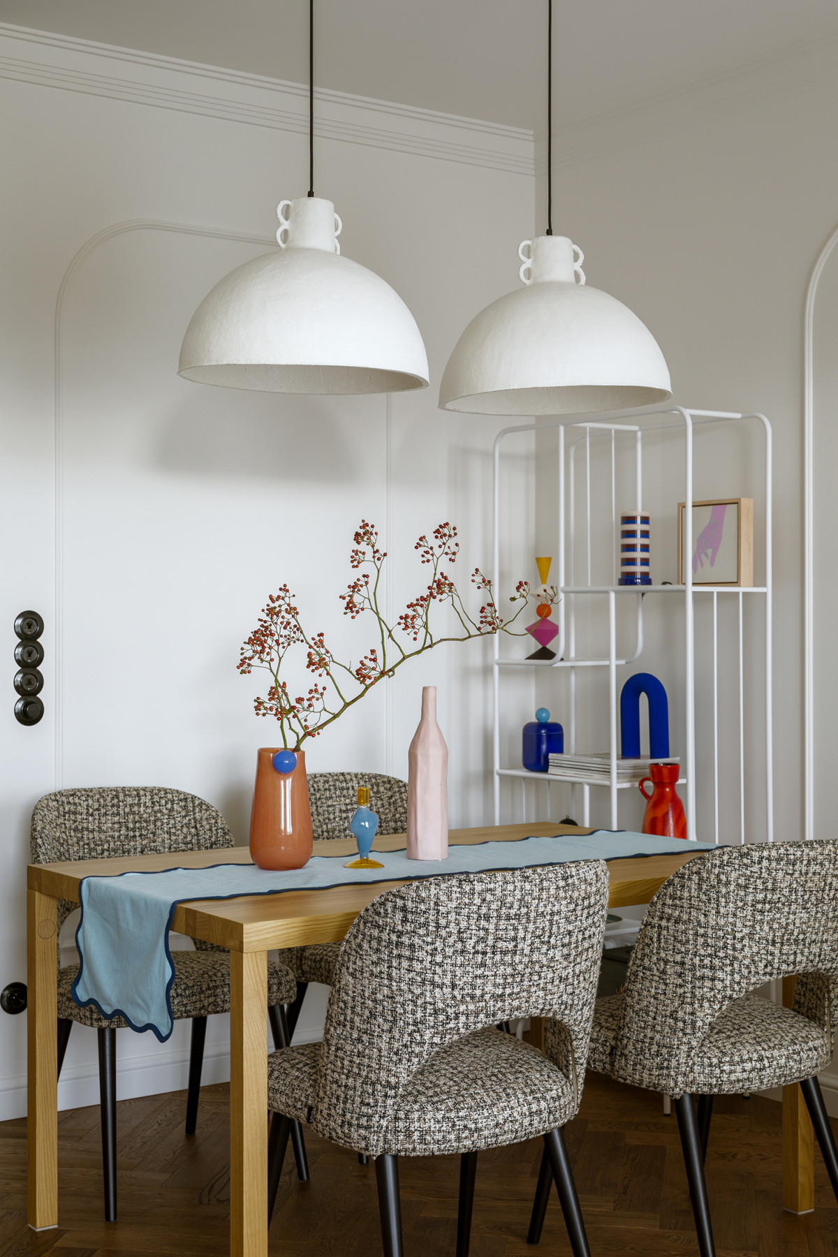 Strefa relaksu łączy się z jadalnią – tu przy drewnianym stole stanęły tapicerowane krzesła i lekki ażurowy regał na dekoracyjne drobiazgi, które ożywiają stonowaną przestrzeń nowoczesnymi formami i energetycznymi kolorami. To m.in. kolorowe totemy od Totem Studio Warsaw czy kadzielnicę „Pies Fo” (na stoliku w salonie) będącą repliką porcelanowego naczynka produkowanego w niezmienionej od 130 lat formie przez manufakturę Majolika Nieborów.