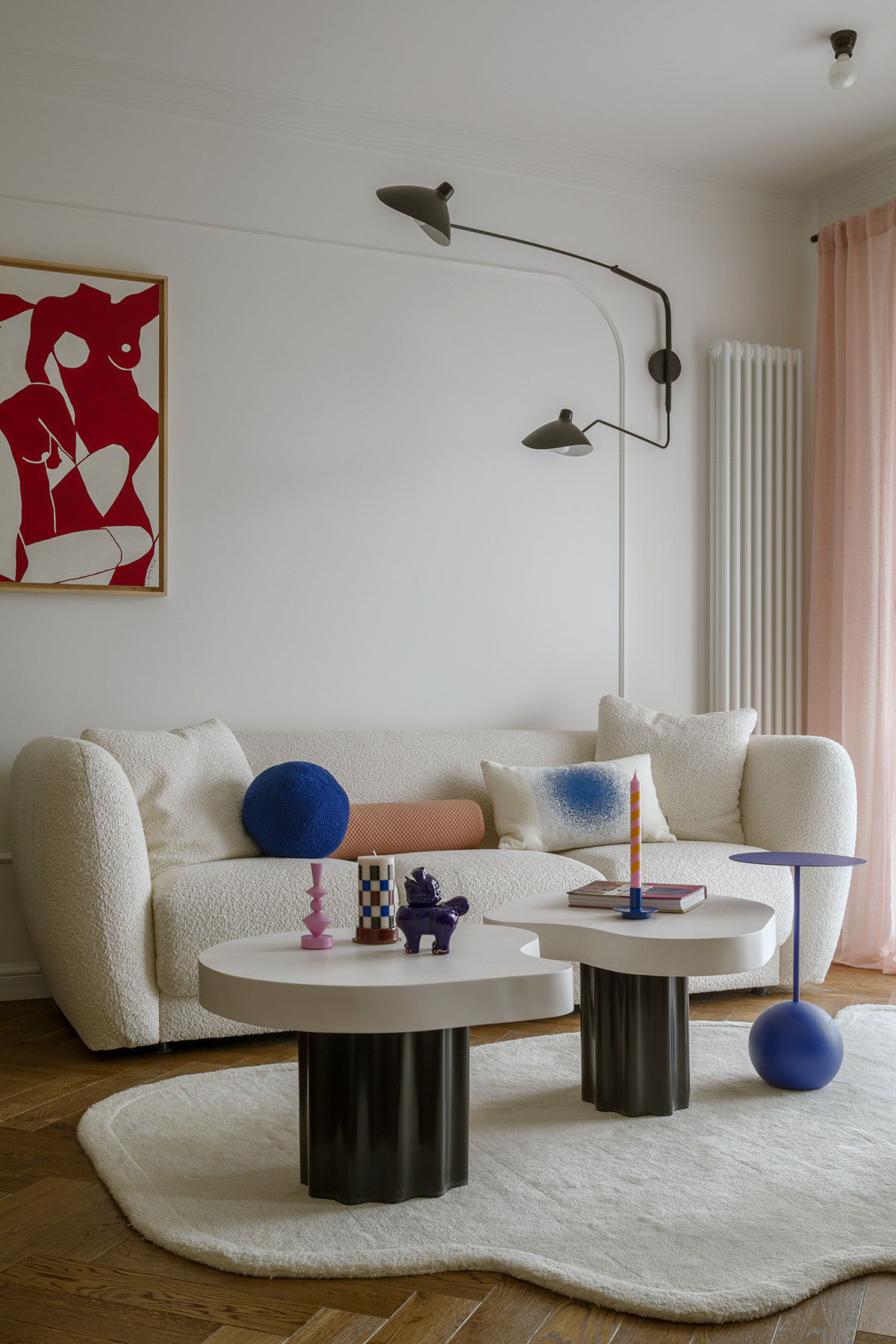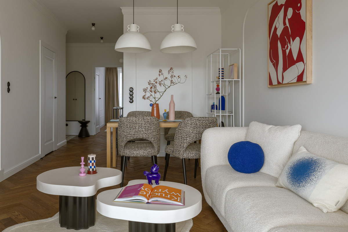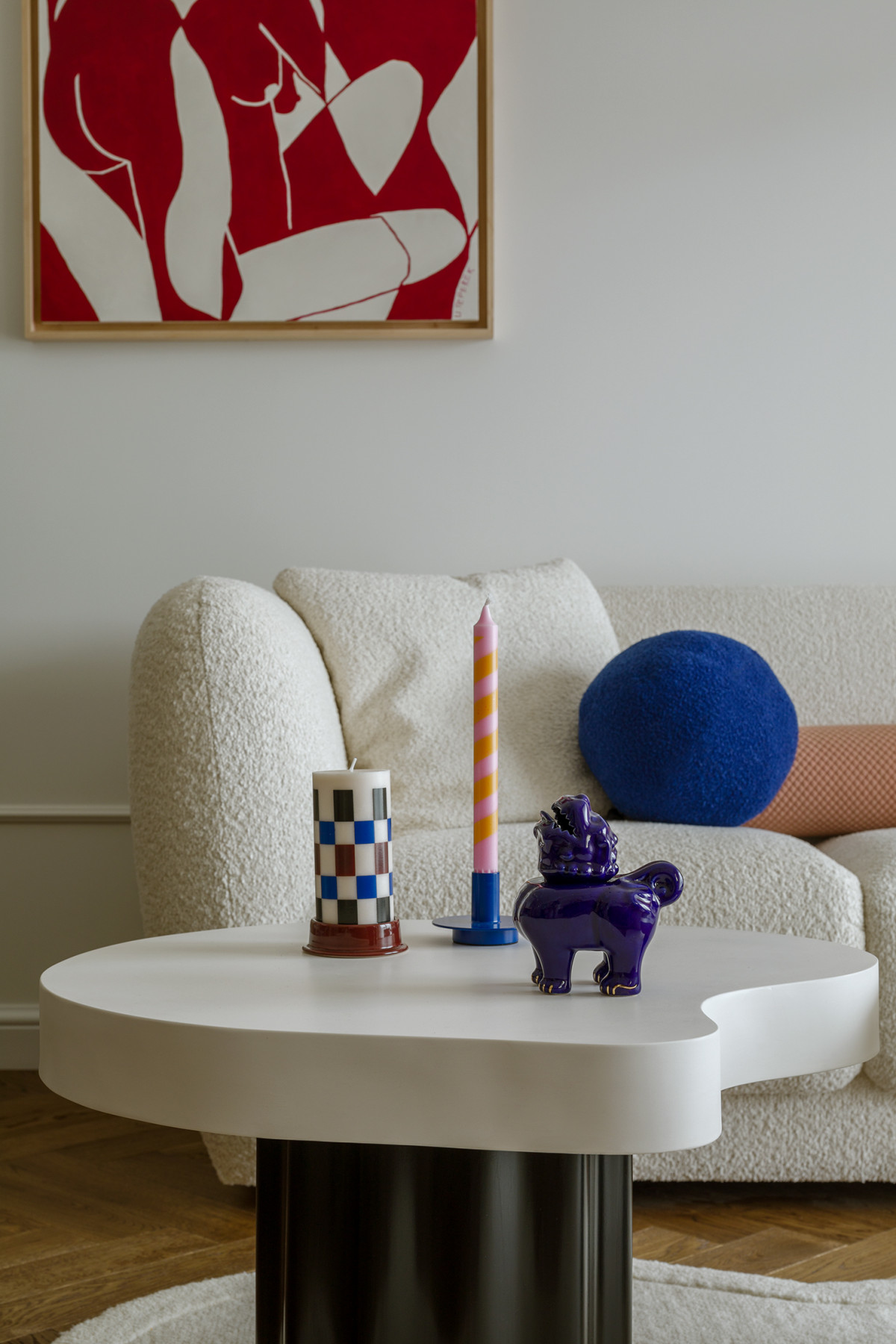 Obłe kształty wyspy kuchennej nadały ton całej aranżacji. W salonie pojawiły się więc meble wypoczynkowe o miękkich, łagodnie zaokrąglonych kształtach. Designerskie stoliki od Perler Design to prawdziwe perełki wyróżnione w konkursie Dobry Wzór – ich blaty o płynnych liniach rozlewają się jak kałuże na tle nieregularnego dywanu. Mocnym akcentem kolorystycznym w części wypoczynkowej jest obraz Urszuli Teperek. Uproszczone sylwetki kobiet tworzą na płótnie rodzaj abstrakcji, a efekt wzmacnia oprawa ze sztukaterii, również delikatnie zaokrąglonych.