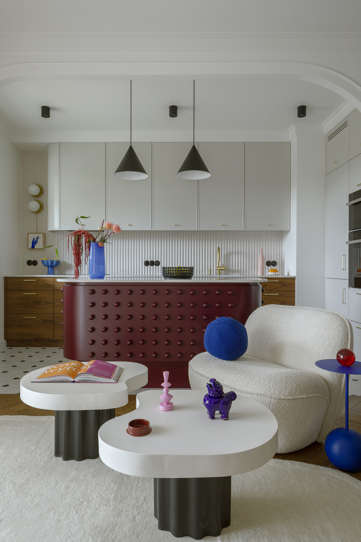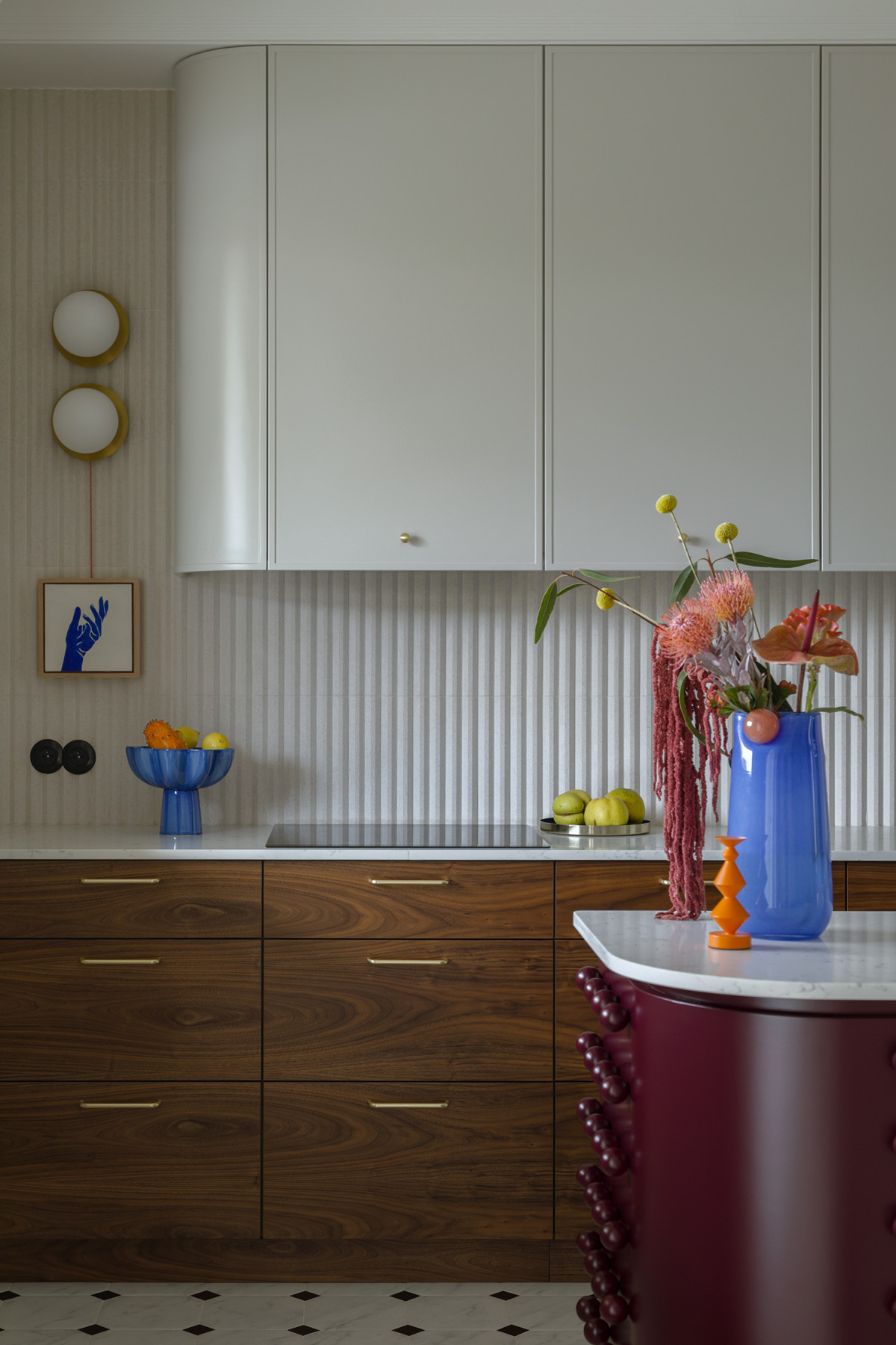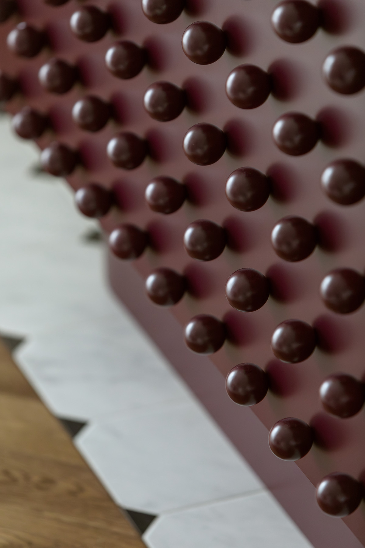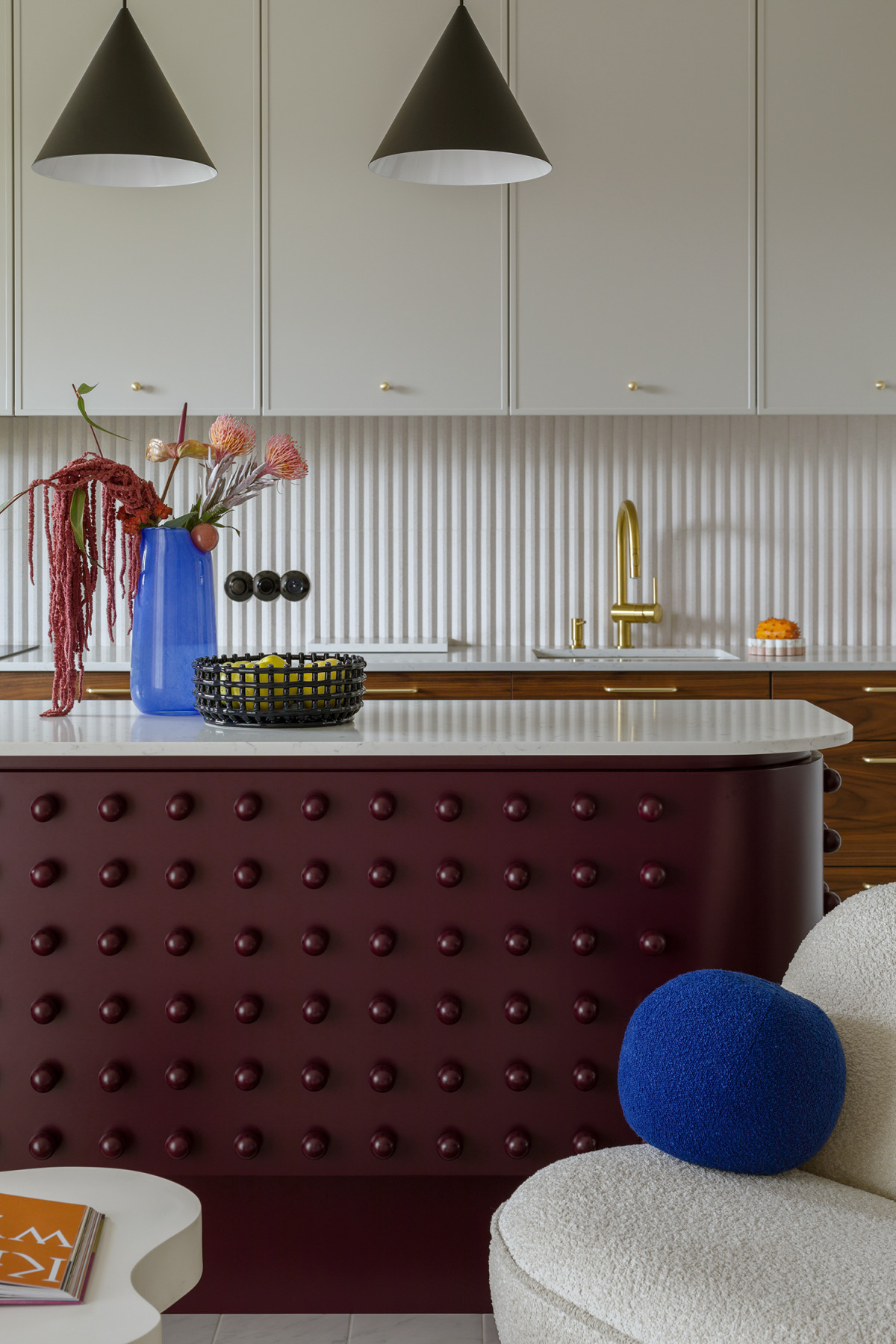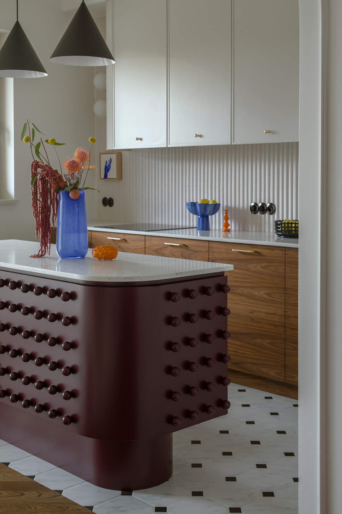 Następnie powstała spokojna i neutralna baza – mieszkanie wypełniły jasne, bezpieczne kolory i parkiet w klasyczną jodełkę, który ocieplił aranżację delikatnym odcieniem orzecha. Na takim tle miała stanąć kuchenna wyspa w tonacji beżu i fornirowane szafki. Projektantka zaproponowała jednak nowy pomysł na wyspę – bezpieczny beż zamienił się w szlachetne rubinowe bordo, a kanciasta bryła nabrała krągłości. Fronty wyspy, początkowo gładkie, zyskały ozdobę w formie kulek. Asia i Bartek z zadowoleniem przyjęli nową koncepcję wyspy.