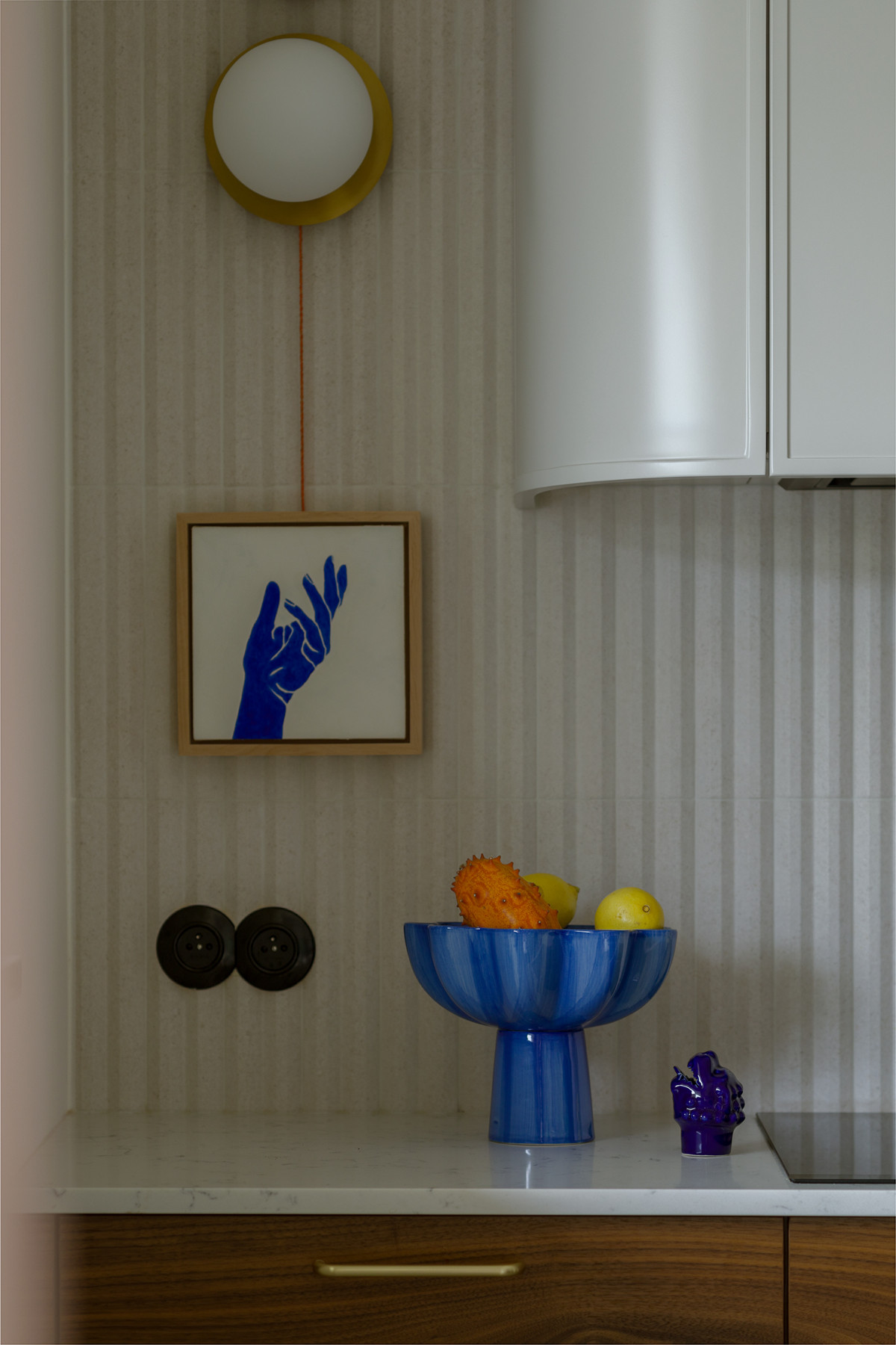 Cel był zatem jasny – nowoczesność złagodzona elementami ponadczasowej klasyki, która ożywi deweloperską przestrzeń i subtelnie nawiąże do minionych czasów. W pierwszej kolejności należało jednak wprowadzić drobne zmiany w układzie funkcjonalnym. Na pierwszy ogień poszła ściana oddzielająca kuchnię od salonu. Częściowe wyburzenie otworzyło przestrzeń, wpuszczając do pokoju mnóstwo światła. Fragmenty muru architektka wykończyła ogromnym tłukiem, który połączył salon z częścią kuchenną.