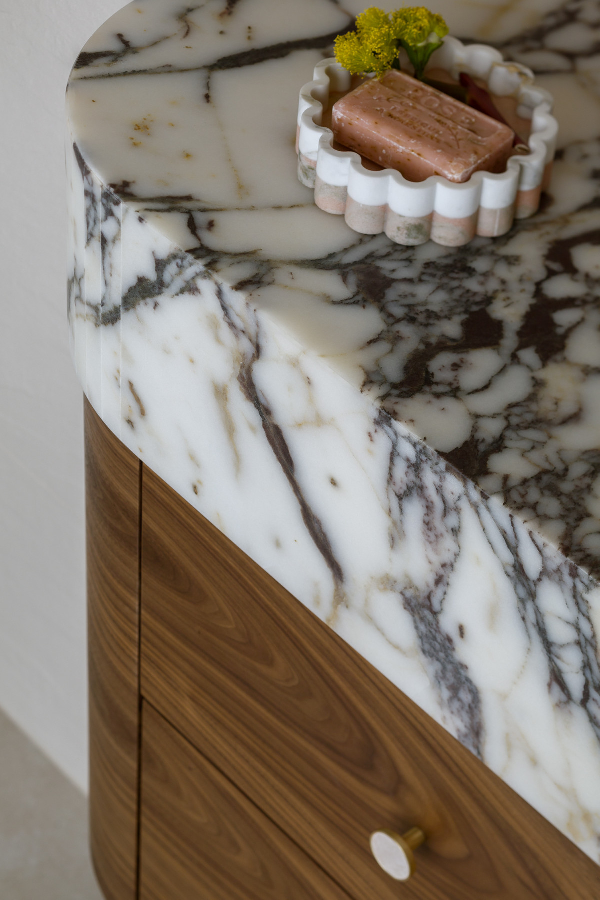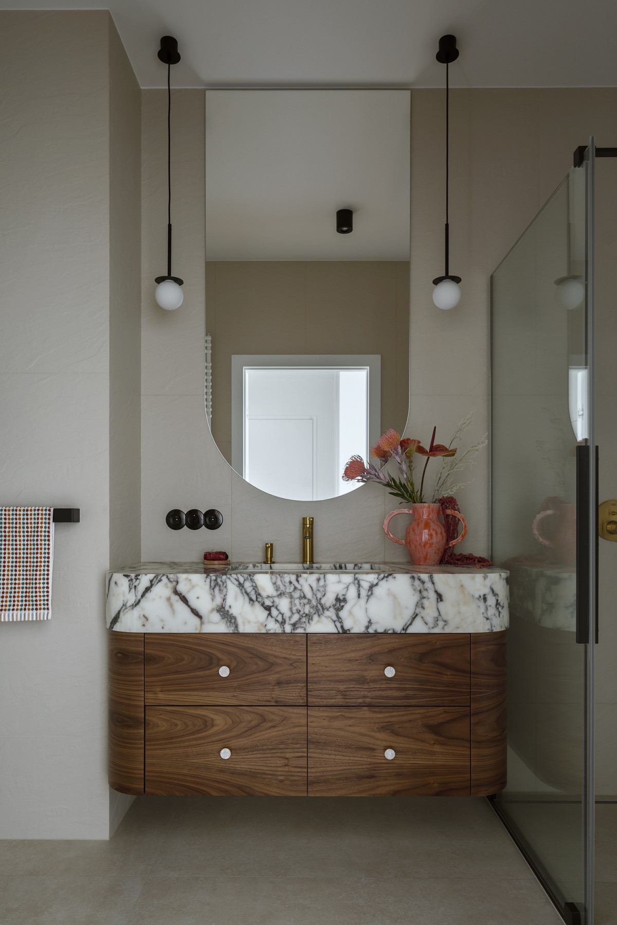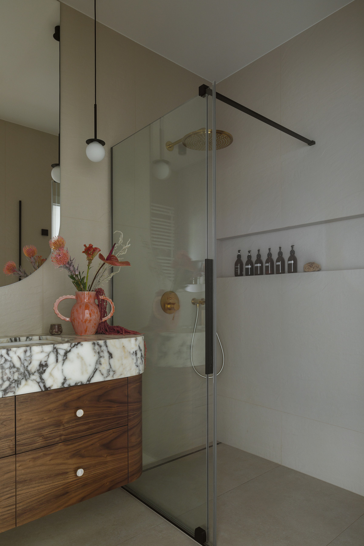 Bardziej naturalny charakter ma malutka łazienka. Właścicielom zależało, żeby wykorzystać w niej materiały inspirowane naturą. I tak podwieszana komódka pod umywalkę została obłożona szlachetnym fornirem. Architektce udało się namówić właścicieli, żeby zamiast cienkiego blatu położyć masywny kamienny slab Calacatta Viola, o cudownym rysunku szaro-burgundowych żył na kremowym tle. Biżuteryjnego sznytu dodają mosiężne uchwyty z kamiennymi oczkami i złote baterie. Ściany dekorują beżowe płytki przypominające nierówną strukturą piaskowiec, a wielkie łukowato zamknięte lustro flankują po bokach nisko zwieszone lampki-kule.