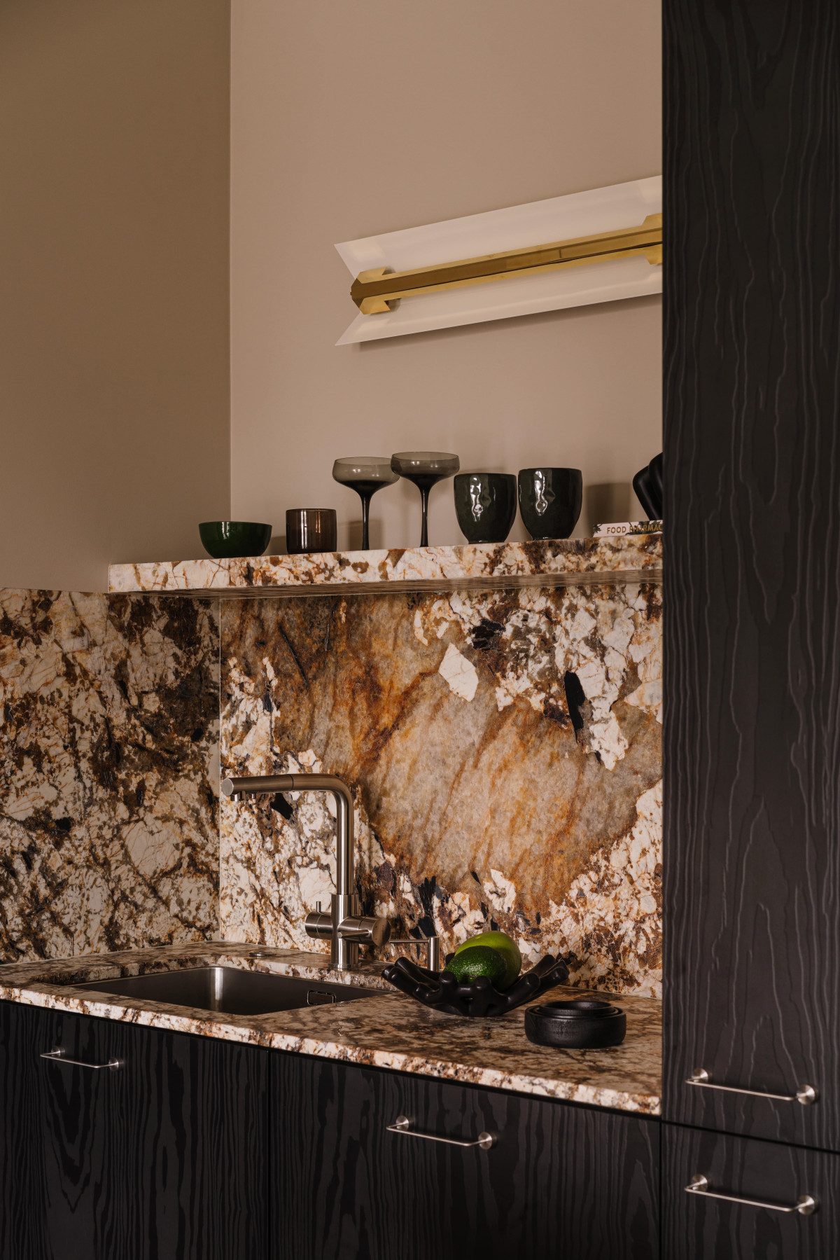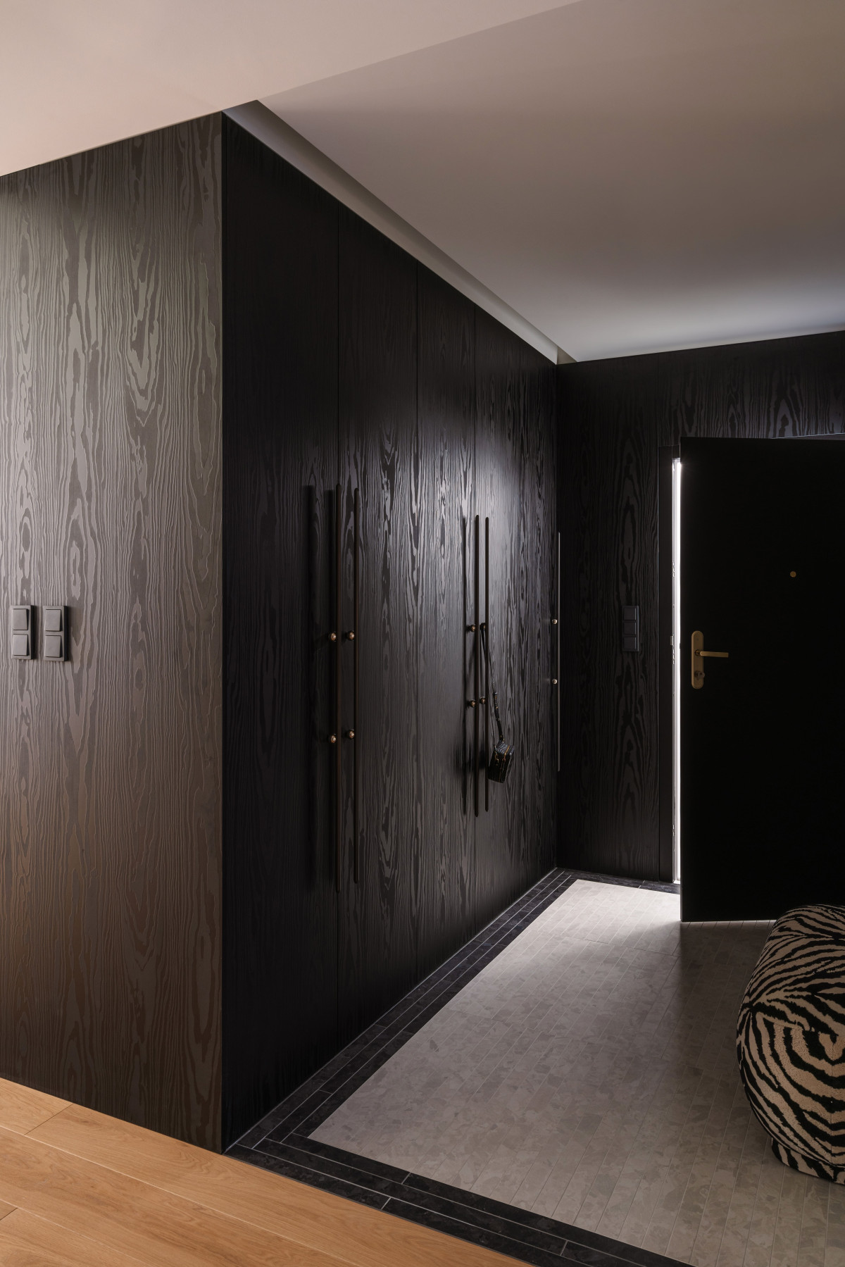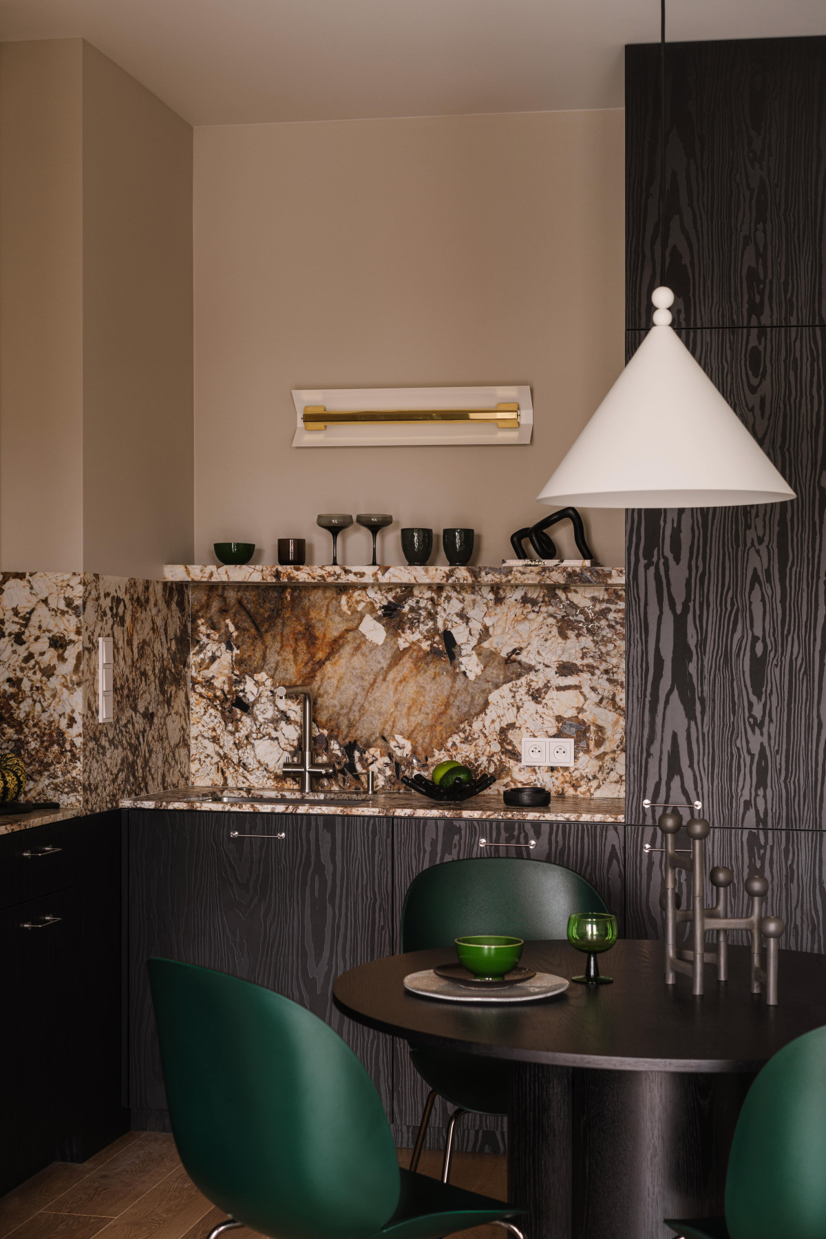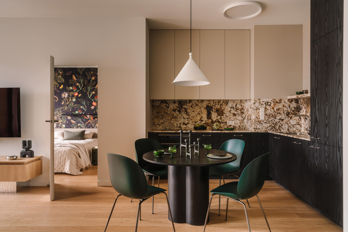 Kontrastem do miękkiej i jasnej części wypoczynkowej jest kuchnia z jadalnią. Utrzymane w głębokiej kolorystyce – z dominującą czernią i ciemnym fornirem – stają się graficznym akcentem mieszkania i świadomym rozdzieleniem funkcji. Zabudowa kuchni jest naturalną kontynuacją holu wejściowego – ciemny laminat wiernie odwzorowuje rysunek drewna, który dominuje na frontach, płynnie przechodzi z jednej strefy do drugiej, tworząc zwartą i harmonijną całość. By uniknąć ciężkości i efektu przytłoczenia, górne szafki kuchenne zostały wykończone w odcieniu niemal identycznym jak ściany. Blaty i okładziny wykonano z naturalnego, wzorzystego kwarcu – kamienia, który nie tylko pięknie się prezentuje, ale też sprawdza się w codziennym użytkowaniu, gdyż jest wytrzymały i odporny na wilgoć oraz barwniki.
