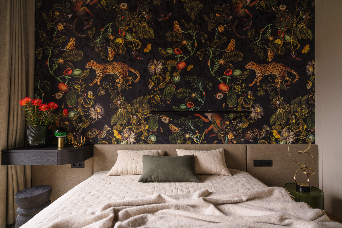 Najbardziej odważnym wizualnie pomieszczeniem jest sypialnia. Tu wzrok przykuwa tapeta z motywem dżungli, na której liście, paprocie i zwierzęta tworzą niemal scenograficzny efekt. Dla utrzymania równowagi, podobnie jak w strefie dziennej, ciemną zieleń i organiczne wzory zestawiono tu z fakturami naturalnych tkanin – jasną tapicerkę łóżka, bawełniane zasłony i lniane poduszki. W sypialni pojawiają się też wyraziste detale, np., czarny rzeźbiony taboret czy zielony szklany wazon. Dopełnieniem jest rzeźba Krzysztofa Renesa wpisująca się w klimat wnętrza.