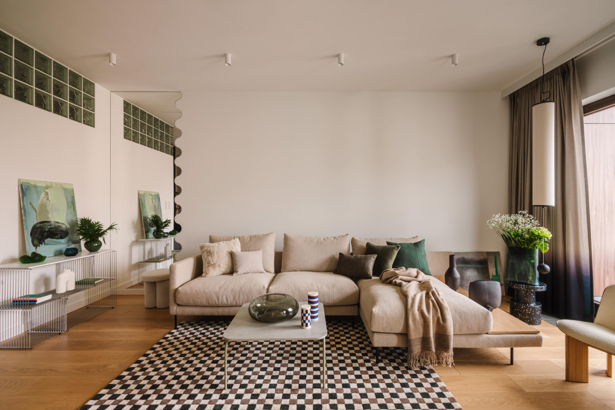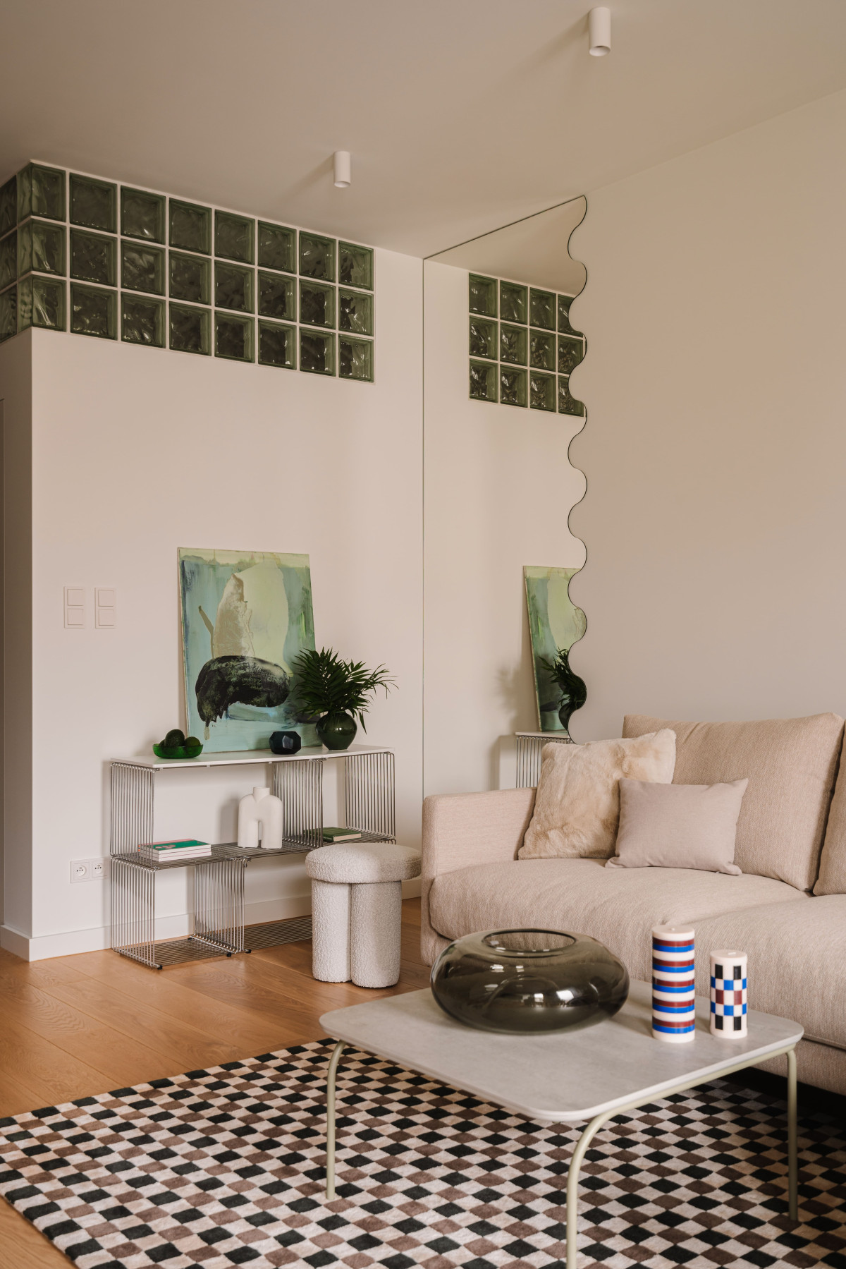 W przestrzeni dziennej znajdziemy kilka zaskakujących elementów – warto wymienić chociażby lustro o falistym kształcie, kolorowe świece czy przyciągający wzrok dywan w kratę. Co więcej, na ścianach pojawia się nowa odsłona luksferów – promienie słońca, które przez nie wpadają, rysują subtelne wzory na ścianach i suficie, tworząc intrygujący spektakl światła i cienia.