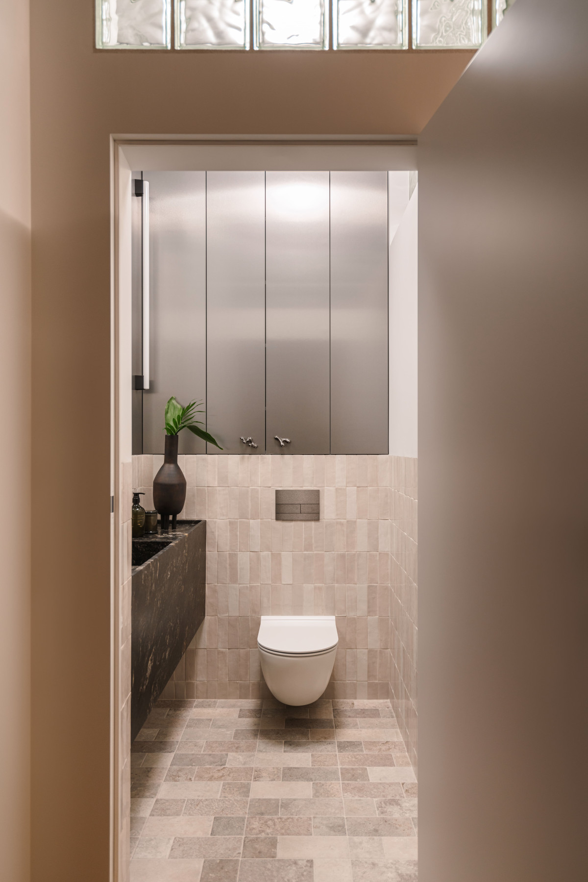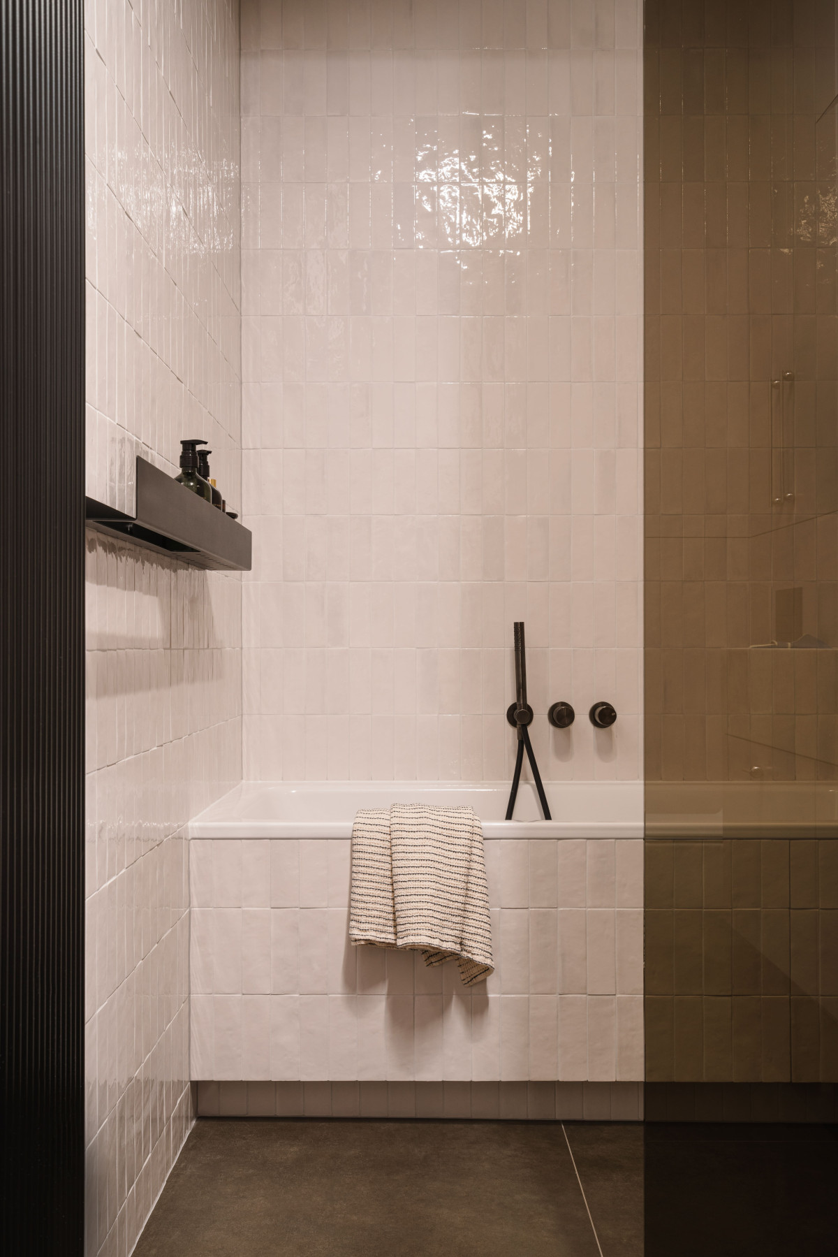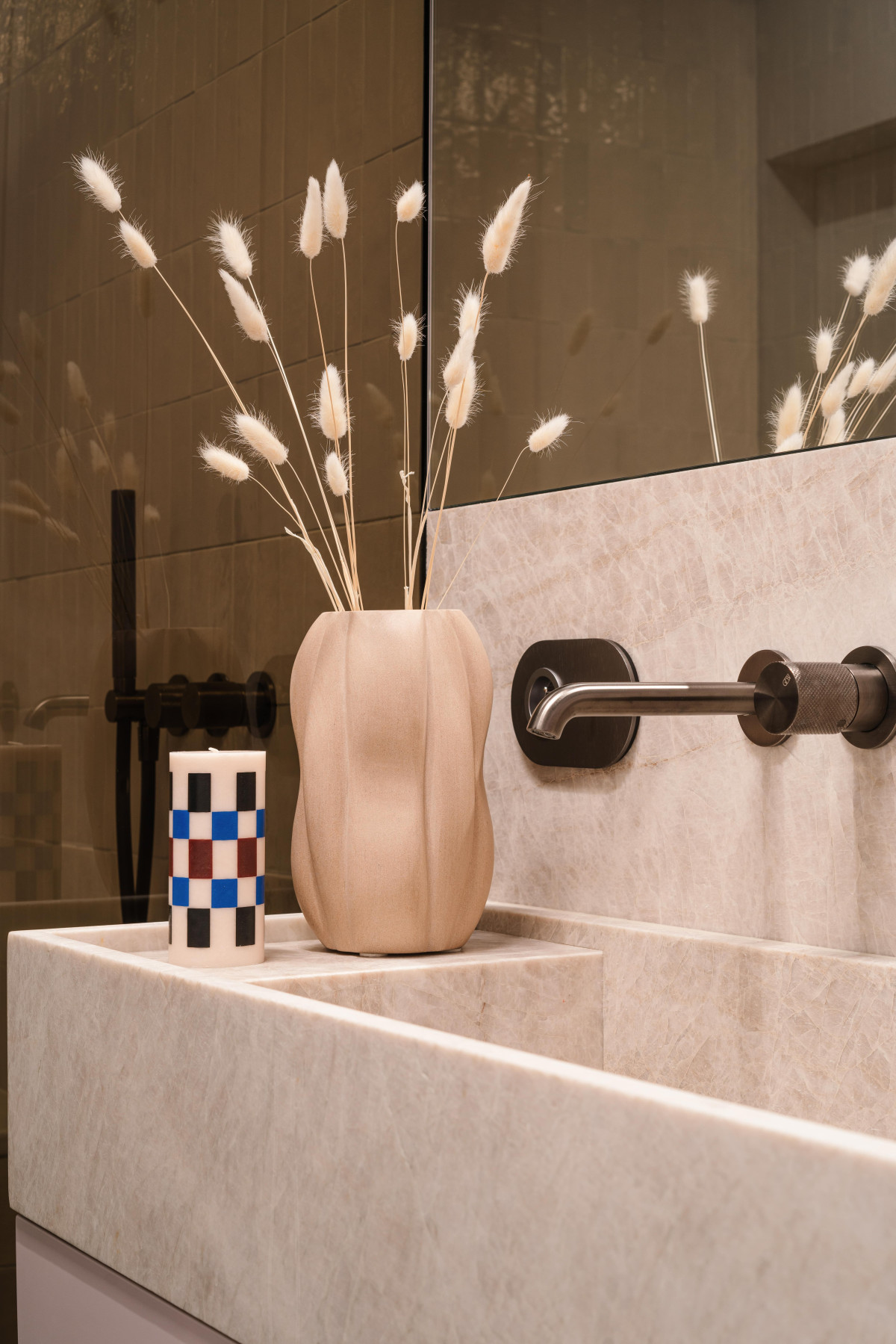 Łazienka została zaprojektowana jak prywatna strefa relaksu. Baza z błyszczących płytek o nieregularnej strukturze delikatnie odbija światło, tworząc subtelną grę faktur. Zestawienie jasnych powierzchni z grafitową armaturą, ciemnym gresem i dodatkami sprawia, że przestrzeń wydaje się zarazem szlachetna i graficzna. Luksusowy akcent wprowadza umywalka z bezowego kamienia. Z kolei minimalistyczna forma wanny i kabiny prysznicowej z przyciemnianego szkła sprzyja wyciszeniu, a w połączeniu z miękkim światłem tworzą nastrój domowego SPA.