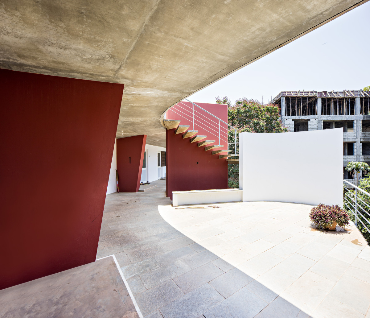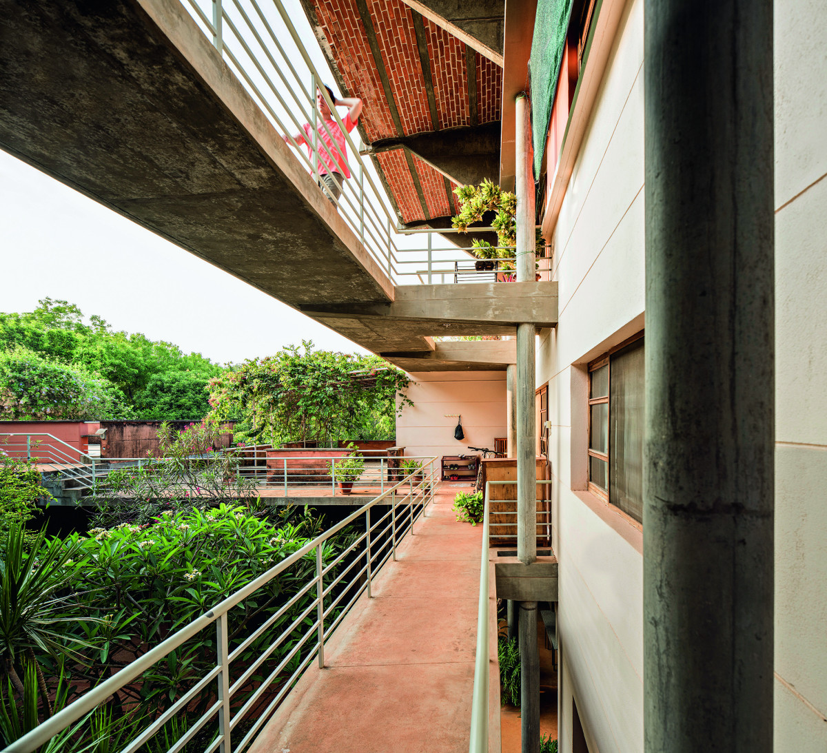 Schronisko młodzieżowe w Auroville (2006) z dużymi tarasami i balkonami na każdym piętrze. Zdjęcie: Javier Callejas
