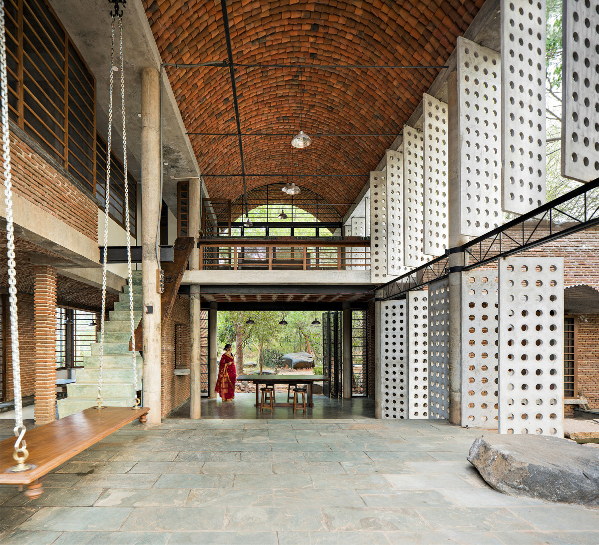 Przy okazji wykorzystała wyroby miejscowych garncarzy, które nie cieszyły się ponoć dużym wzięciem, i zaprosiła ich do współpracy przy wytwarzaniu specjalnych, walcowatych kształtek ceramicznych. Z nich z kolei powstały kolebkowe sklepienia nad głównymi przestrzeniami Wall House. Tu po raz pierwszy użyła też betonowych, prefabrykowanych żaluzji ze zbrojeniem z drucianej siatki i tradycyjnych, ręcznie robionych cegieł achakal, na które natknęła się podczas jednej ze swoich motocyklowych eskapad. Zdaniem Kundoo są one pod wieloma względami lepsze od tych standardowych. Do produkcji wykorzystuje się lokalną glinę, a do wypalania, zamiast węgla, gałązki i konary z pobliskich plantacji. Ponadto są cienkie i lekkie, więc wygodniejsze dla murarzy i łatwiejsze w obróbce. Budowane z nich ściany muszą być co prawda grubsze, ale to poprawia komfort klimatyczny we wnętrzu, bo mury magazynują ciepło za dnia i uwalniają je w nocy. Wreszcie są też po prostu piękne, nie potrzeba więc tynków ani żadnych innych materiałów wykończeniowych.