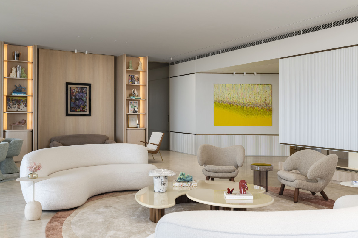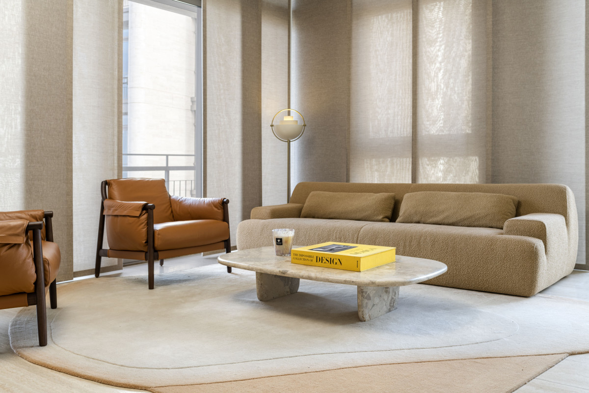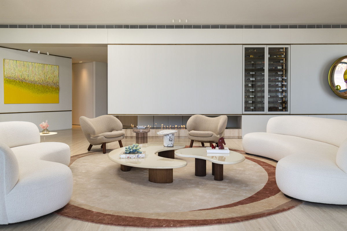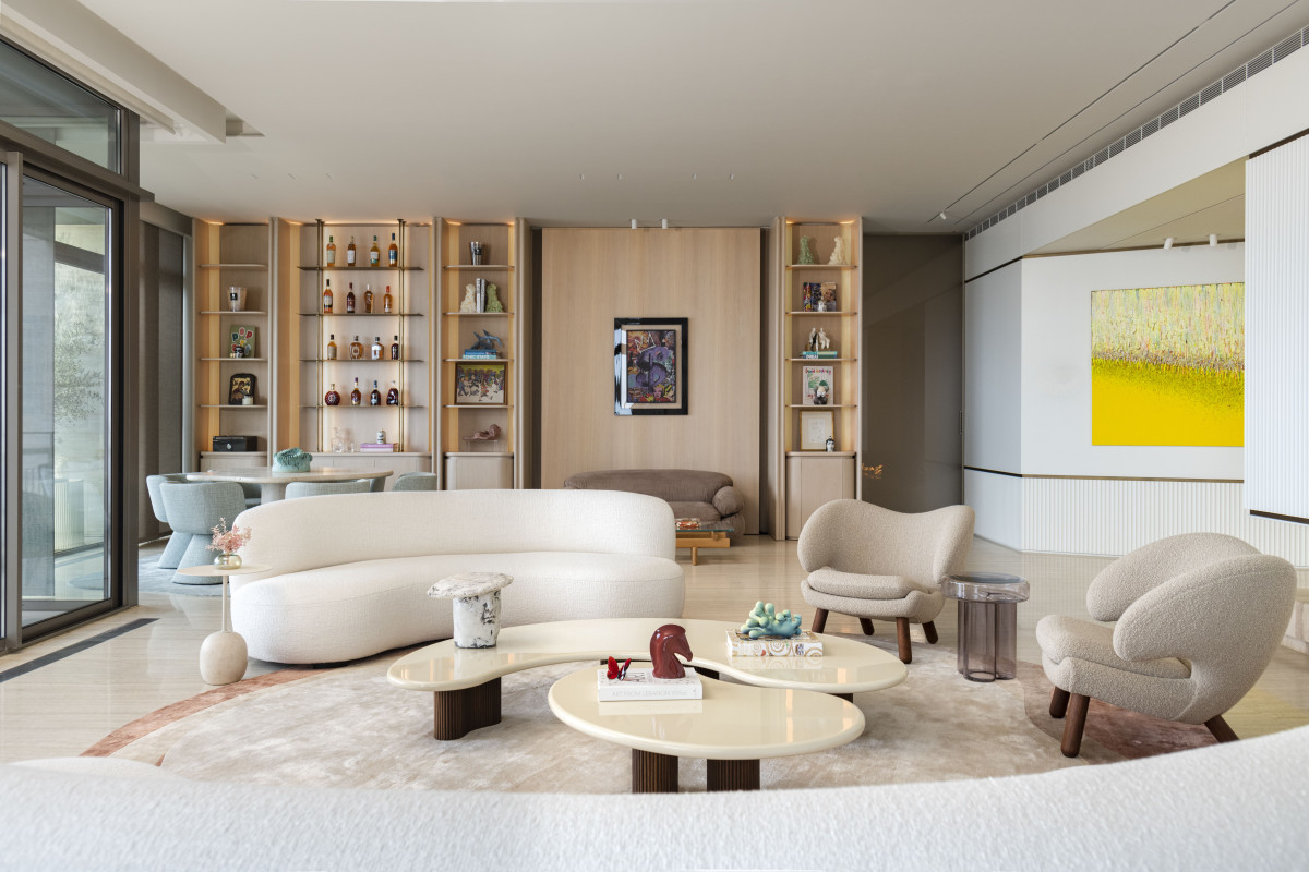 Na uwagę we wnętrzu zasługują też wyselekcjonowane elementy wyposażenia, w tym zaprojektowane specjalnie do tego wnętrza dywany o organicznych kształtach, stół jadalniany z marmuru Patagonia Glace, rzeźbiony stół wielofunkcyjny z trawertynu, fotele Pelican projektu Finna Juhla z połowy XX wieku, sofy Pierre Augustin Rose, kredens Editions Levantine oraz imponująca kolekcja sztuki z pracami takich artystów jak Kyung-ae Hur, Sara Lundkvist i Patrick Rubinstein.