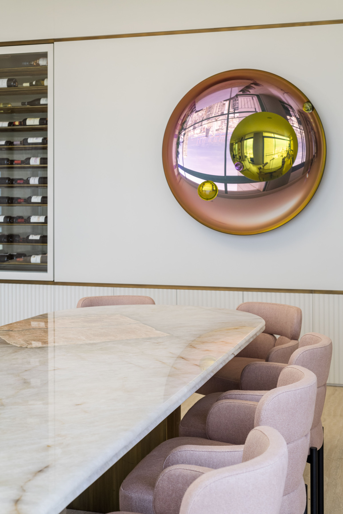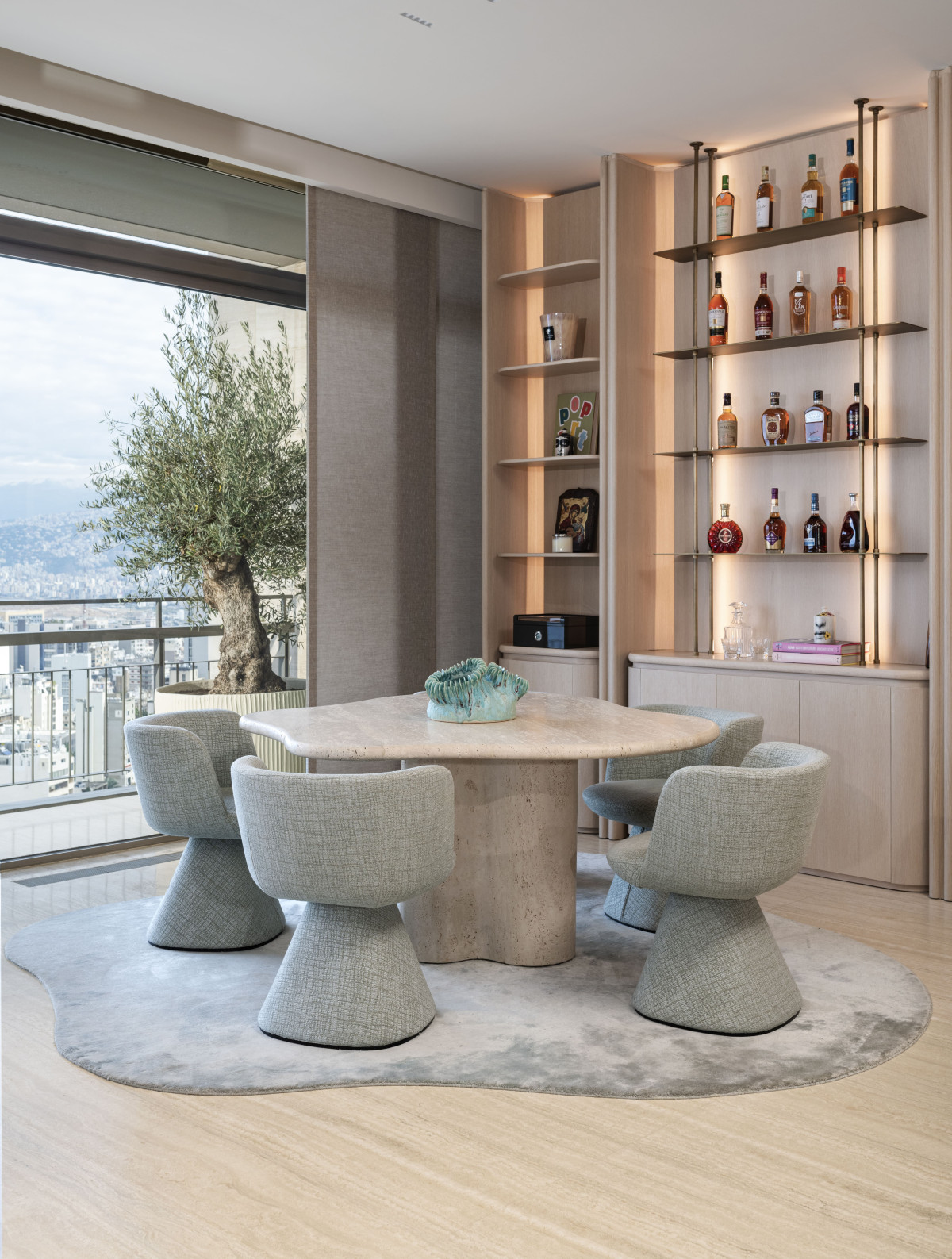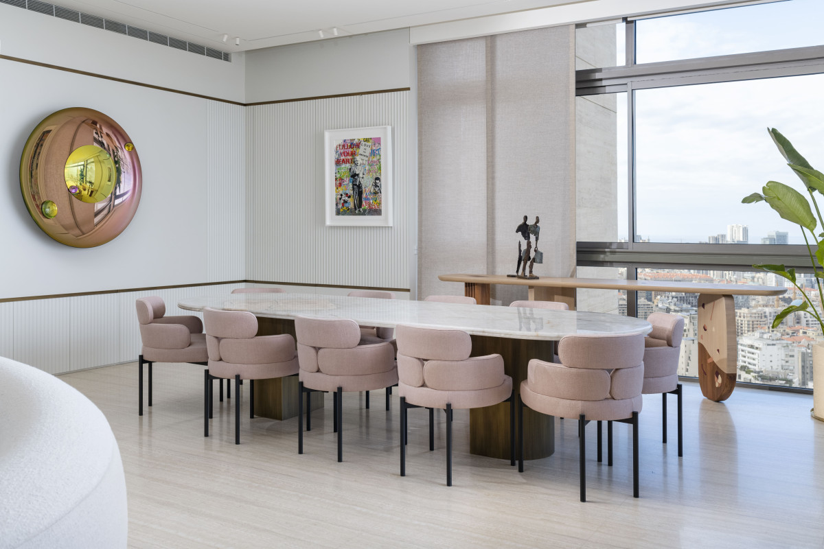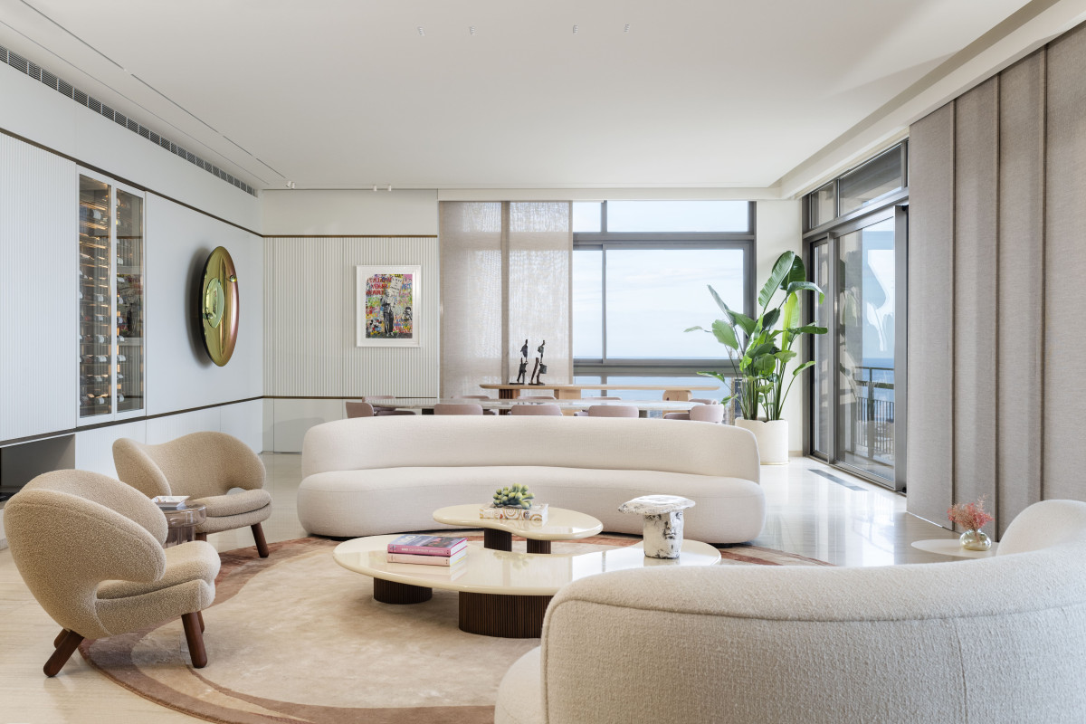 Na uwagę we wnętrzu zasługują też wyselekcjonowane elementy wyposażenia, w tym zaprojektowane specjalnie do tego wnętrza dywany o organicznych kształtach, stół jadalniany z marmuru Patagonia Glace, rzeźbiony stół wielofunkcyjny z trawertynu, fotele Pelican projektu Finna Juhla z połowy XX wieku, sofy Pierre Augustin Rose, kredens Editions Levantine oraz imponująca kolekcja sztuki z pracami takich artystów jak Kyung-ae Hur, Sara Lundkvist i Patrick Rubinstein.