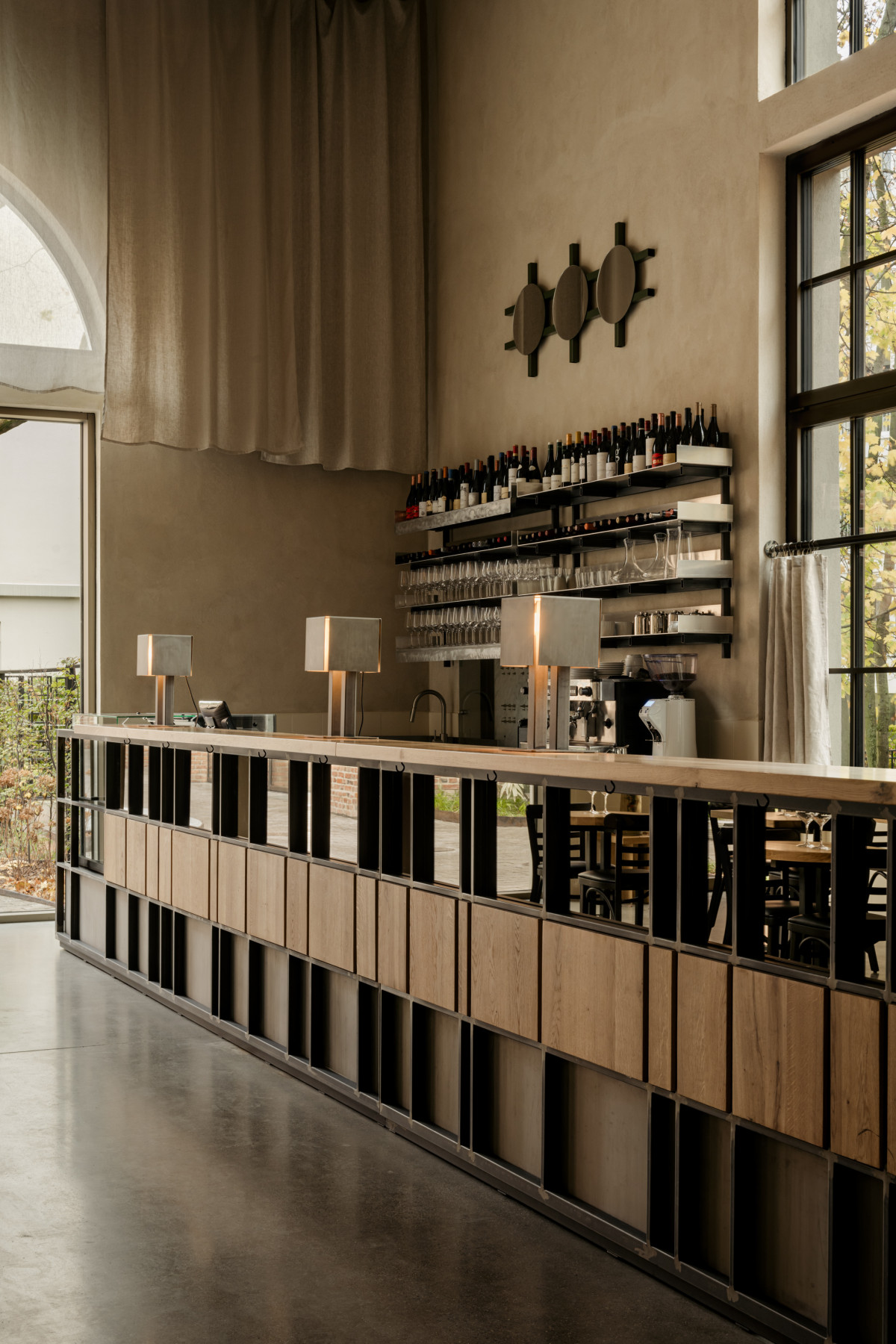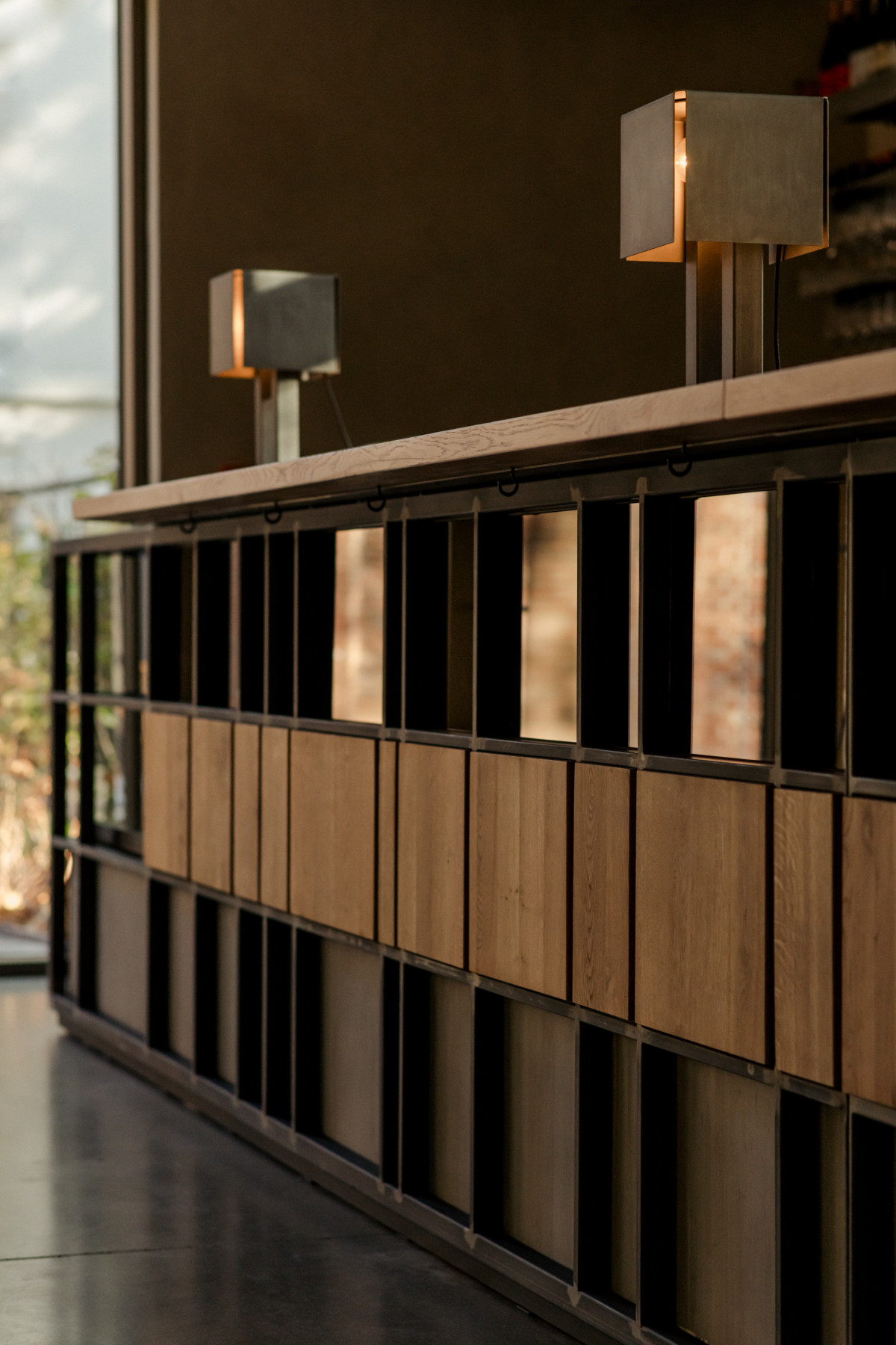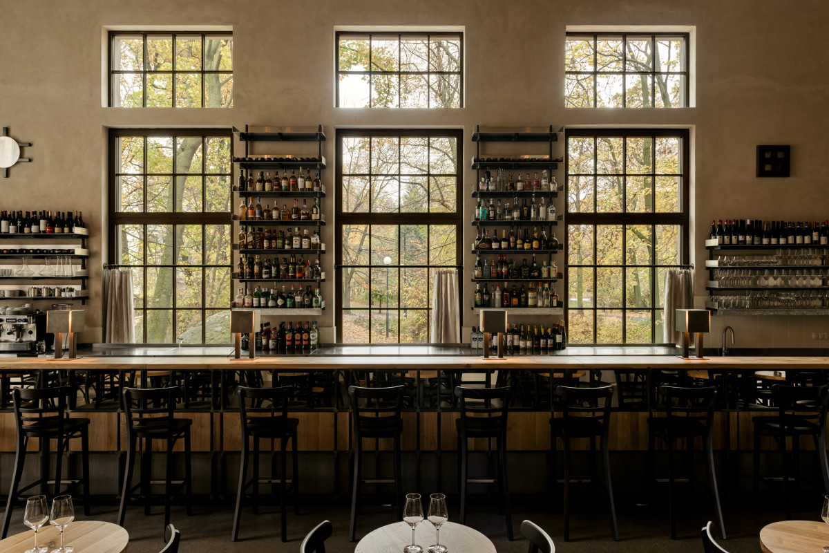 Najważniejszym, centralnym elementem przestrzeni jest 13-metrowy bar, ręcznie wykonany z surowej stali, litego dębu i brązowych luster. Ustawiono go wzdłuż pomieszczenia, aby goście mogli korzystać z widoku na park. Nieregularne podziały konstrukcji, stanowiące jednocześnie dekoracyjny front, nawiązują do szprosów okien kadrujących perspektywę za szybami.