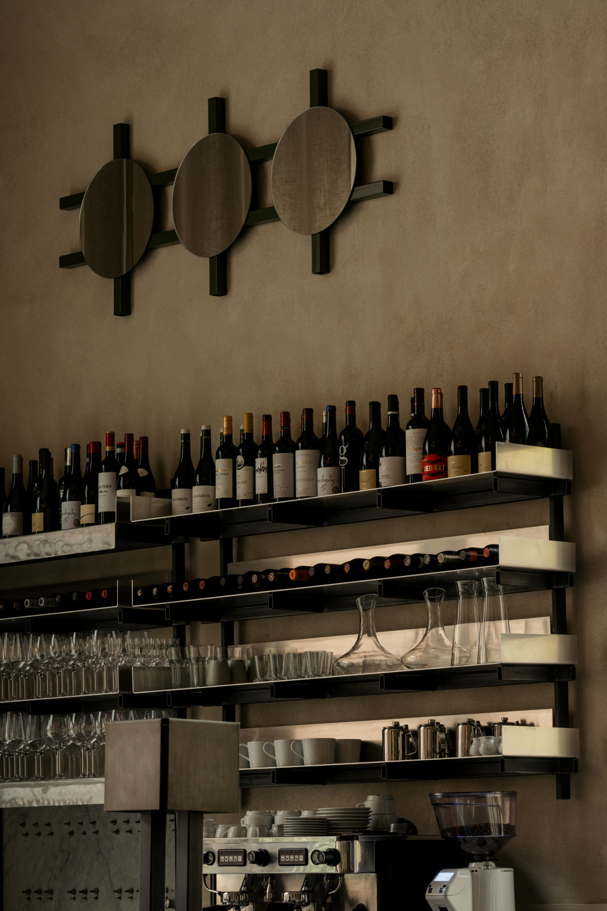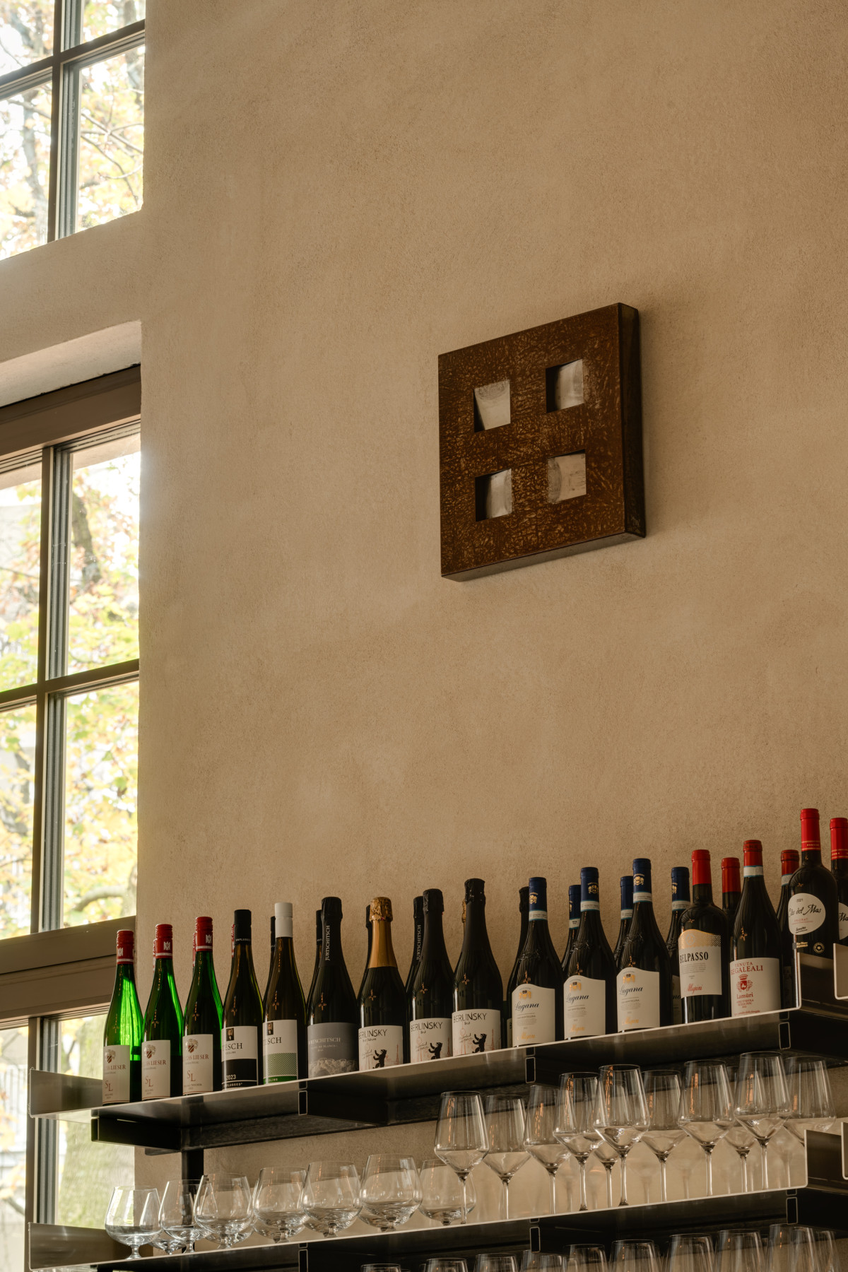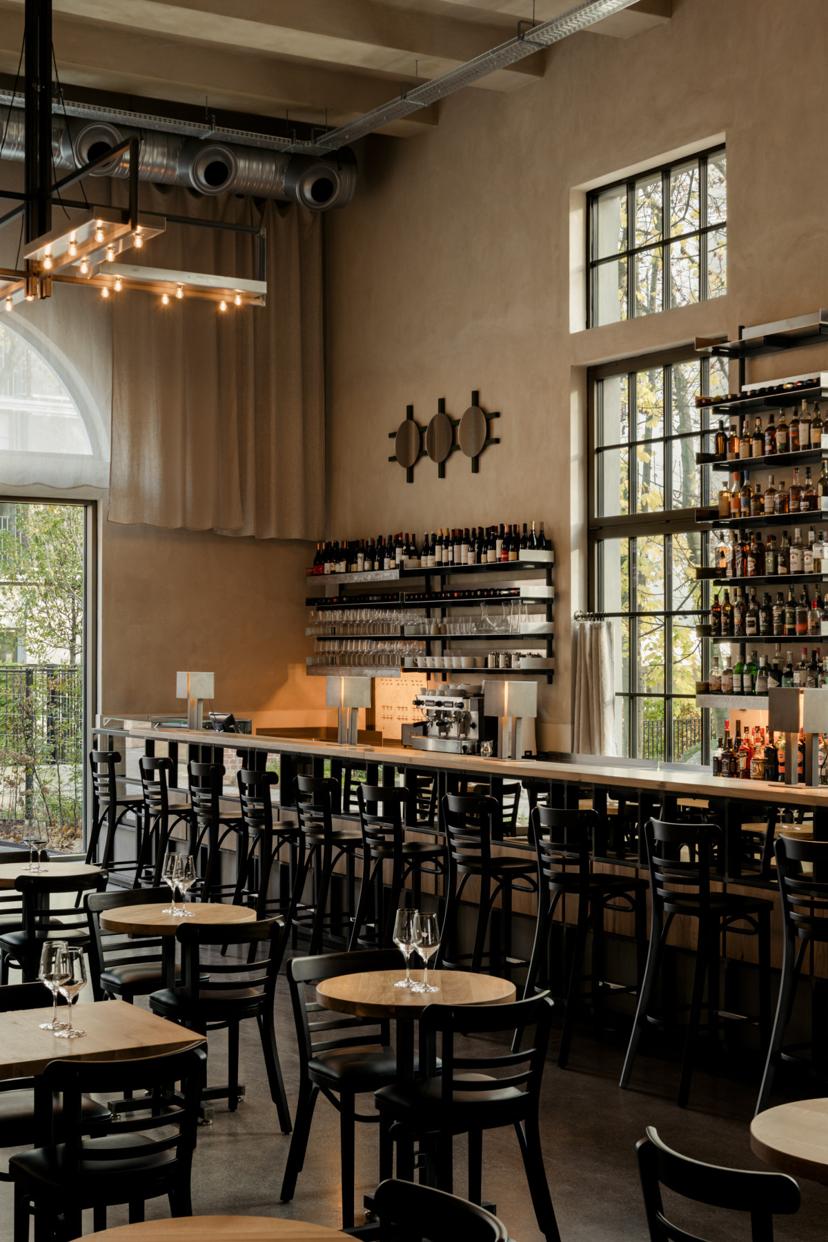 Najważniejszym, centralnym elementem przestrzeni jest 13-metrowy bar, ręcznie wykonany z surowej stali, litego dębu i brązowych luster. Ustawiono go wzdłuż pomieszczenia, aby goście mogli korzystać z widoku na park. Nieregularne podziały konstrukcji, stanowiące jednocześnie dekoracyjny front, nawiązują do szprosów okien kadrujących perspektywę za szybami.