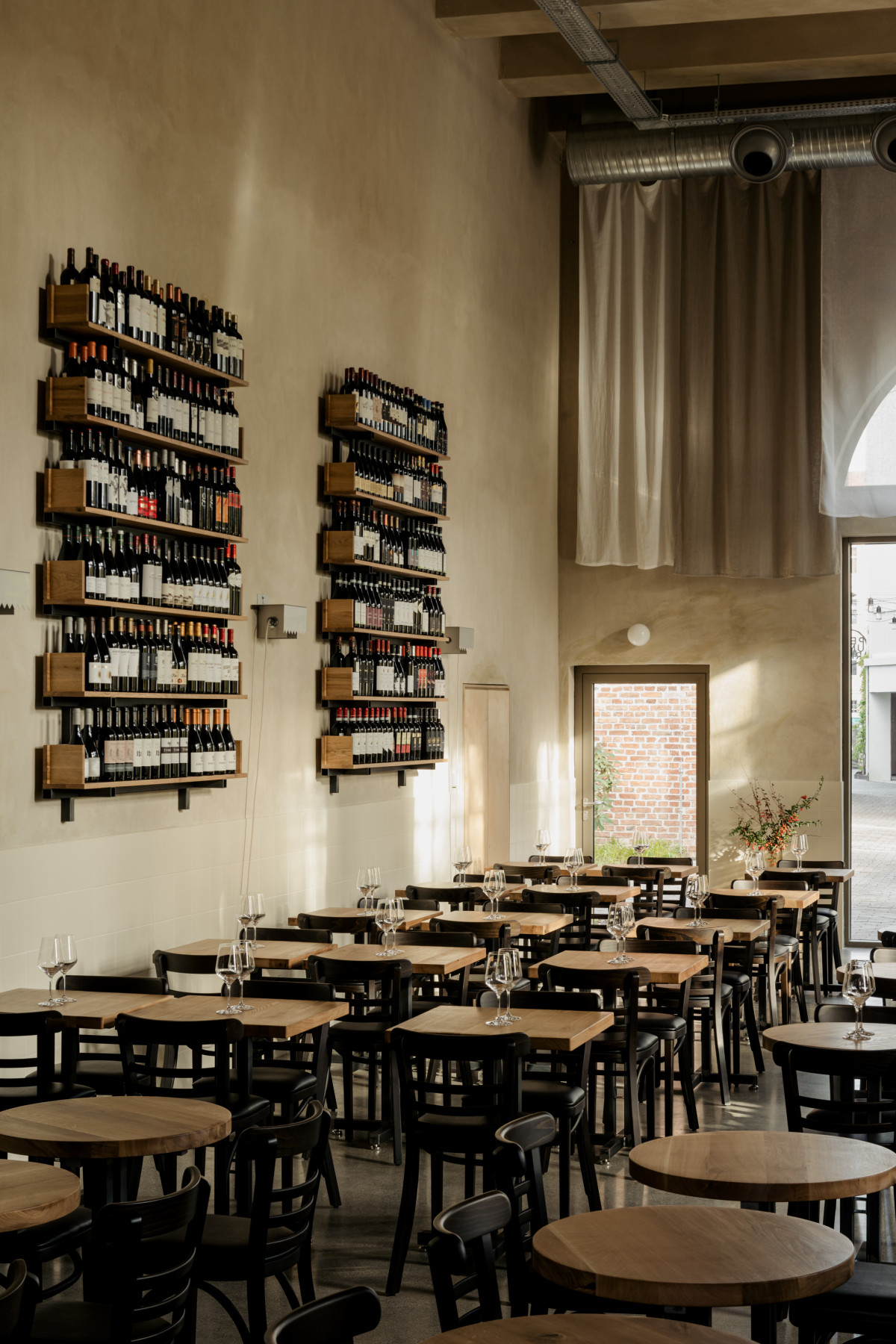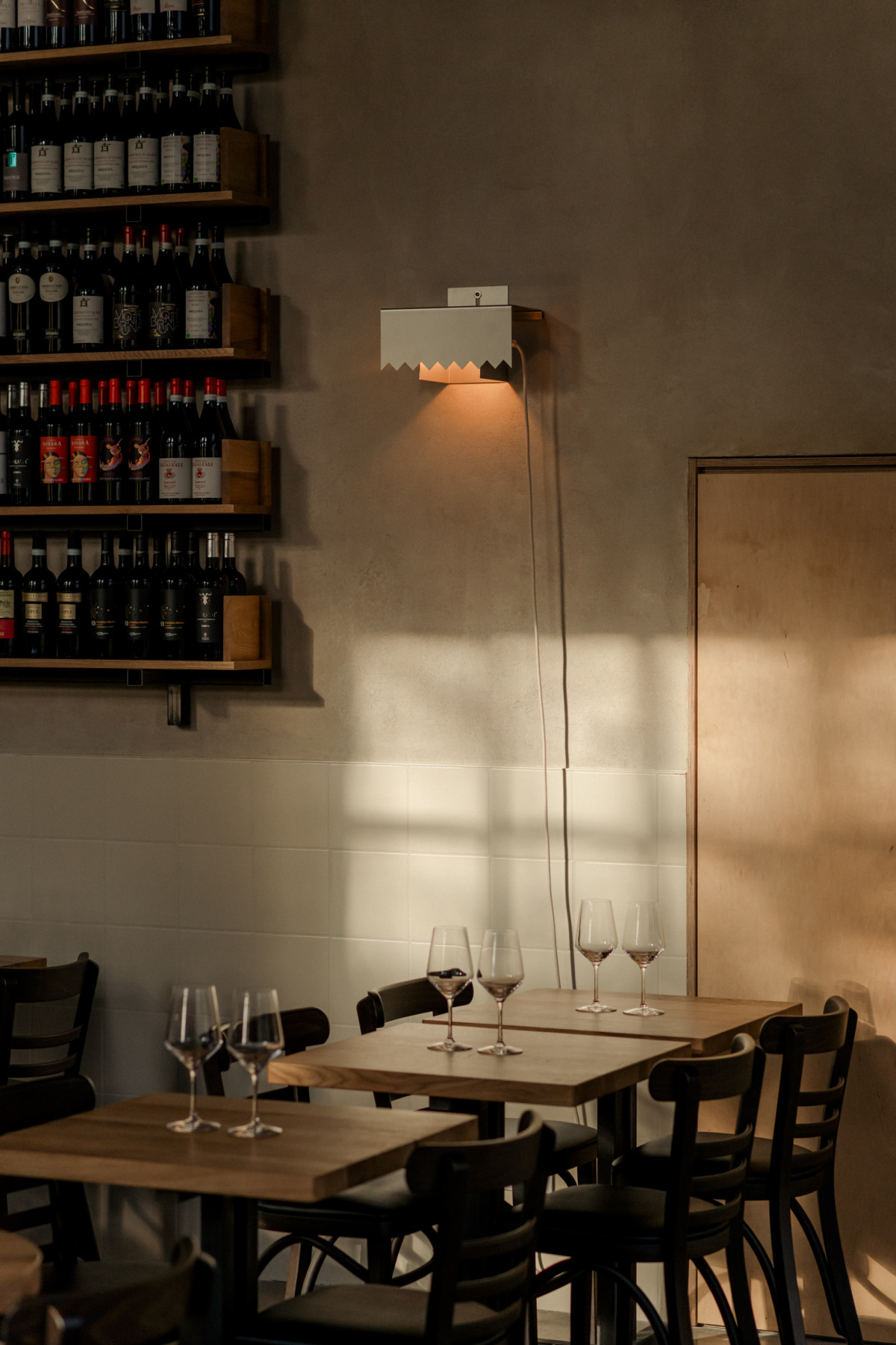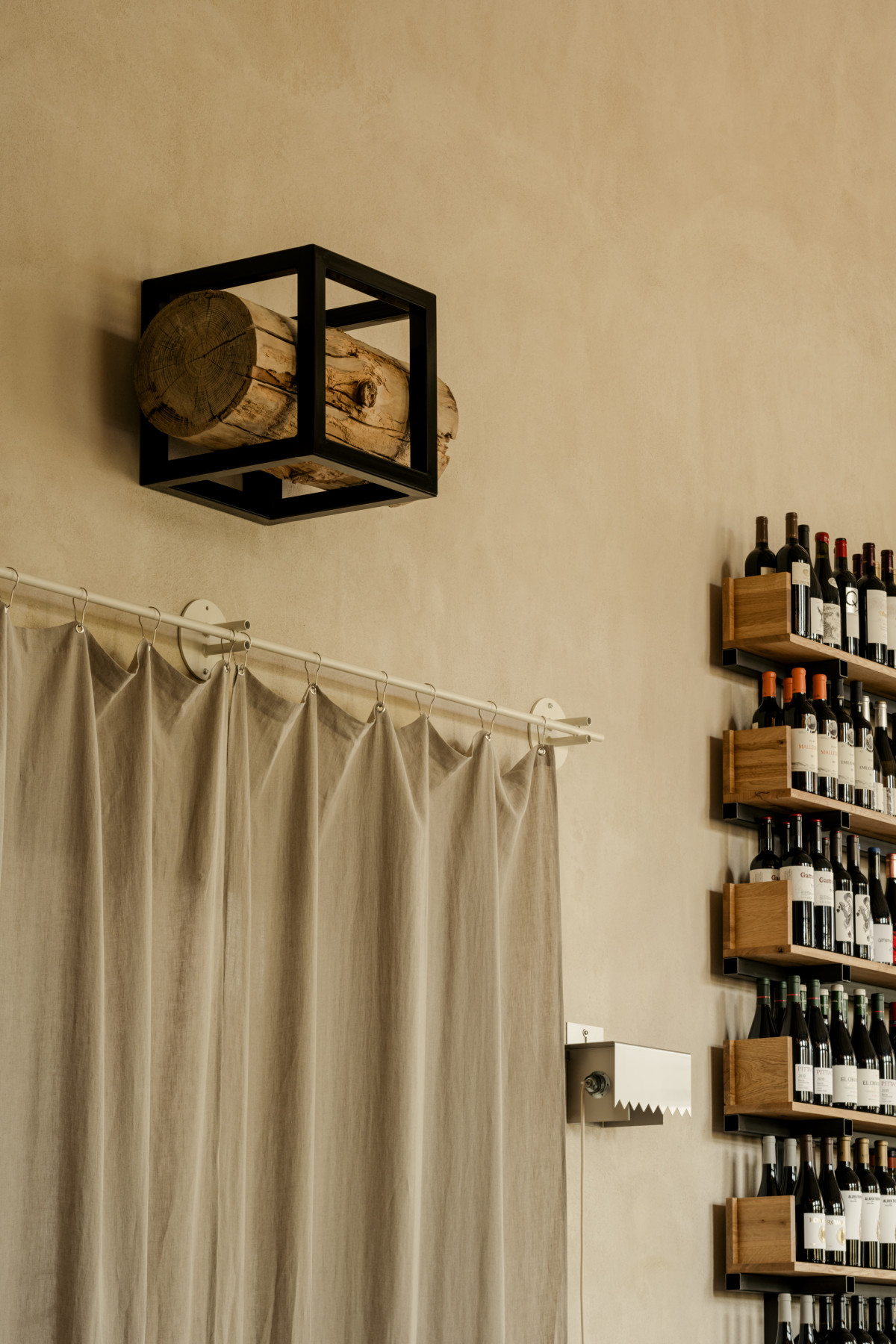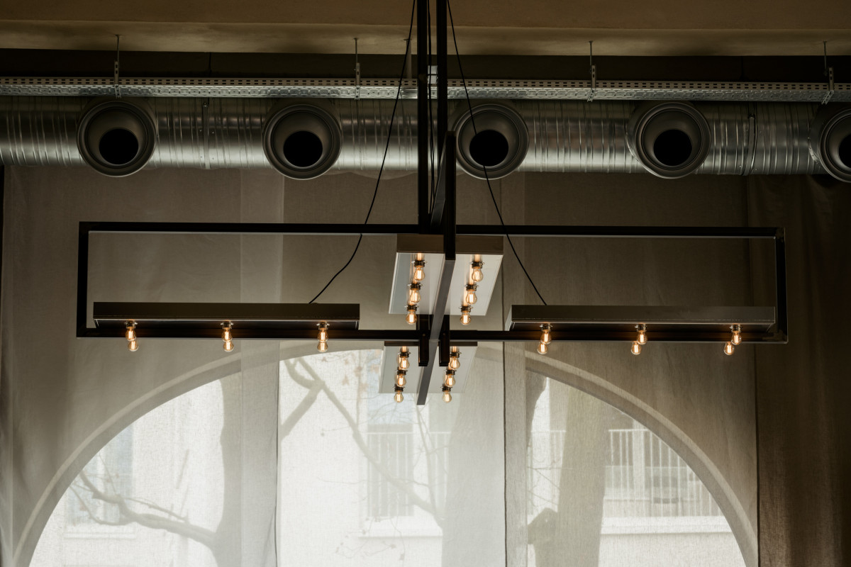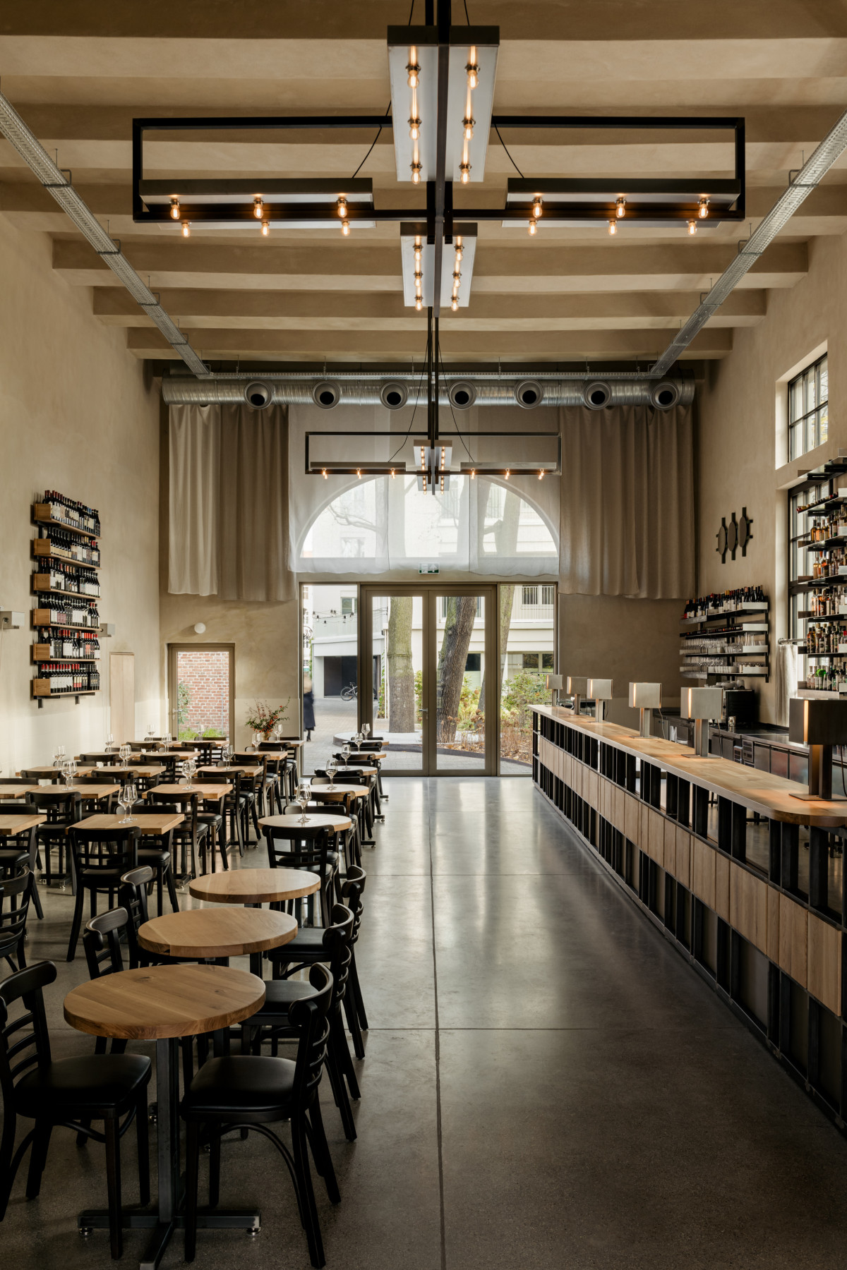 Wykorzystując 6-metrową wysokość sali, na suficie zawieszono dwa zaprojektowane geometryczne żyrandole o trzymetrowych ramionach. Każdy posiada po 24 ściemnialne żarówki, które odbijają się i mienią w tacach z surowego aluminium. Stalowe lampy stołowe ustawione na barze oraz kinkiety ze stali nierdzewnej to autorskie obiekty z kolekcji wiercinski-objects. Oświetlenie we wnętrzu jest ciepłe i przytłumione, w połączeniu ze świecami tworzy wieczorem wyjątkowo nastrojową atmosferę. Surowe, chropowate ściany kontrastują z instalacją tkanin z polskiego lnu w różnych odcieniach i splotach, która zmiękcza geometryczny sufit i dodaje wnętrzu lekko teatralny charakter.
