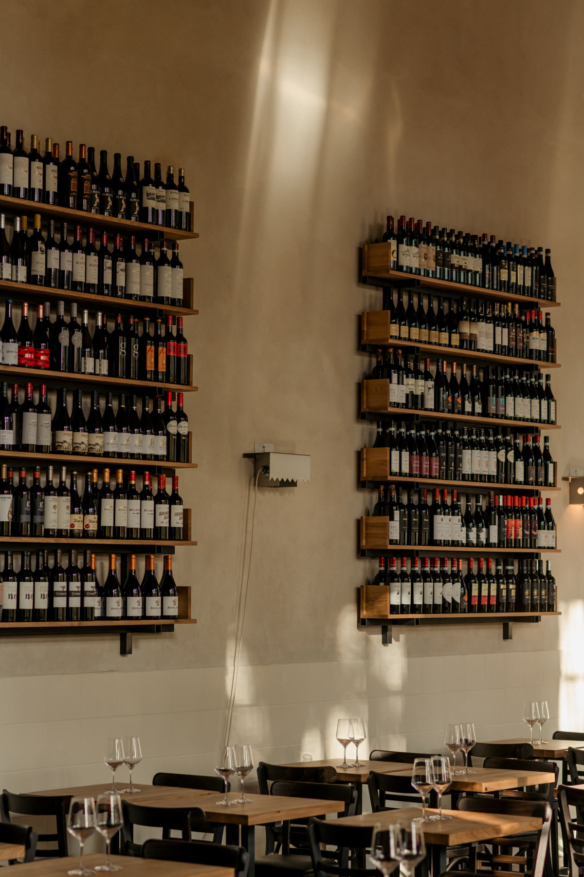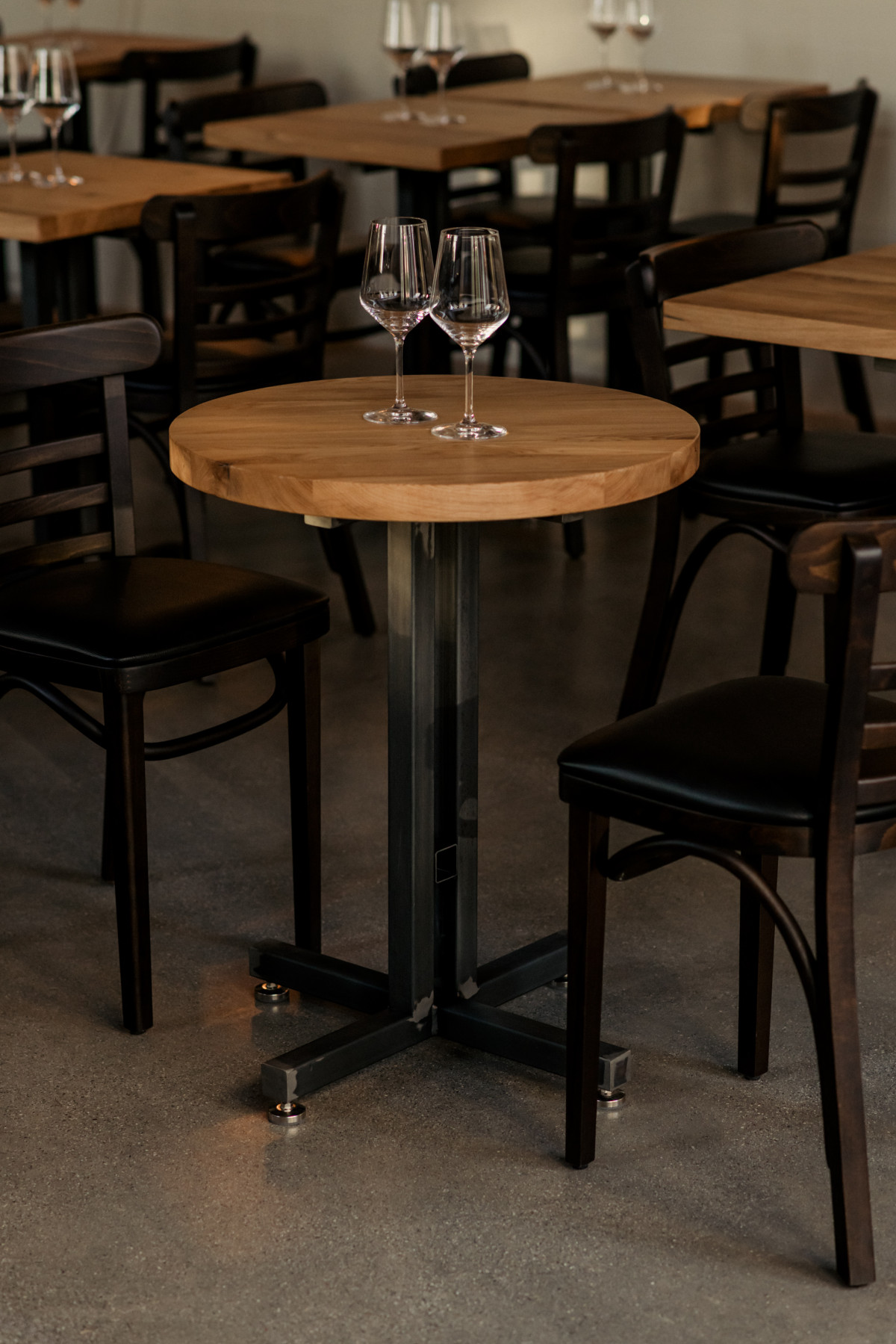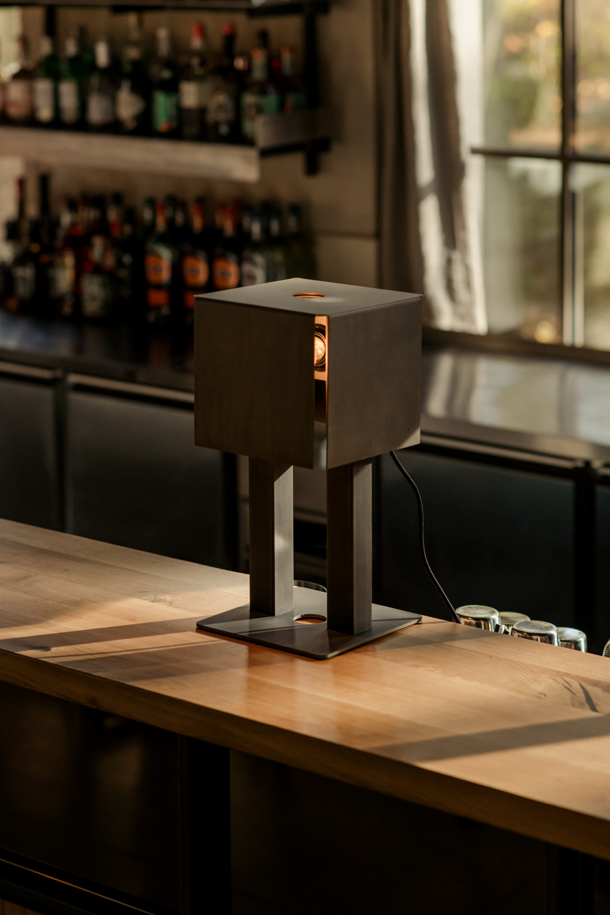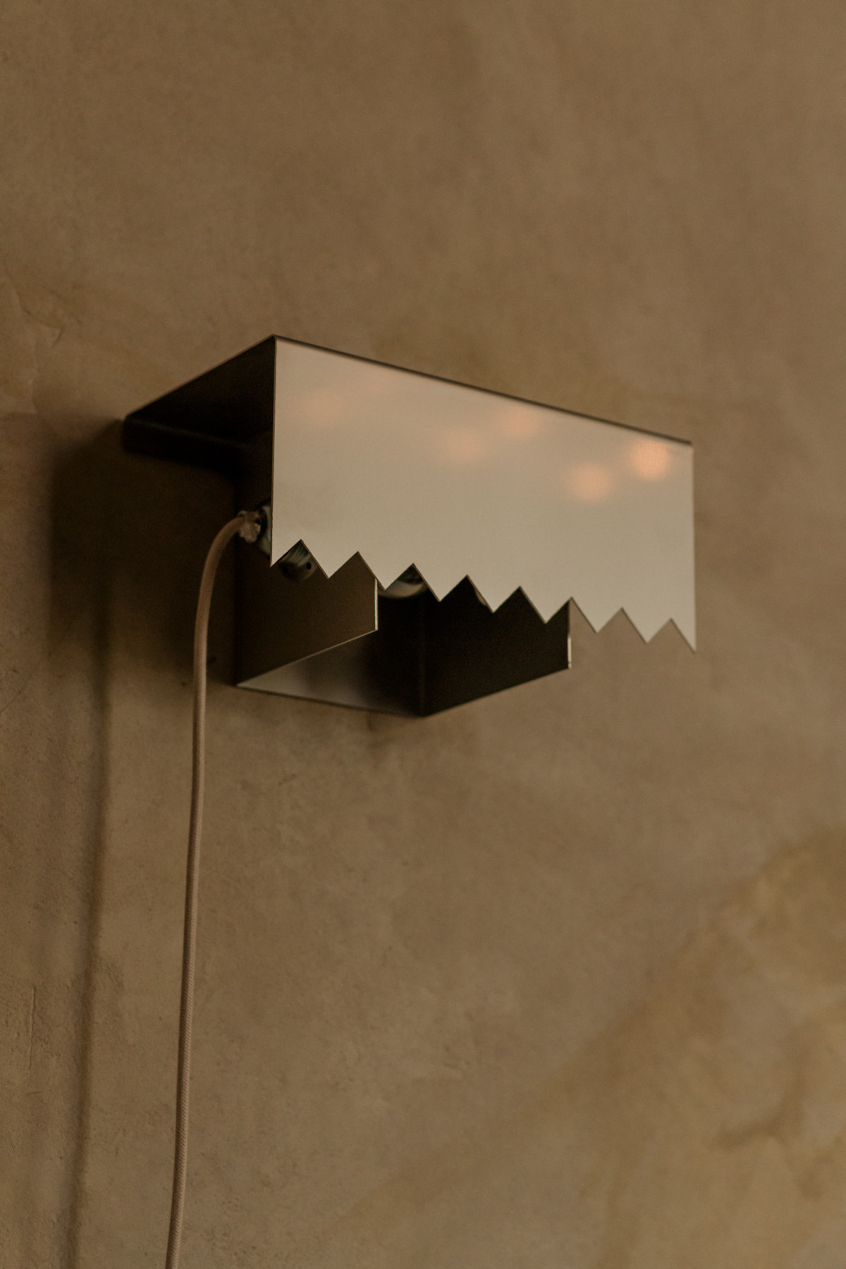 Wykorzystując 6-metrową wysokość sali, na suficie zawieszono dwa zaprojektowane geometryczne żyrandole o trzymetrowych ramionach. Każdy posiada po 24 ściemnialne żarówki, które odbijają się i mienią w tacach z surowego aluminium. Stalowe lampy stołowe ustawione na barze oraz kinkiety ze stali nierdzewnej to autorskie obiekty z kolekcji wiercinski-objects. Oświetlenie we wnętrzu jest ciepłe i przytłumione, w połączeniu ze świecami tworzy wieczorem wyjątkowo nastrojową atmosferę. Surowe, chropowate ściany kontrastują z instalacją tkanin z polskiego lnu w różnych odcieniach i splotach, która zmiękcza geometryczny sufit i dodaje wnętrzu lekko teatralny charakter.