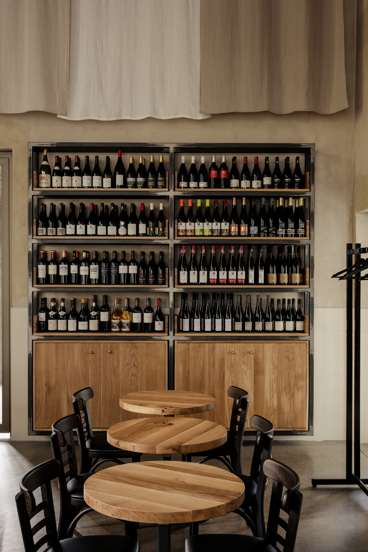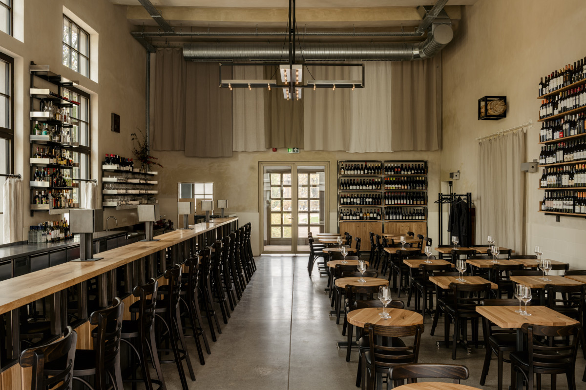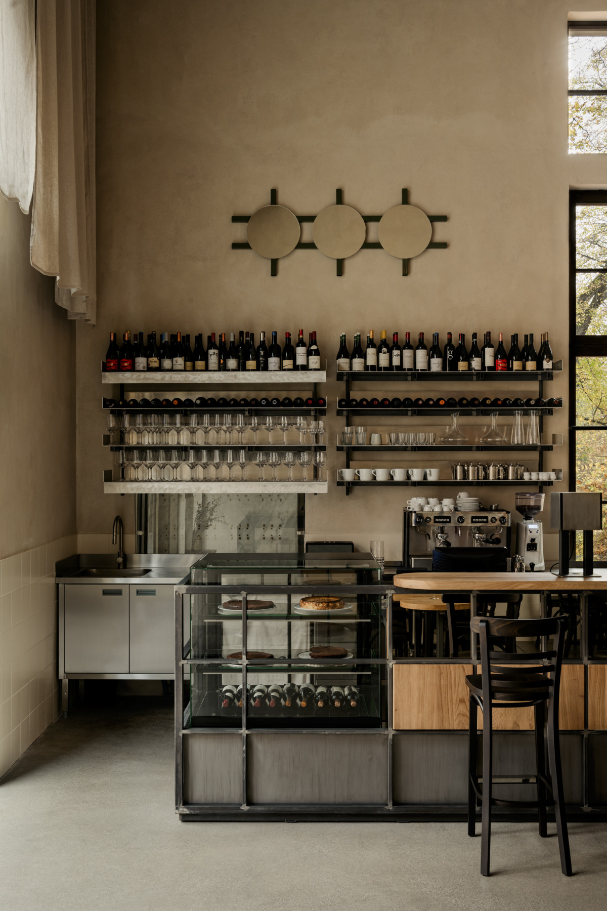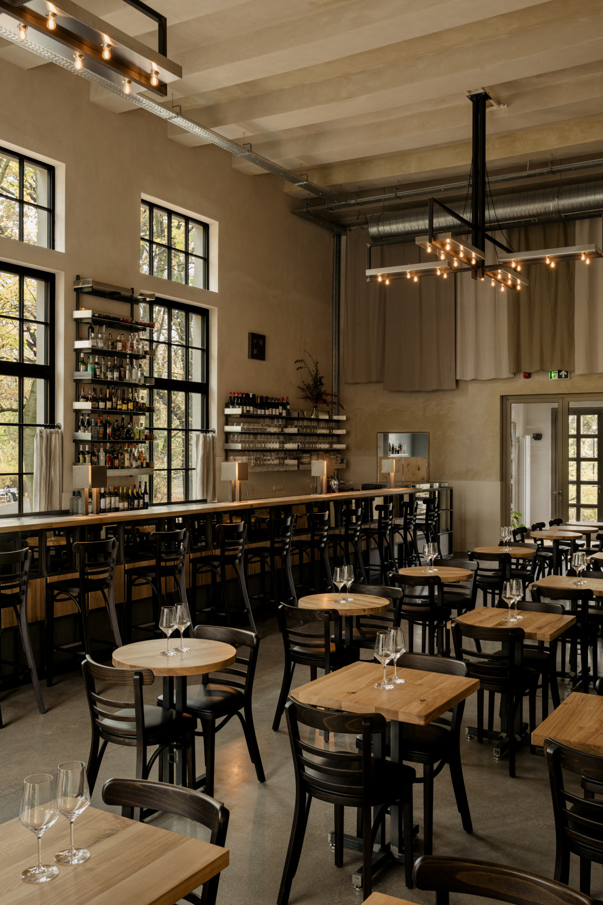 Wnętrze wypełnia seria ręcznie wykonanych, autorskich mebli i detali w charakterystycznym stylu wiercinski-studio, opartym na zestawieniu surowych stalowych profili z litym dębem. Na wyposażenie składają się między innymi bar, regały, stoły, lampy, detale ścienne, czy nawet karnisze. Wszystkie te elementy nadają przestrzeni unikatowy, a zarazem spójny charakter. Odwołując się do historii budynku, jedynie klasyczne krzesła i stołki barowe wybrano z katalogu, ich wzory pojawiały się na fotografiach stuletnich restauracji. Projekt opiera się na wykorzystaniu czterech materiałów w ich naturalnych kolorach: surowej stali, litego dębu, aluminium i naturalnego lnu. Ograniczenie palety oraz połączenie ciepłych i chłodnych tonów podkreślają szczerość wyposażenia i akcentują brutalistyczne tło sali oraz widok parku za oknami.