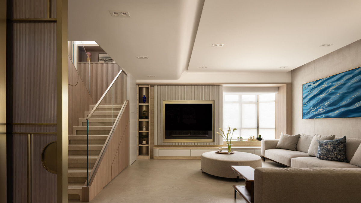 By osiągnąć taki efekt, projektant zrezygnował z krzykliwych kolorów na rzecz stonowanej palety kolorystycznej z przewagą ciepłych odcieni beżu, taupe, szarości i delikatnych brązów. We wnętrzach zastosował również farbę strukturalną, która łapie zmieniające się światło, nadając ścianom rzeźbiarskiego charakteru.