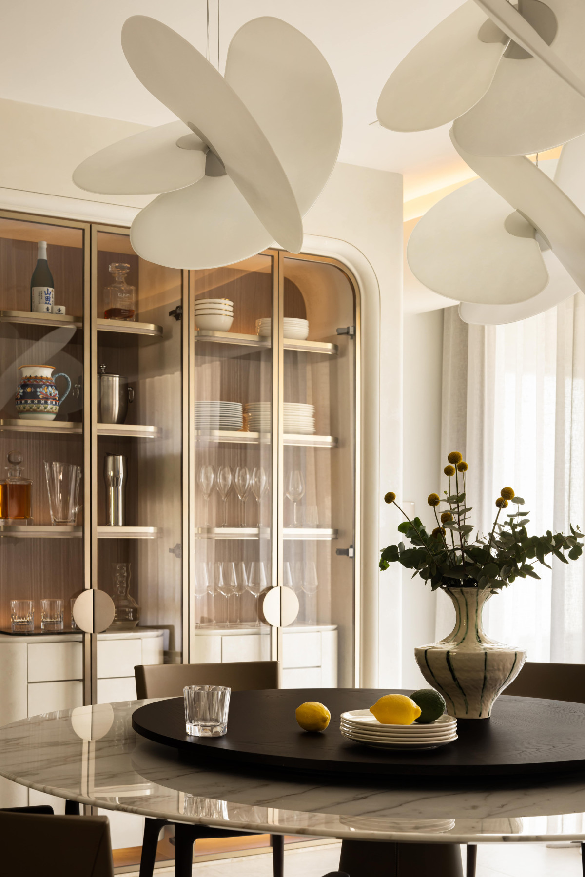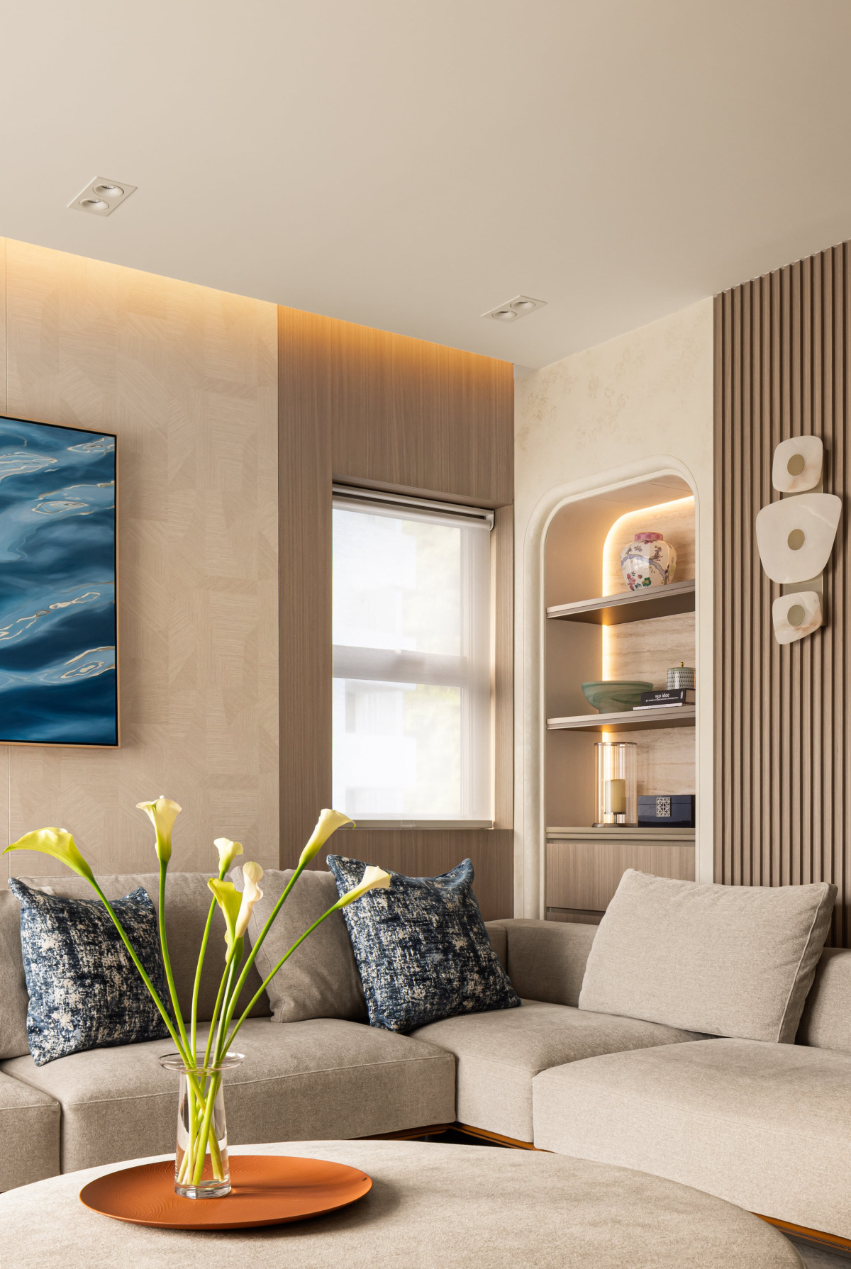 W mieszkaniu pojawiły się zaoblenia, miękkie linie i łuki w miejsce ostrych, kanciastych krawędzi i kształtów, co jeszcze bardziej podkreśliło kojący charakter przestrzeni. Jeśli chodzi o materiały, projektant postawił przede wszystkim na naturalne drewno i kamień, ale nie tylko. Ciekawym rozwiązaniem było zastosowanie folii imitującej drewno, którą pokryto meble i panele ścienne. Rzeźbiarski charakter aranżacji podkreślają też liczne ryflowania, które pojawiają się w różnych częściach mieszkania.