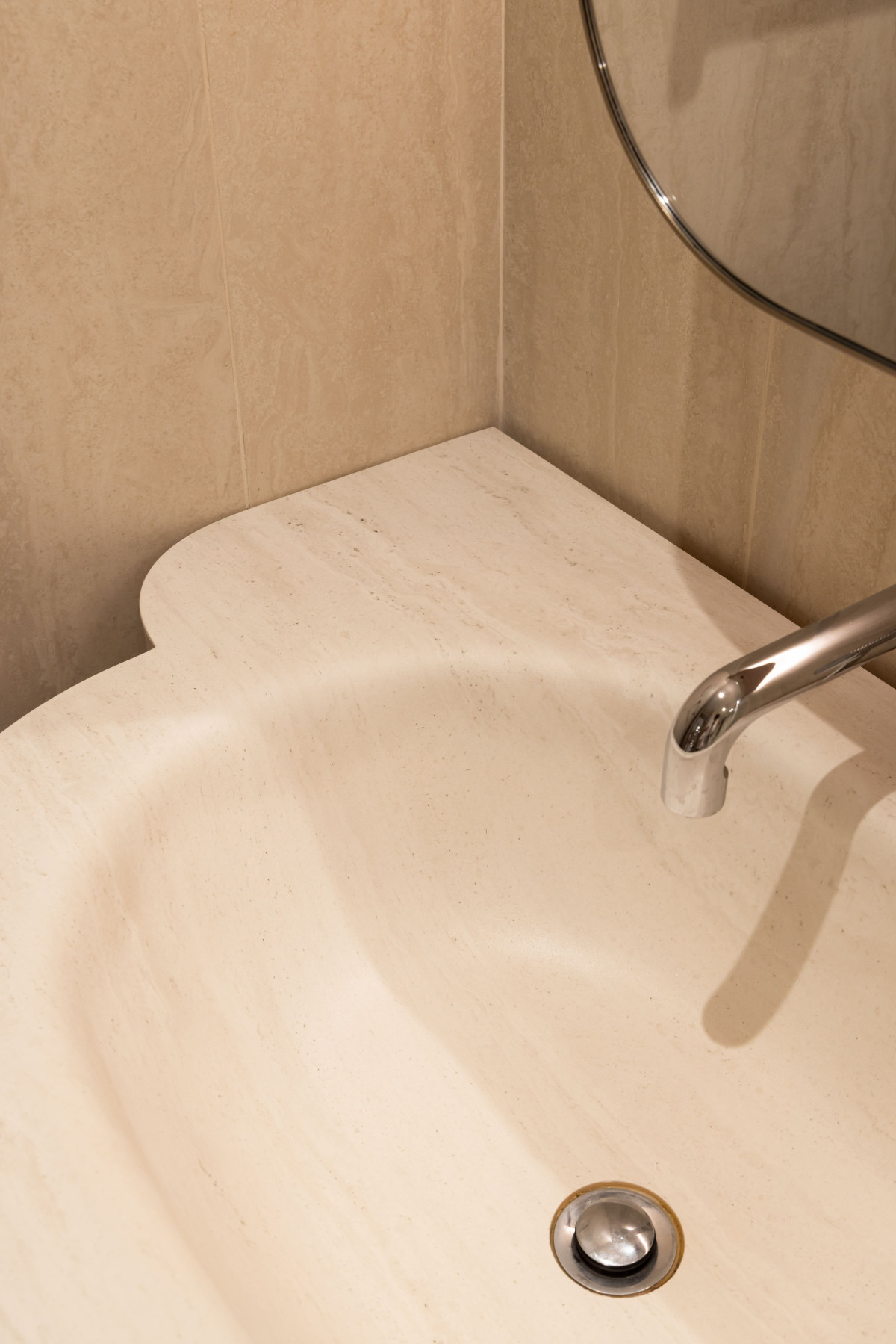 Kamień w postaci luksusowego marmuru i trawertynu zdobi natomiast łazienkę i kuchnię. Umywalka w łazience wykonana z jasnego trawertynu dobrze komponuje się z beżowymi płytami na ścianie. Z kolei wyspa kuchenna oraz wiszące płytki z eleganckiego marmuru tworzy zgrany duet z drewnianą zabudową.