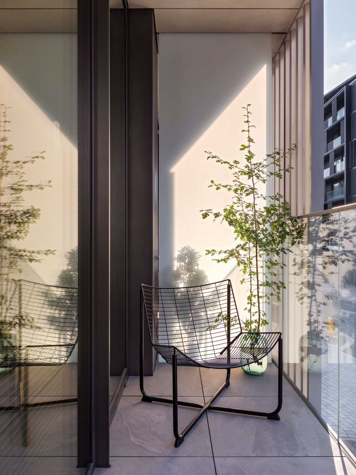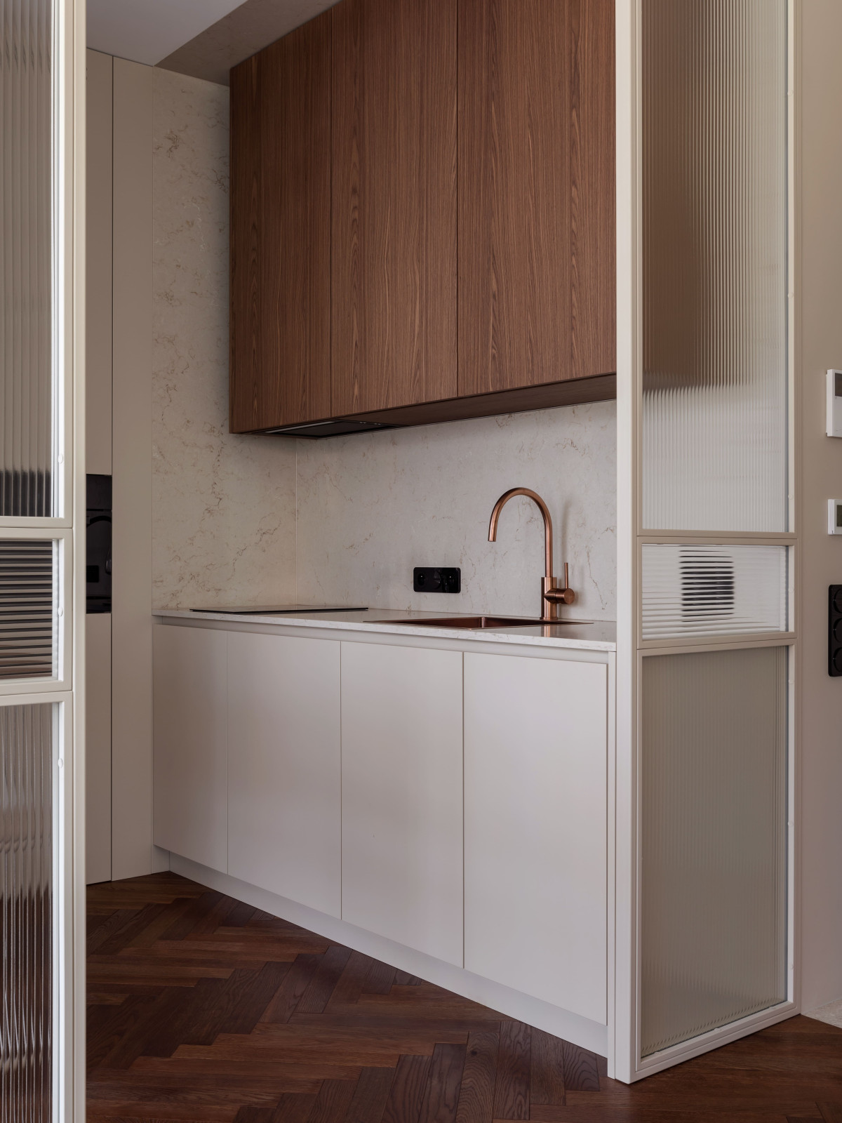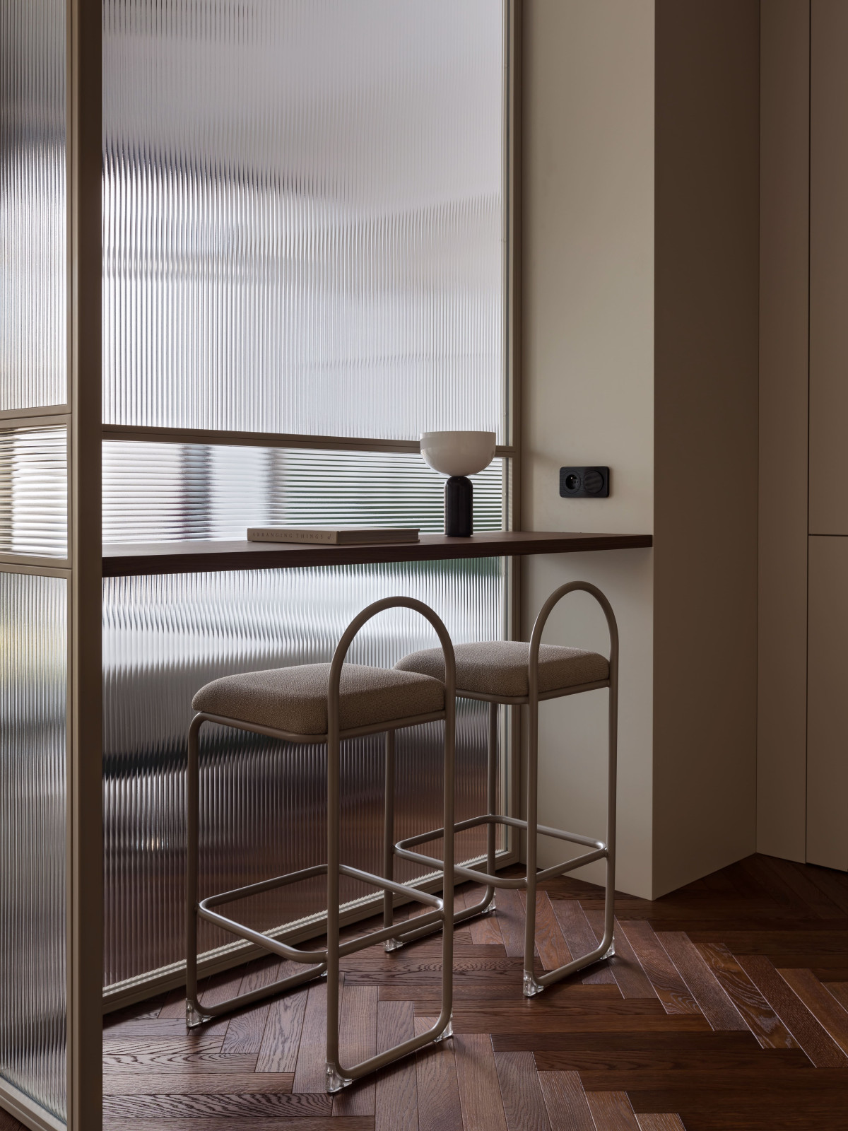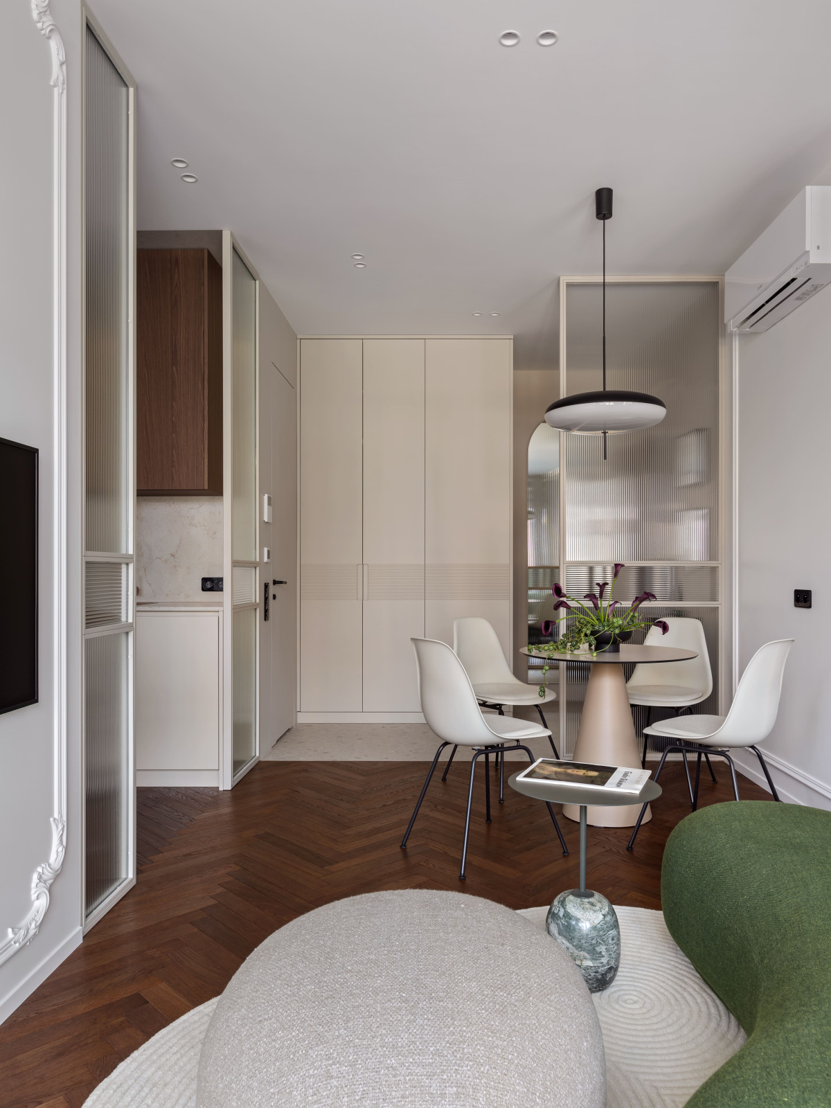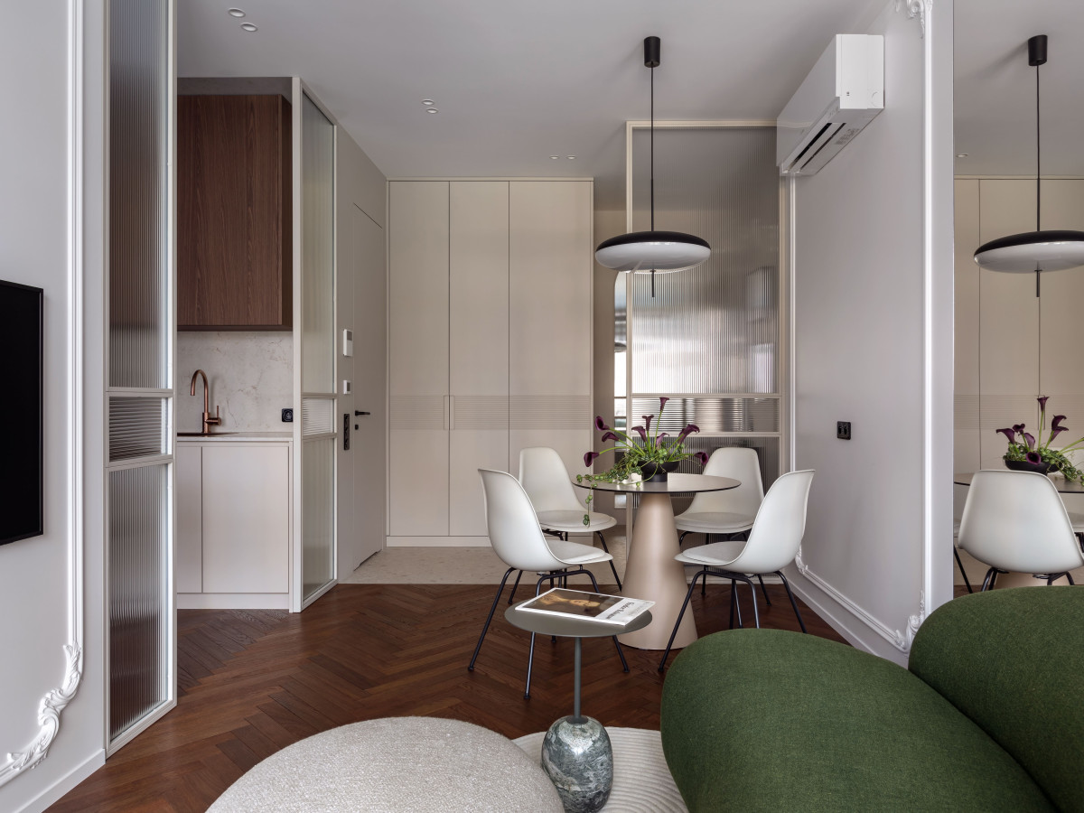 MIRRO STUDIO podjęło wyzwanie, kształtując strukturę mieszkania wokół światła i perspektywy. Zrezygnowali z pełnych ścian, zastosowali ryflowane przeszklenia i lustrzaną ścianę, która podwaja głębię i potęguje światło. W efekcie wnętrze stało się otwarte i płynne – wzrok swobodnie przemieszcza się od strefy wejściowej aż po sypialnię, napotykając jedynie lekkie przeszklenia, które wydzielają funkcje, ale nie dzielą przestrzeni ani jej nie przytłaczają. Zamiast tego przepuszczają światło i zasłaniają to, co zbędne.