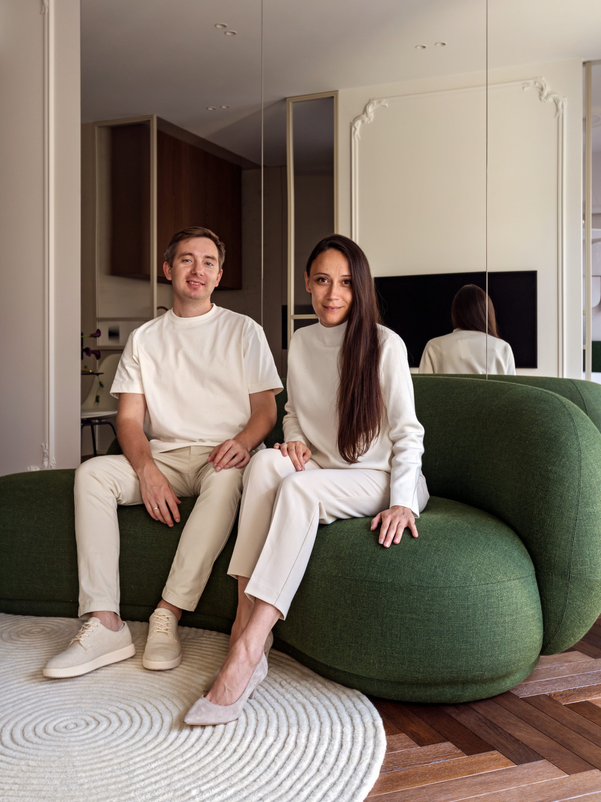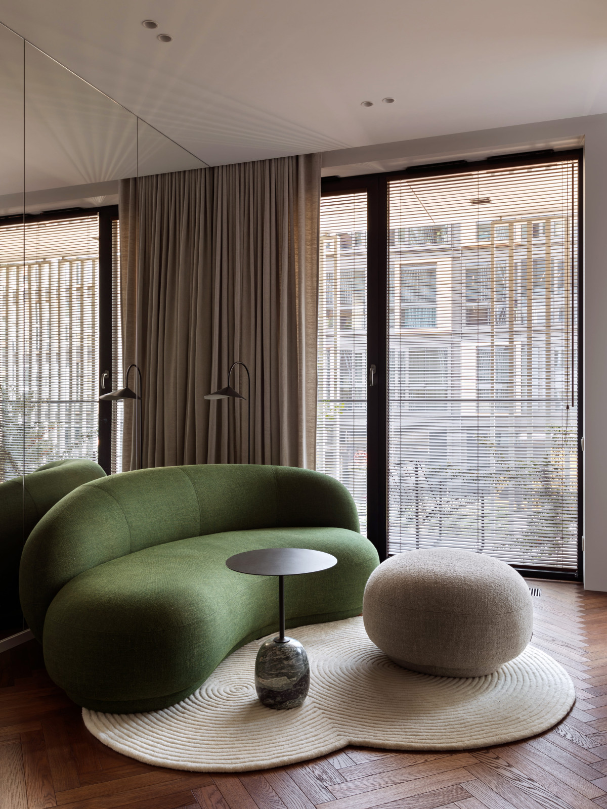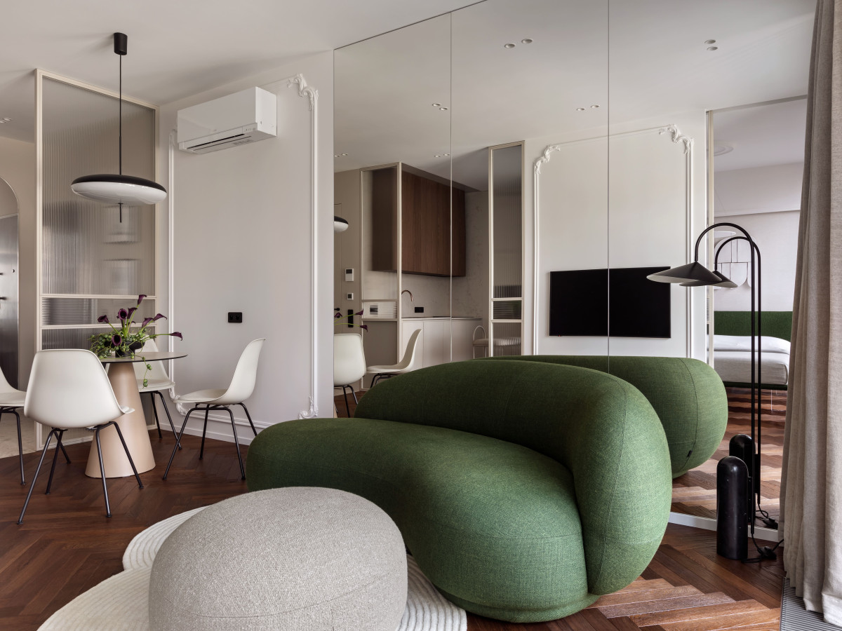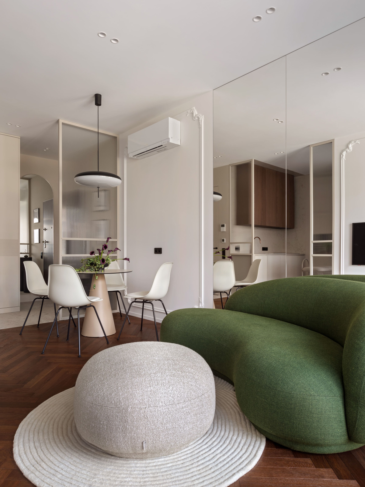 Salon jest jasny i miękki w formie. Zielona, owalna sofa z pufem tworzy centrum kompozycji, którą domyka dywan o fakturalnym wzorze, nawiązującym do rytmu szklanych podziałów. Za sofą znajduje się lustrzana ściana — pogłębiająca przestrzeń i wzmacniająca światło. Z tej perspektywy otwiera się kolejna oś widokowa, prowadząca wzrok do delikatnej, szklanej nogi łóżka w sypialni.