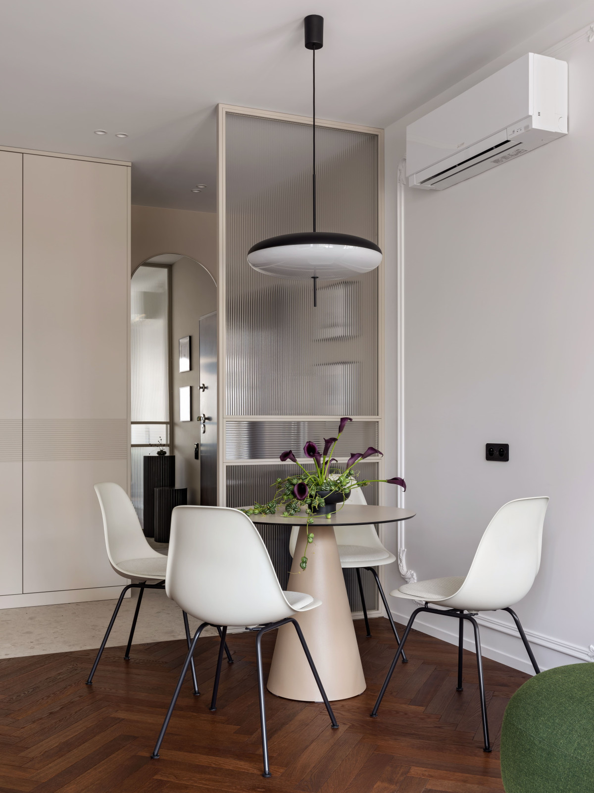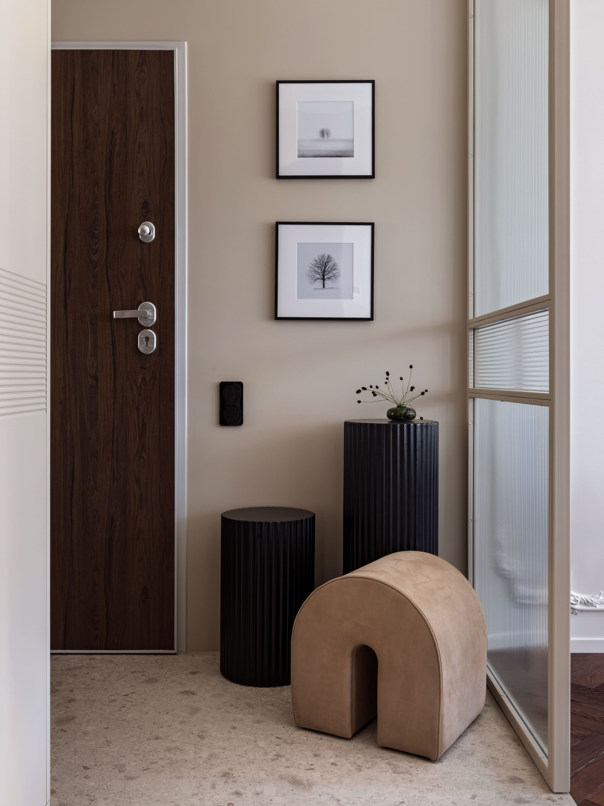 Przedpokój oddziela szklana ścianka, która chroni strefę jadalni przed wzrokiem od progu. Rytm ryflowań w zabudowie meblowej przedpokoju i sypialni nawiązuje do faktury szkła, tworząc spójny dialog materiałów. Lustro optycznie poszerza strefę wejściową, a ciepły beż podkreśla przytulność. Jedna z głównych osi widokowych prowadzi wzrok do kompozycji z kolumn, pufa i obrazu naprzeciwko łazienki — prosty, ale architektonicznie precyzyjny gest.