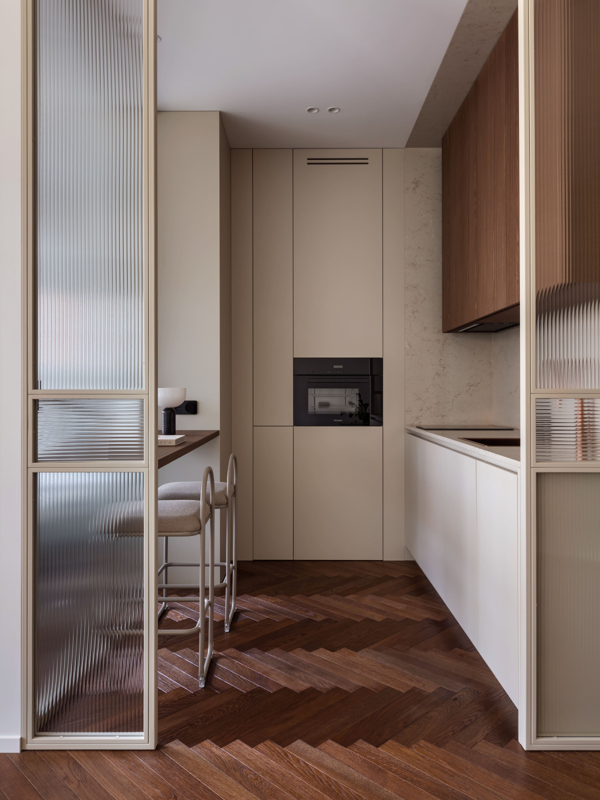 Kompaktowa i oszczędna w formie kuchnia mieści wszystko, co potrzebne do wygodnego użytkowania. Fornir orzechowy ociepla wnętrze, a jasna paleta wzmacnia wrażenie czystości i ładu. Przy szklanej przegrodzie zorganizowano barek dla dwóch osób — idealne miejsce na śniadanie, kawę lub pracę przy laptopie. Ta niewielka przestrzeń doskonale podtrzymuje rytm codzienności.