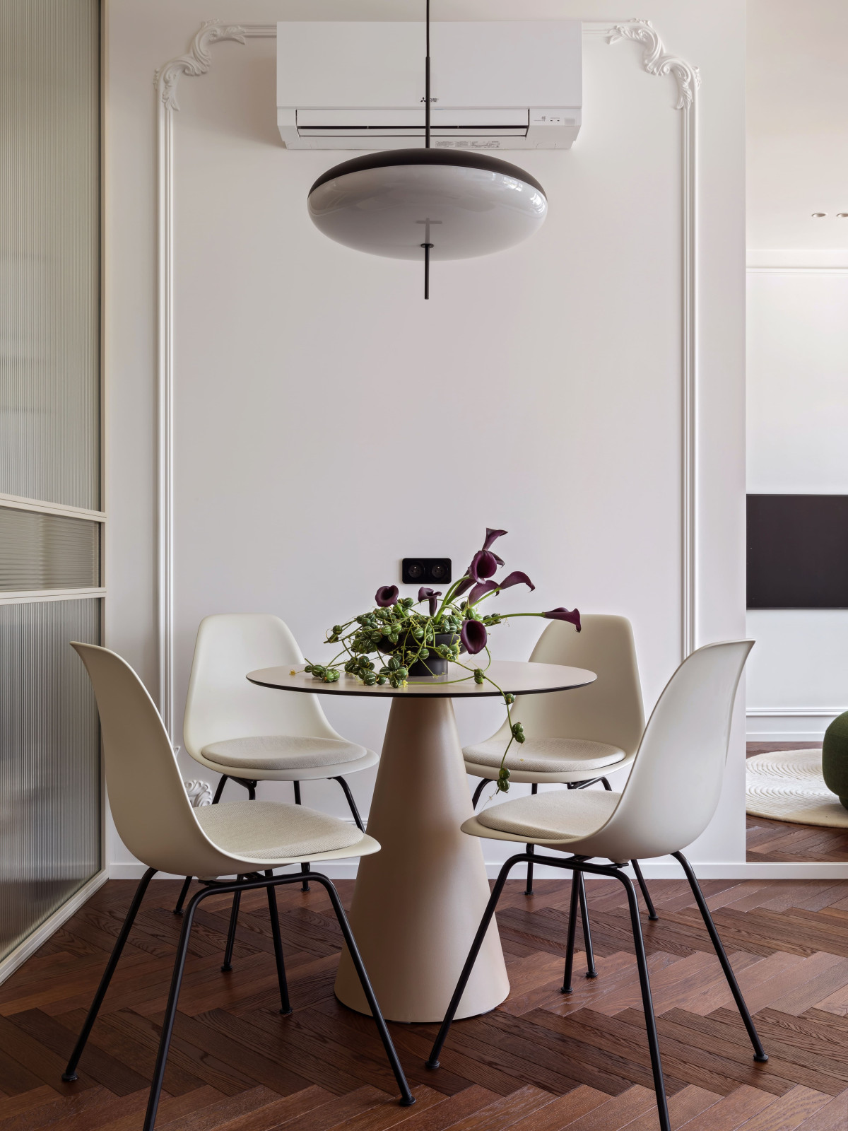 Jadalnię zaprojektowano wokół okrągłego stołu – miejsca codziennych rozmów, szybkich spotkań i niespiesznych kolacji. Kompozycja świetnie wpisuje się w oś widokową prowadzącą od kuchni. Ściana z klasycznymi sztukateriami spina całość.