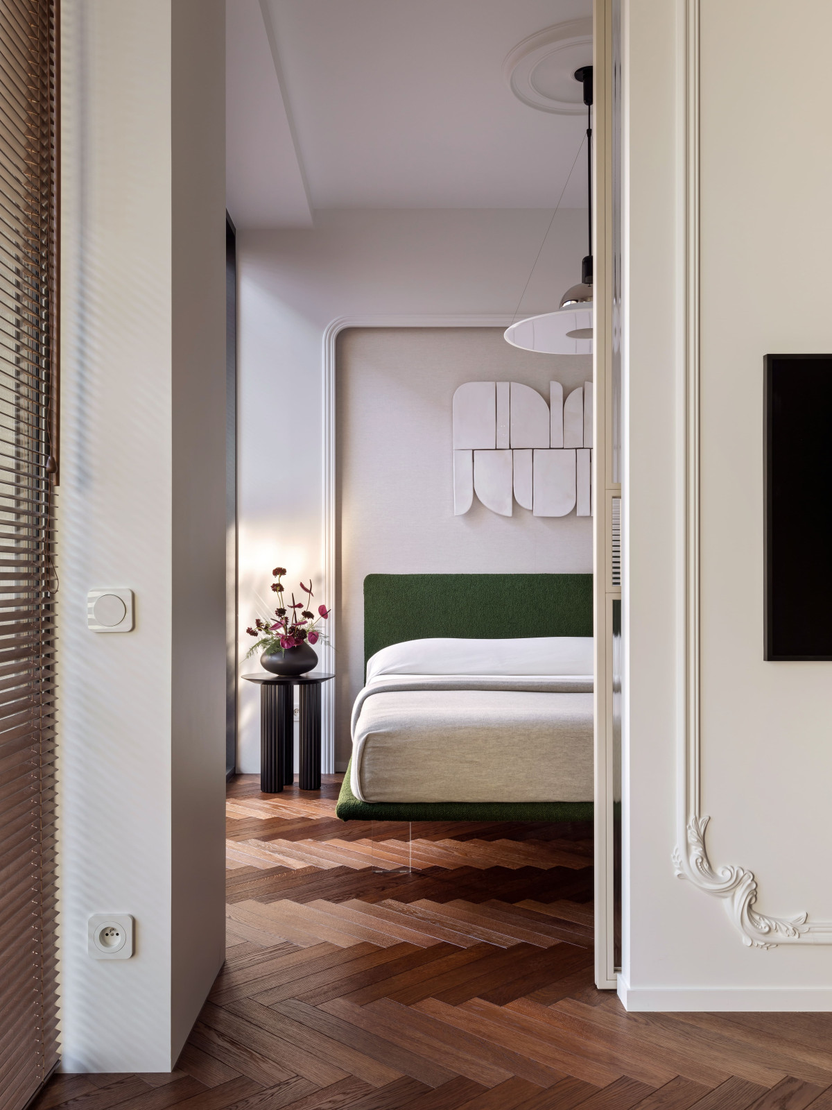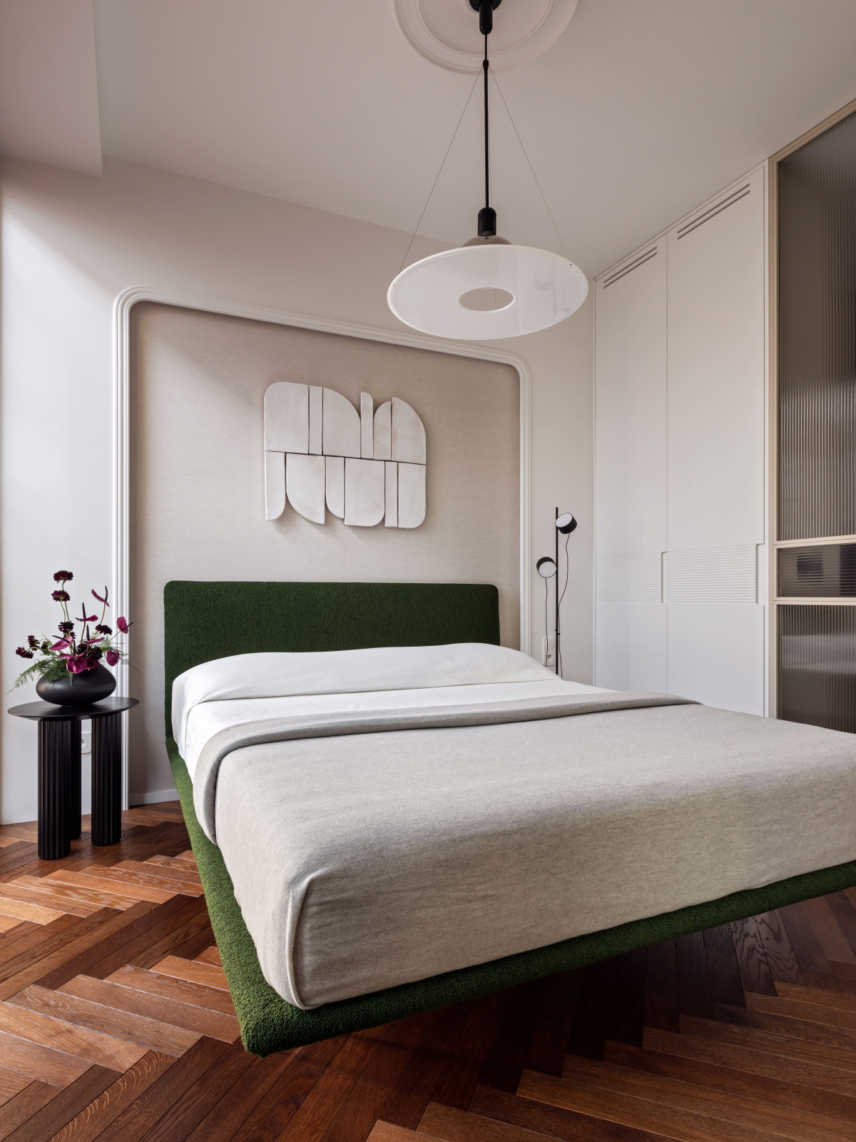 Zamiast chować sypialnię w ciemnej niszy, architekci zaaranżowali ją przy oknie. Przesuwna przegroda pozwala na jej wydzielenie, ale przy otwarciu płynnie łączy się z salonem. Przejrzyste szkło wpuszcza światło do kuchni, a „lewitujące” łóżko na szklanych nogach potęguje wrażenie lekkości. Wezgłowie pokryto tkaniną o miękkiej fakturze. Nad nim — ceramiczna dekoracja, która dopełnia całość.