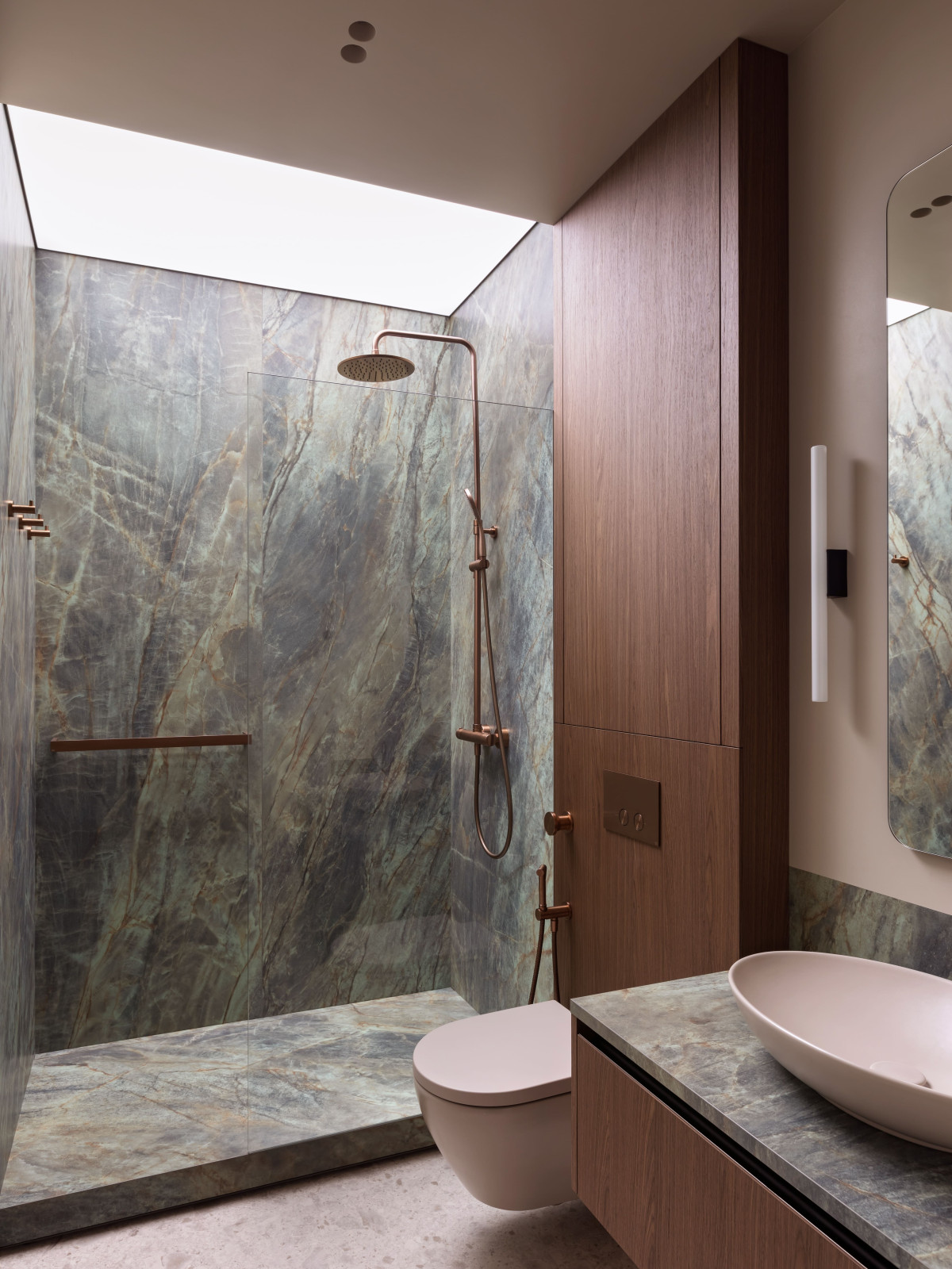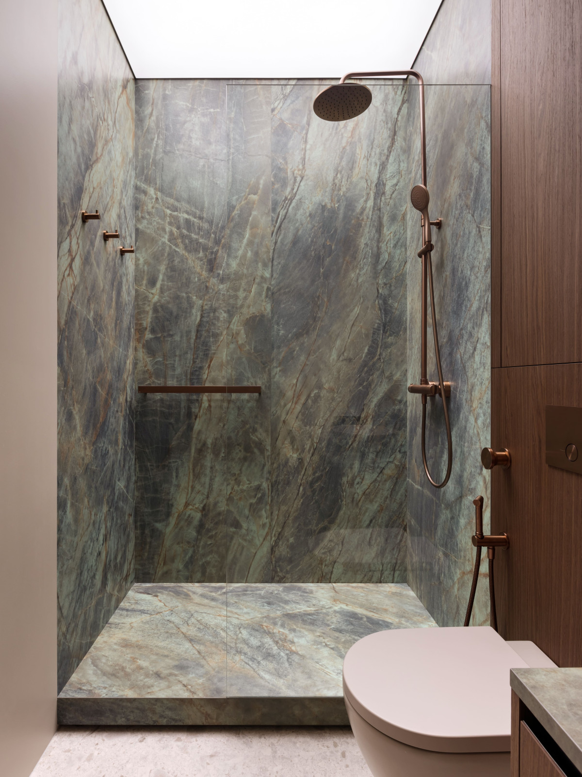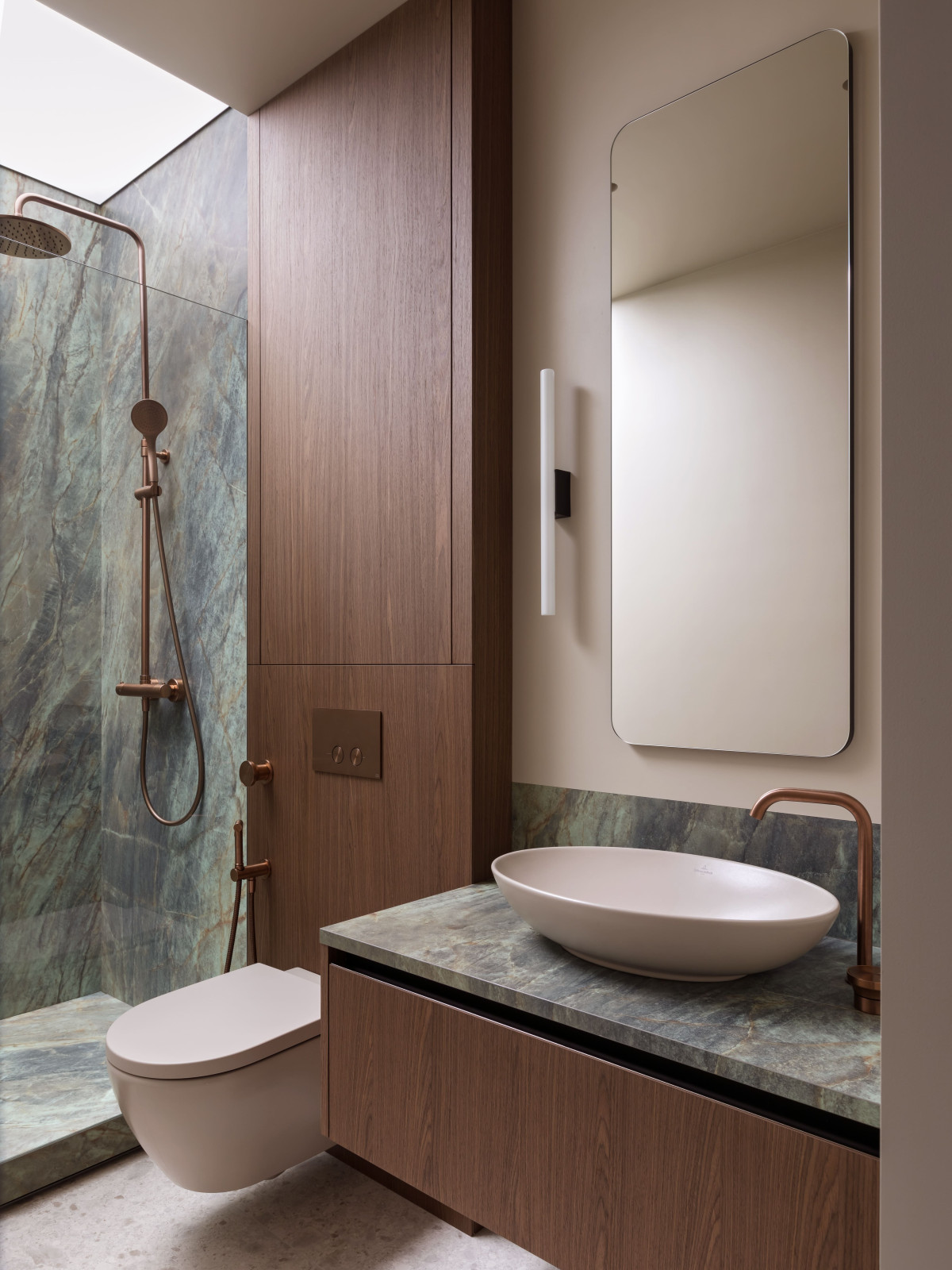 Łazienka utrzymana jest w naturalnej tonacji: głęboka zieleń, ciepły beż i fakturalne drewno z dodatkami miedzi. Podświetlany sufit wizualnie podnosi przestrzeń nad prysznicem i tworzy efekt światła dziennego.