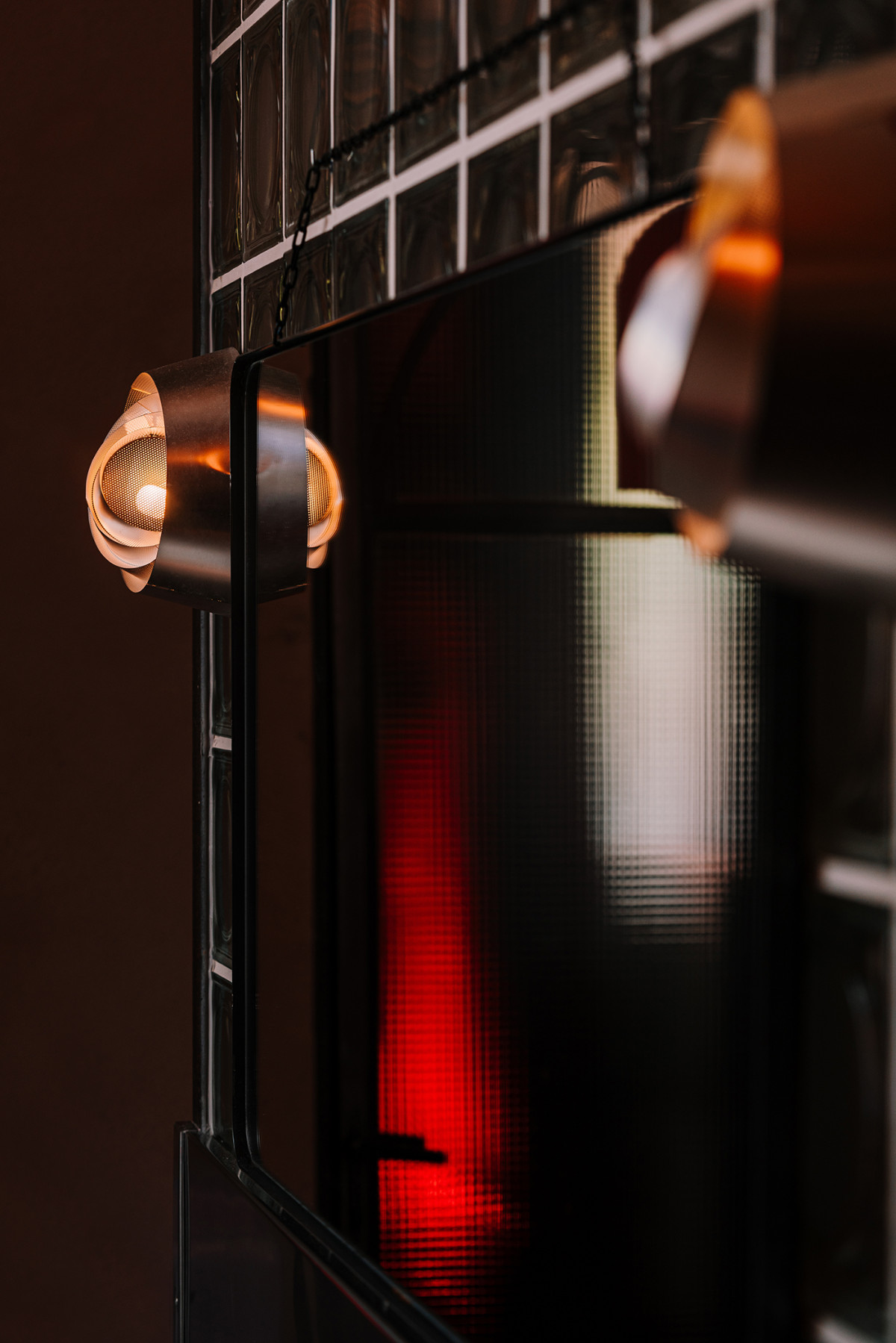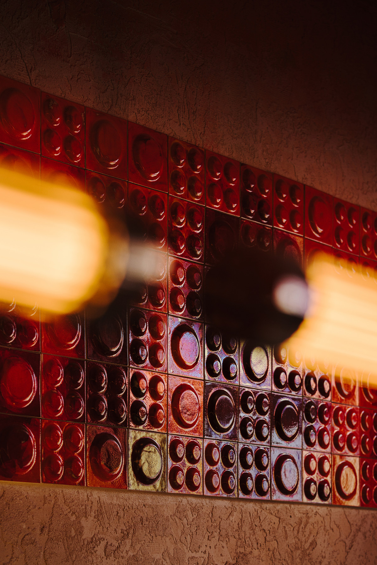 Ręcznie wykonana jest też pomarańczowo-czerwona mozaika za barem i murale zaprzyjaźnionego z architektką streetartowca Wvjota, które nawiązują do motywów z książek Stanisława Lema. Całość uzupełniają zróżnicowane stylistycznie meble: perforowane krzesła i geometryczne stoły z chromowanymi akcentami oraz wykonane na zamówienie, tapicerowane skórą kanapy w lożach. Przykryte poliwęglanowymi ekranami świetlówki są zaprogramowane tak, by można było zmieniać barwę i natężenie światła w zależności od pory dnia, roku czy okazji. Za każdym razem można więc doświadczać tu nie tylko nowych smaków, ale i nastrojów.