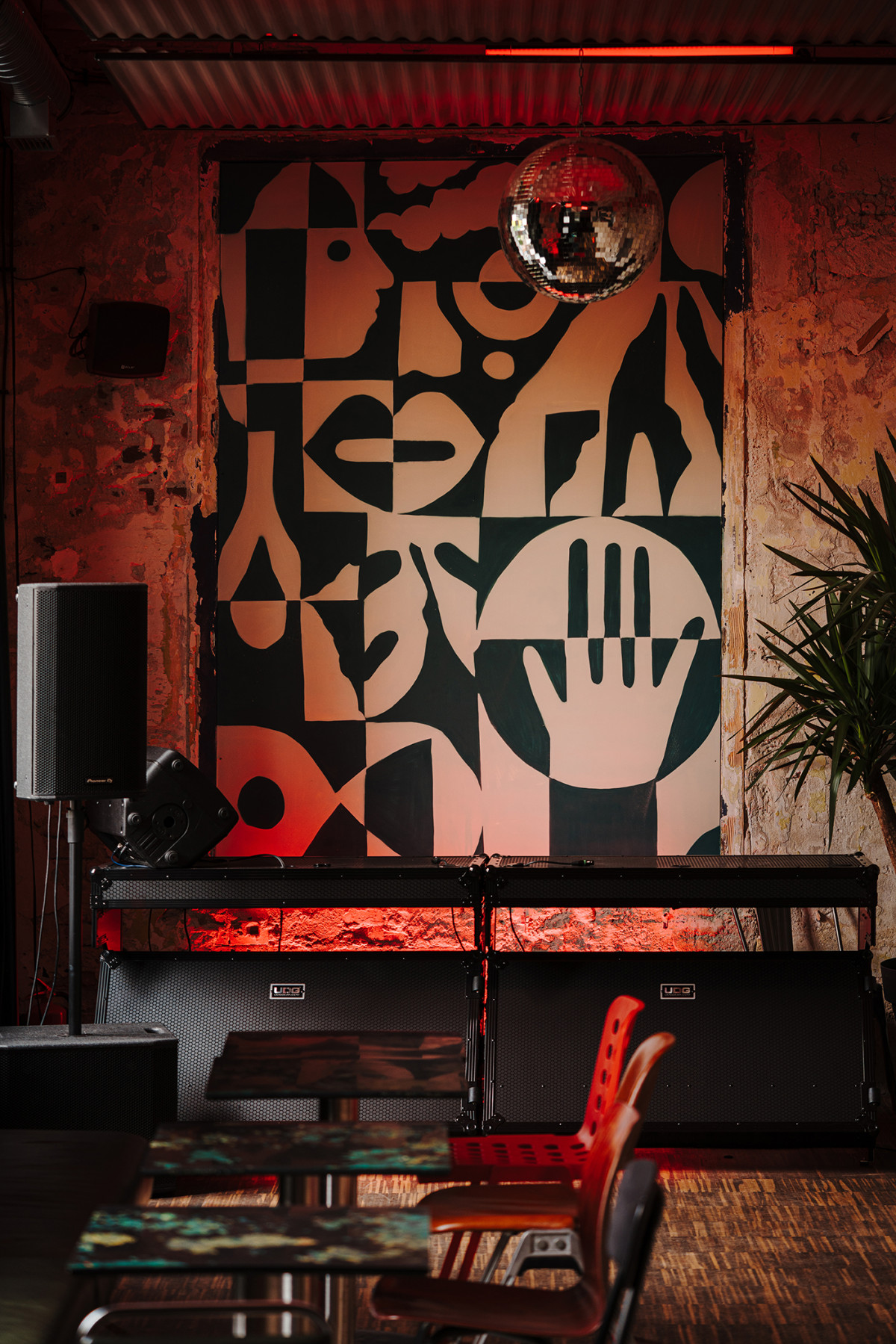 Tłem dla didżejki jest jeden z murali Wvjota. Graficzne kompozycje nawiązują do twórczości Stanisława Lema. Zdjęcie: Mood Authors