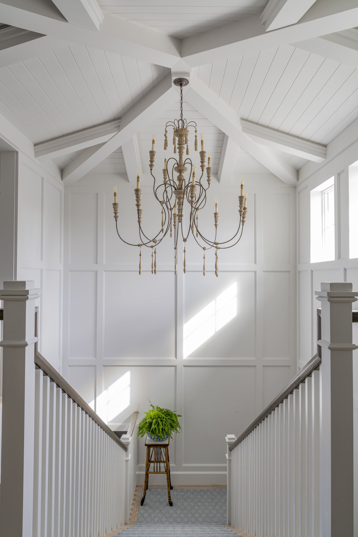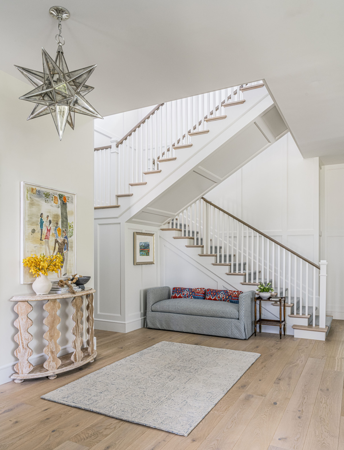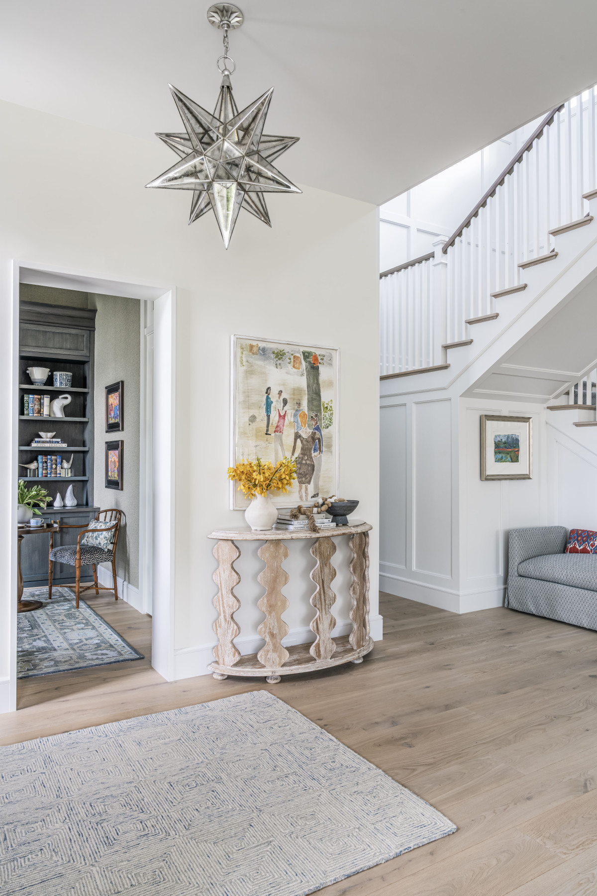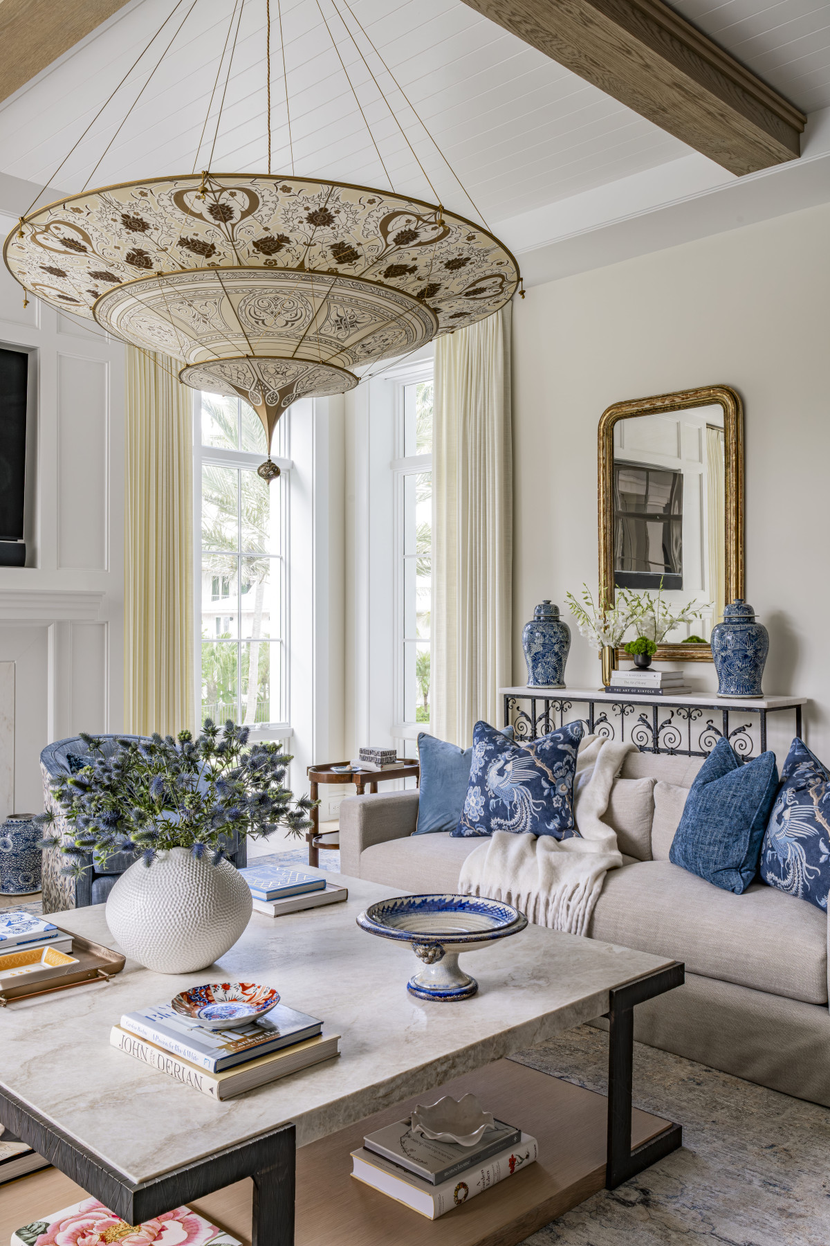 We wnętrzu nie zabrakło też sztuki, w tym obrazów amerykańskiego artysty Marka Mulherna, który jest szczególnie ceniony przez właścicieli posiadłości. Oprócz dzieł sztuki i pieczołowicie dobranych mebli, ozdobą wnętrz są również dekoracyjne oprawy oświetleniowe. Tu warto wymienić chociażby jedwabny abażur w salonie, gwieździstą lampę w hallu czy żyrandol w łazience przypominający zwisające pędy roślin.