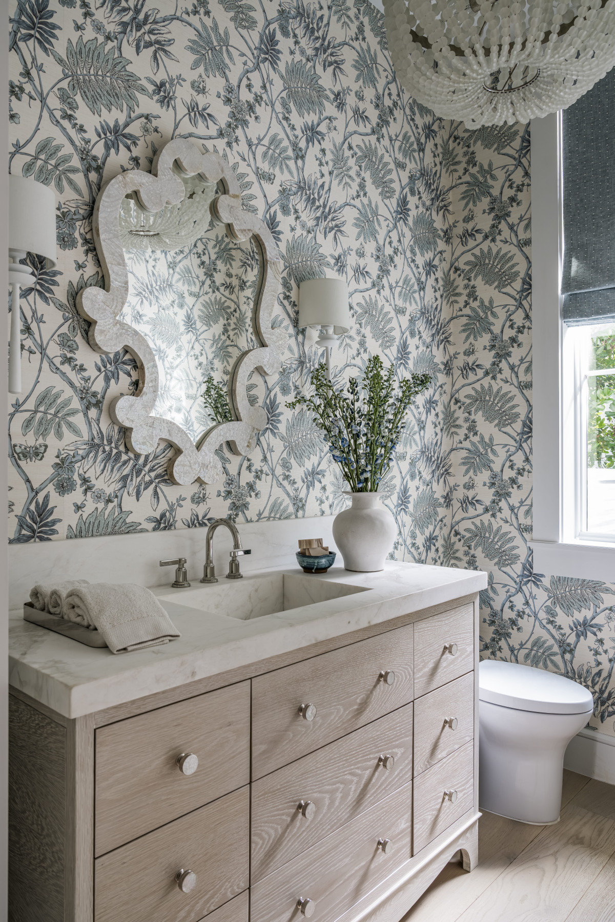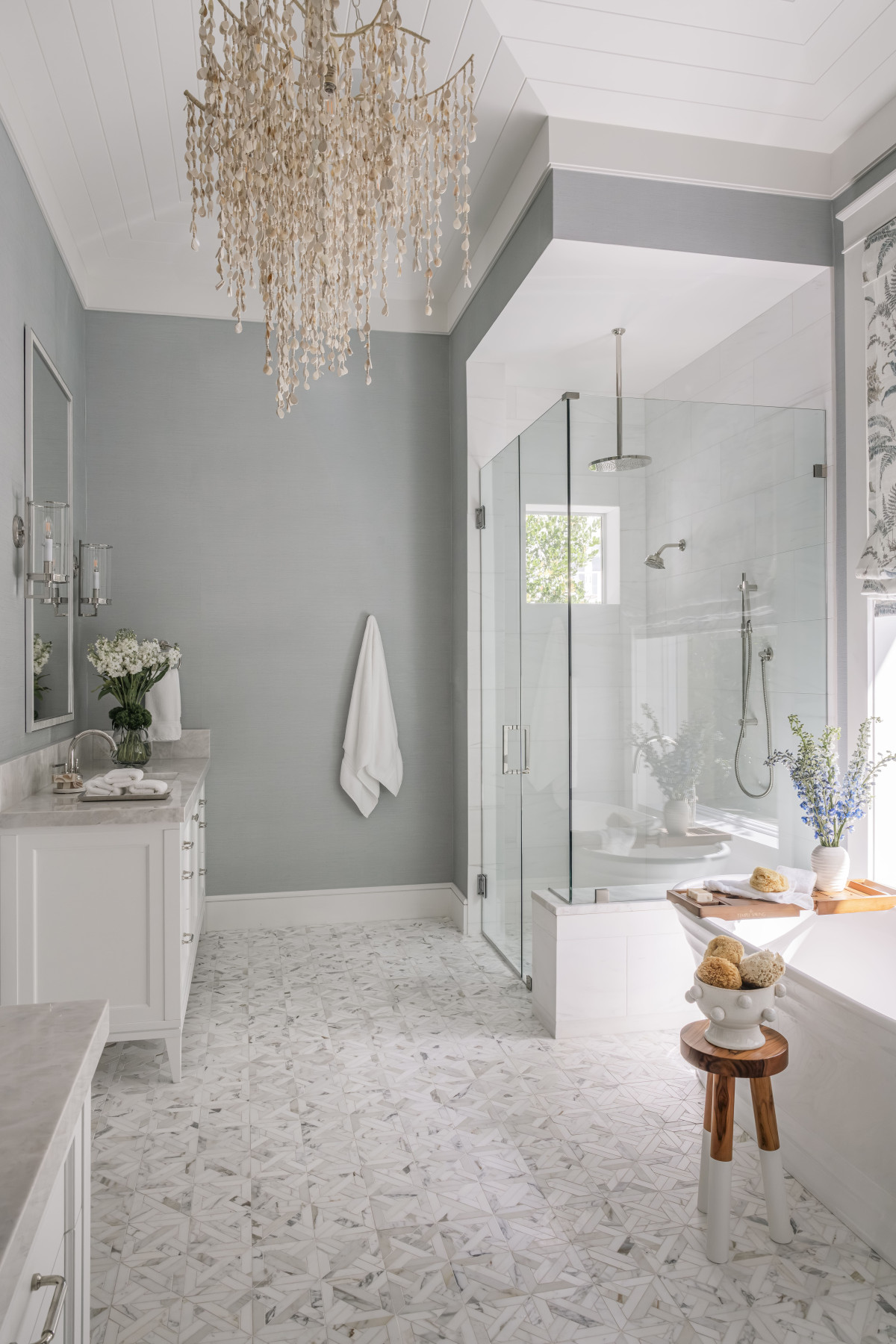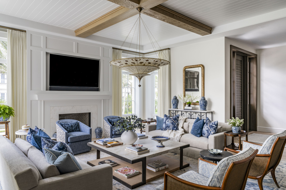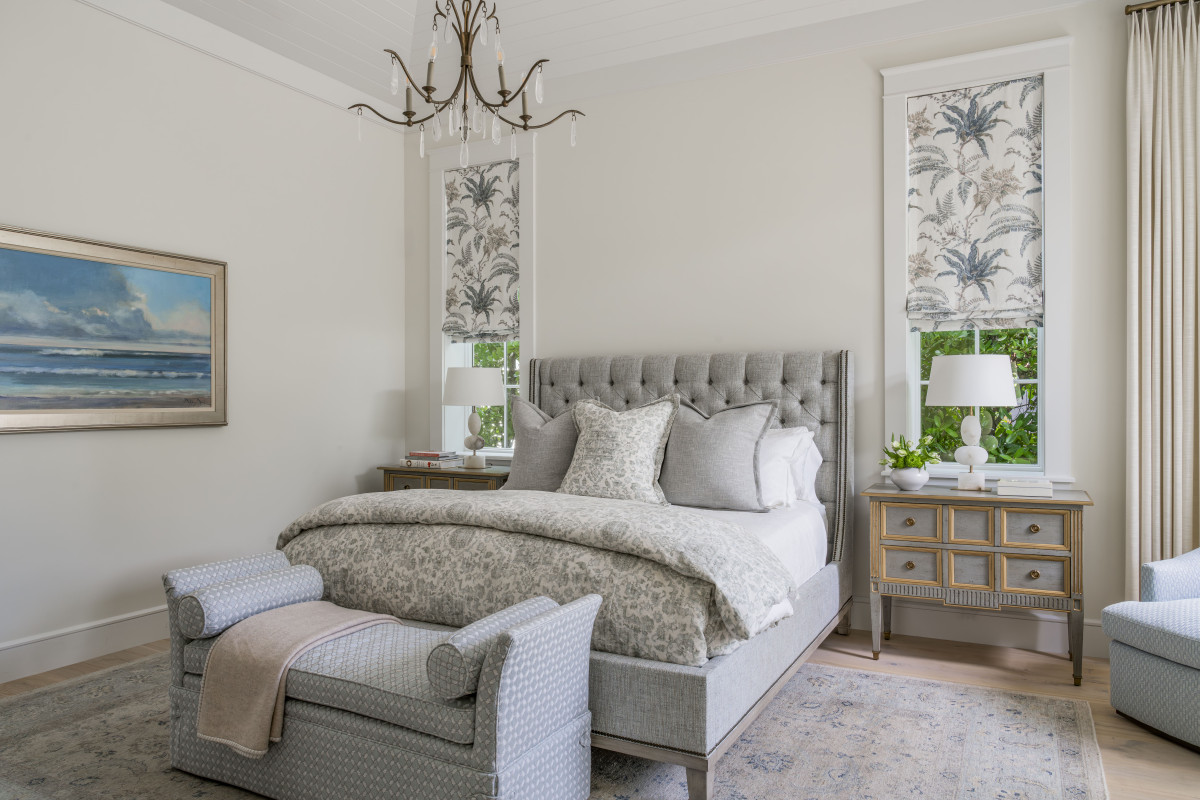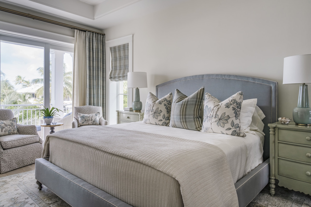 Paleta barwna, wzory i wykończenia podkreślają sprzyjający odpoczynkowi, wieczny klimat wakacji. Ponieważ właściciele uwielbiają kolor niebieski, projektant zadbał o dodatki i tekstylia właśnie w tym kolorze. Stonowaną kolorystykę pomieszczeń wzbogacono również o wyrazistsze elementy oraz wzorzyste tapety.