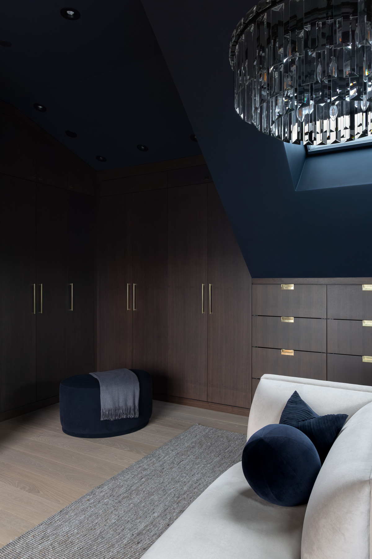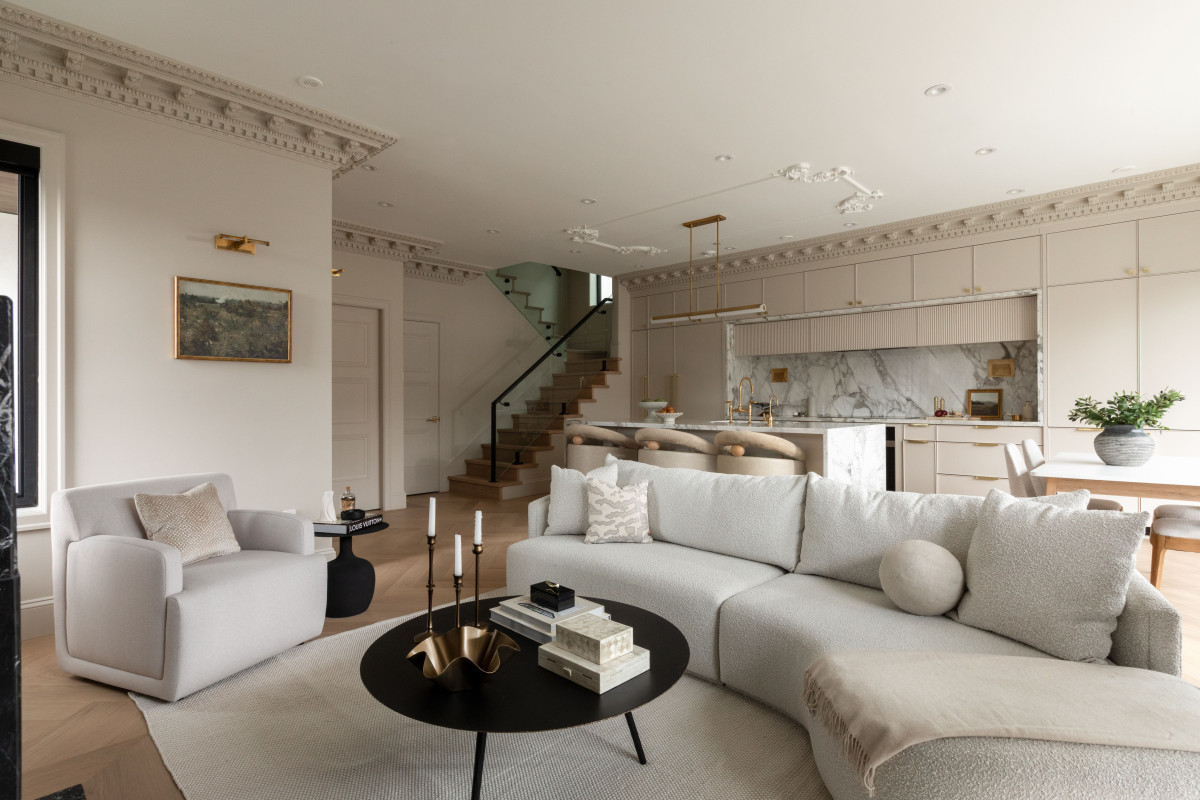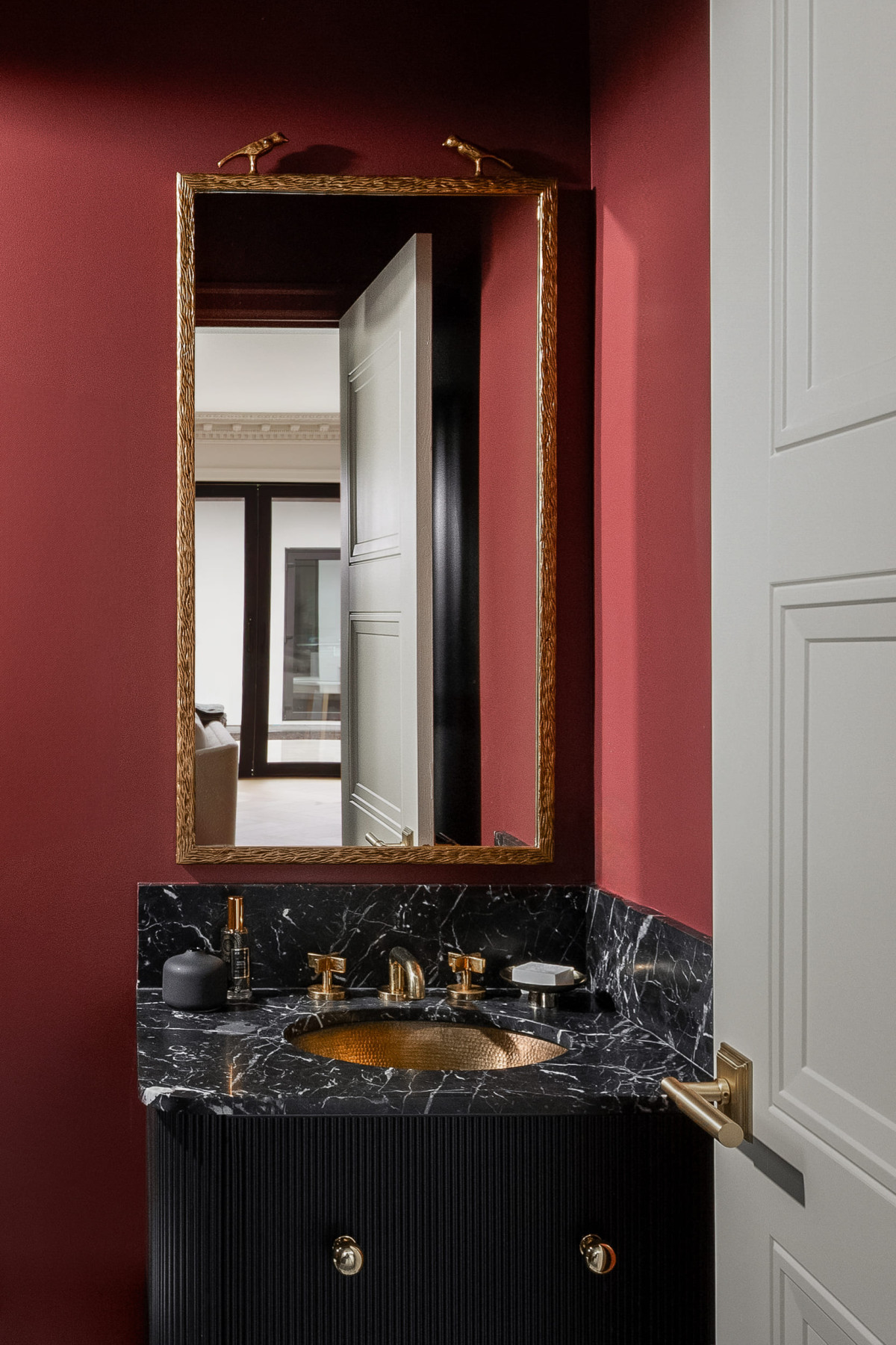 W projekcie przeważa stonowana, jasna kolorystyka z ciepłymi beżami i bielą, którą wzbogacają naturalne materiały jak drewno i kamień o wyrazistym żyłkowaniu. Tu warto wymienić szary marmur Eros, który w głównej łazience zestawiono z mosiądzem i czernią szafek. W pomieszczeniach jak toaleta gościnna (burgund ze złotymi elementami) czy sypialnia Marco (granat) zastosowano mocniejsze kolory w przygaszonych odcieniach, które z jednej strony urozmaicają wnętrze, a z drugiej – podkreślają elegancki klimat aranżacji.