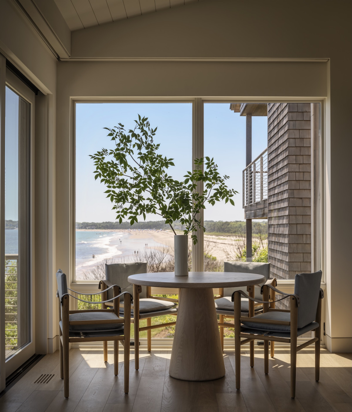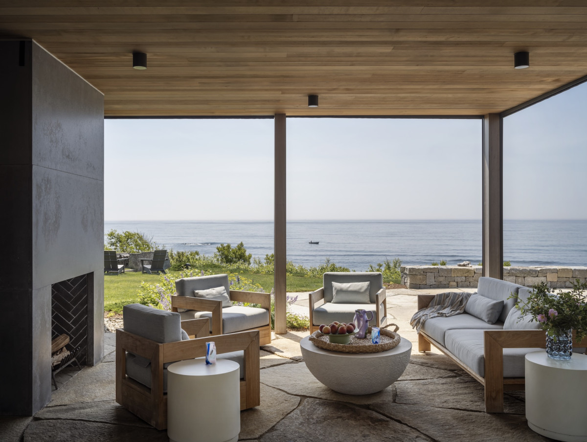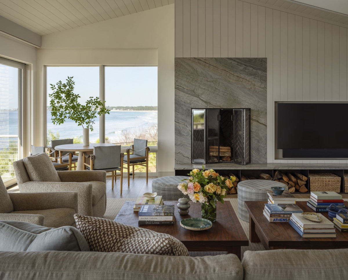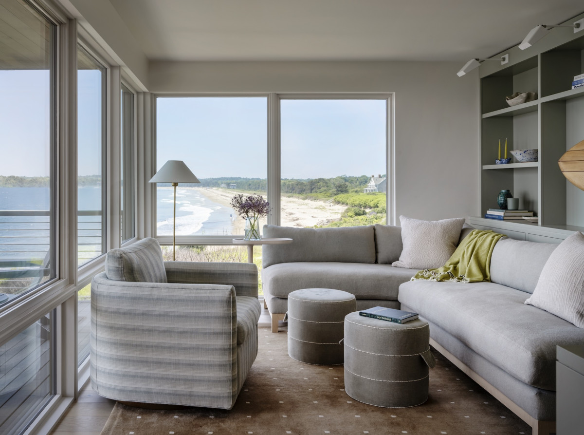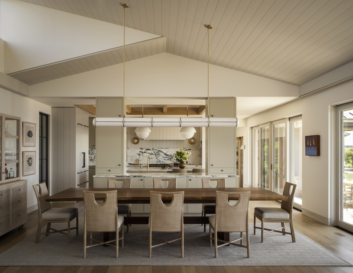 Ale nie tylko przestrzenie zewnętrzne zachęcają do delektowania się naturą – budynek zaprojektowano tak, by praktycznie z każdego okna w domu można było podziwiać plażę i ocean. Ten nadmorski klimat towarzyszył projektantce podczas aranżowania wnętrz – marmury z żyłkowaniem nawiązuje do skalistych plaż, podobnie jak czysta biel dębowych podłóg, lniane tkaniny o luźnym splocie przypominają o kępach traw kołyszących się na wietrze, a płytki o strukturze muszli wpisują się w morską estetykę.