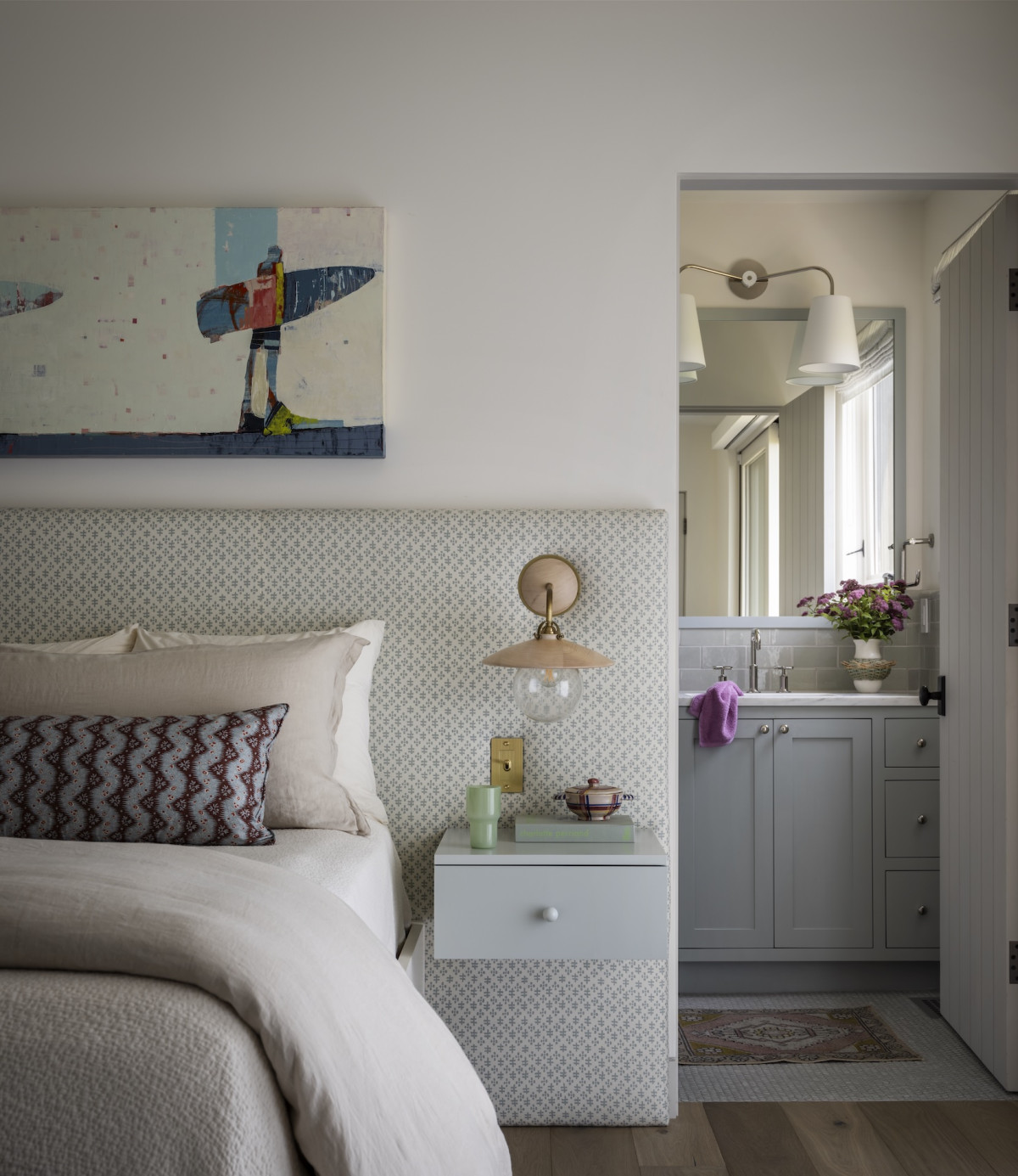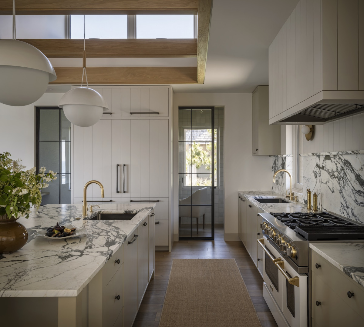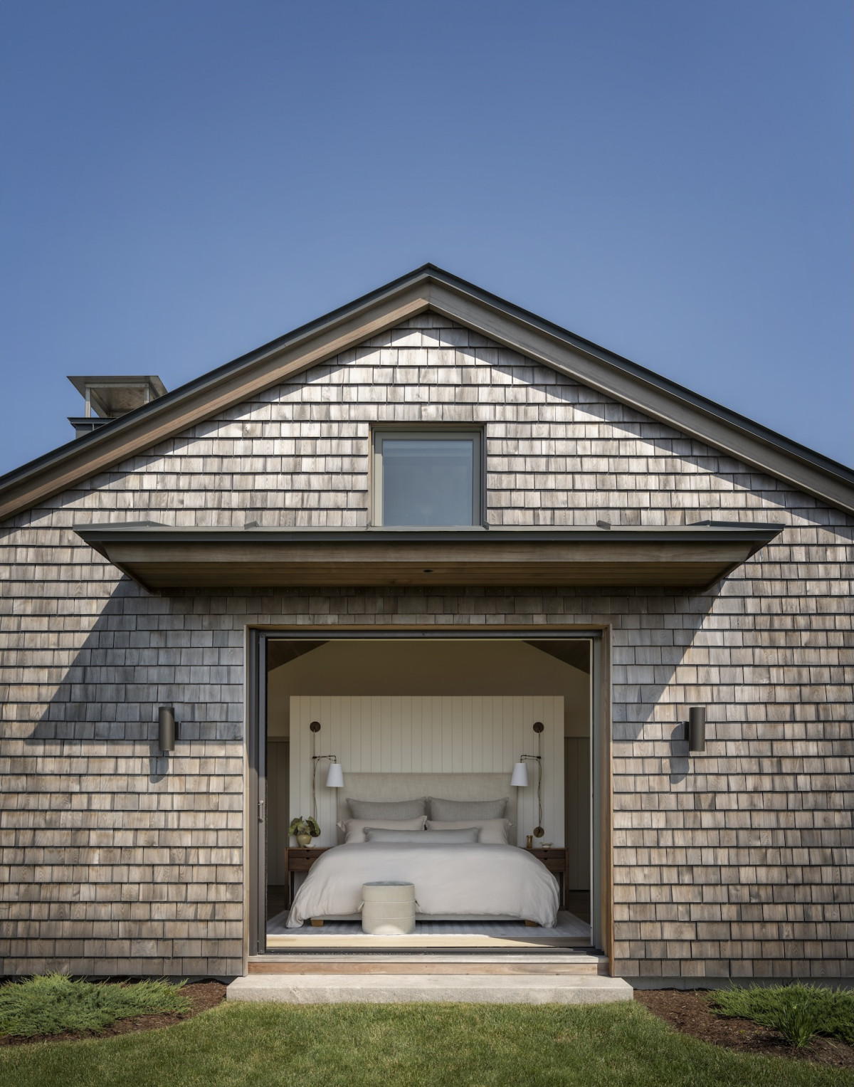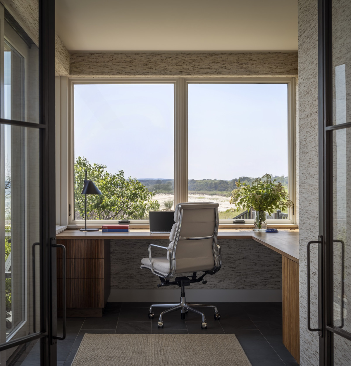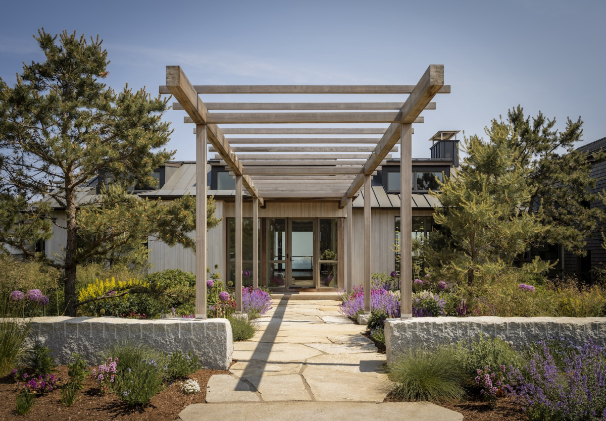 Ale nie tylko przestrzenie zewnętrzne zachęcają do delektowania się naturą – budynek zaprojektowano tak, by praktycznie z każdego okna w domu można było podziwiać plażę i ocean. Ten nadmorski klimat towarzyszył projektantce podczas aranżowania wnętrz – marmury z żyłkowaniem nawiązuje do skalistych plaż, podobnie jak czysta biel dębowych podłóg, lniane tkaniny o luźnym splocie przypominają o kępach traw kołyszących się na wietrze, a płytki o strukturze muszli wpisują się w morską estetykę.