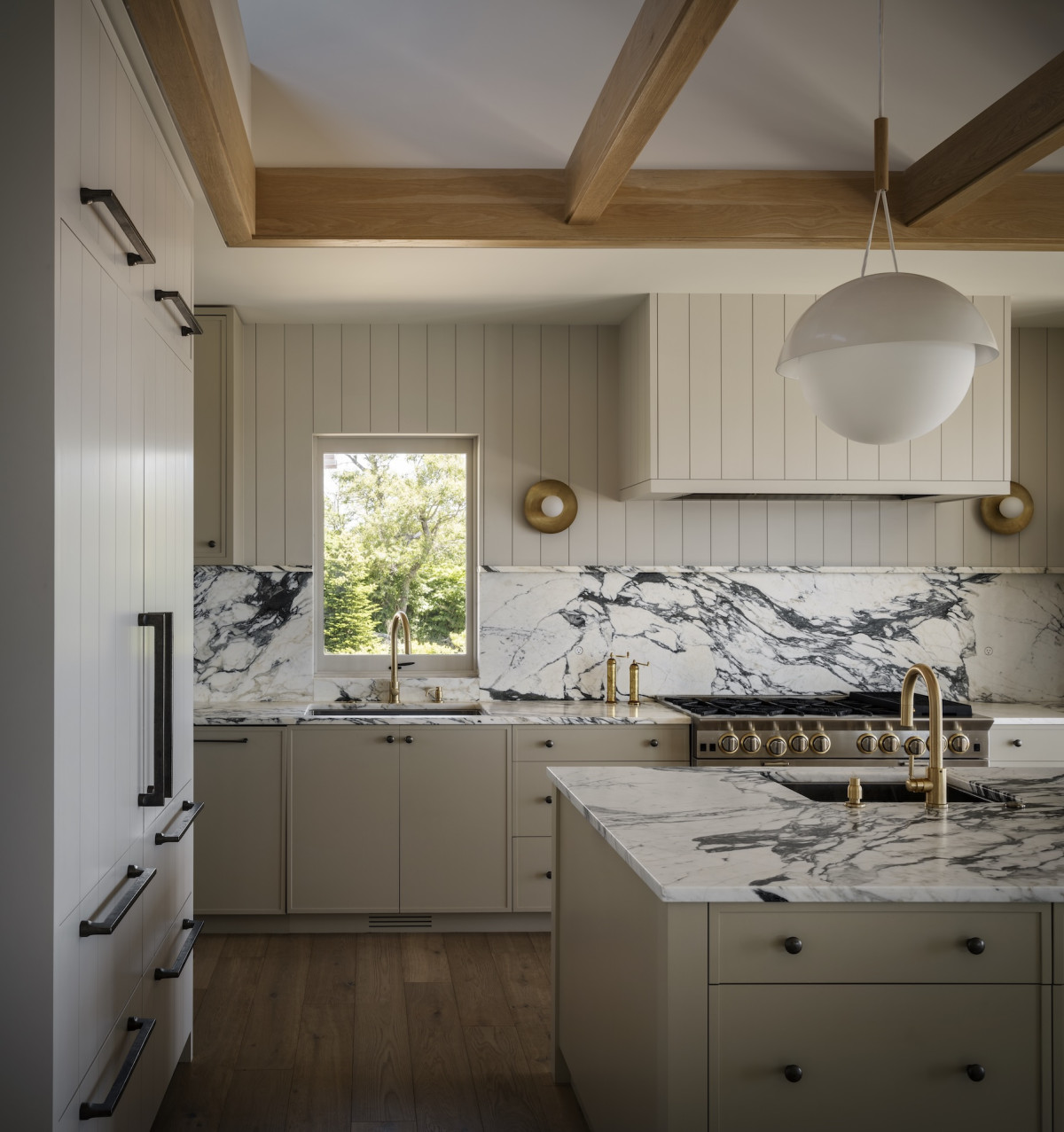 Jest od tego mały wyjątek – a mianowicie kuchnia, która jest królestwem pani domu. Pomysł na to pomieszczenie był w najdrobniejszych szczegółach konsultowany z właścicielką i miał z jednej strony zachwycać swoim wyglądem, a z drugiej – zapewniać wygodę w użytkowaniu i przyrządzaniu wyśmienitych potraw. To, co zwraca szczególną uwagę w aranżacji kuchni to ściana nad blatem pokryta jasnym marmurem z efektownym, czarnym użyleniem, a także wyspa, którą flankują dwie bezowe szafki sięgające sufitu – tworzą one estetyczną ramę dla marmurowej ściany.