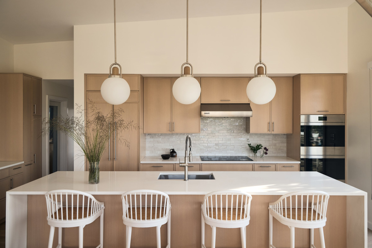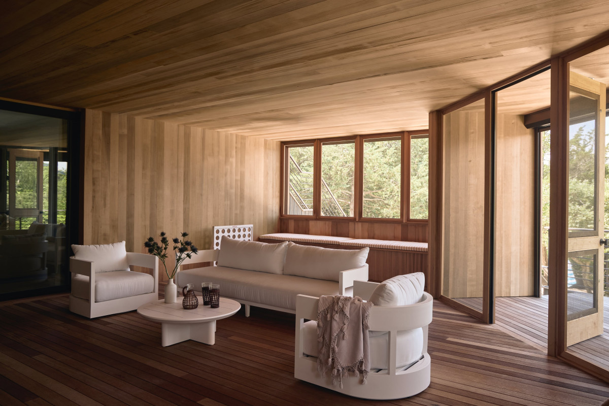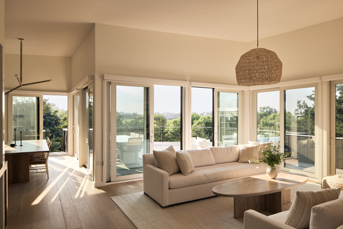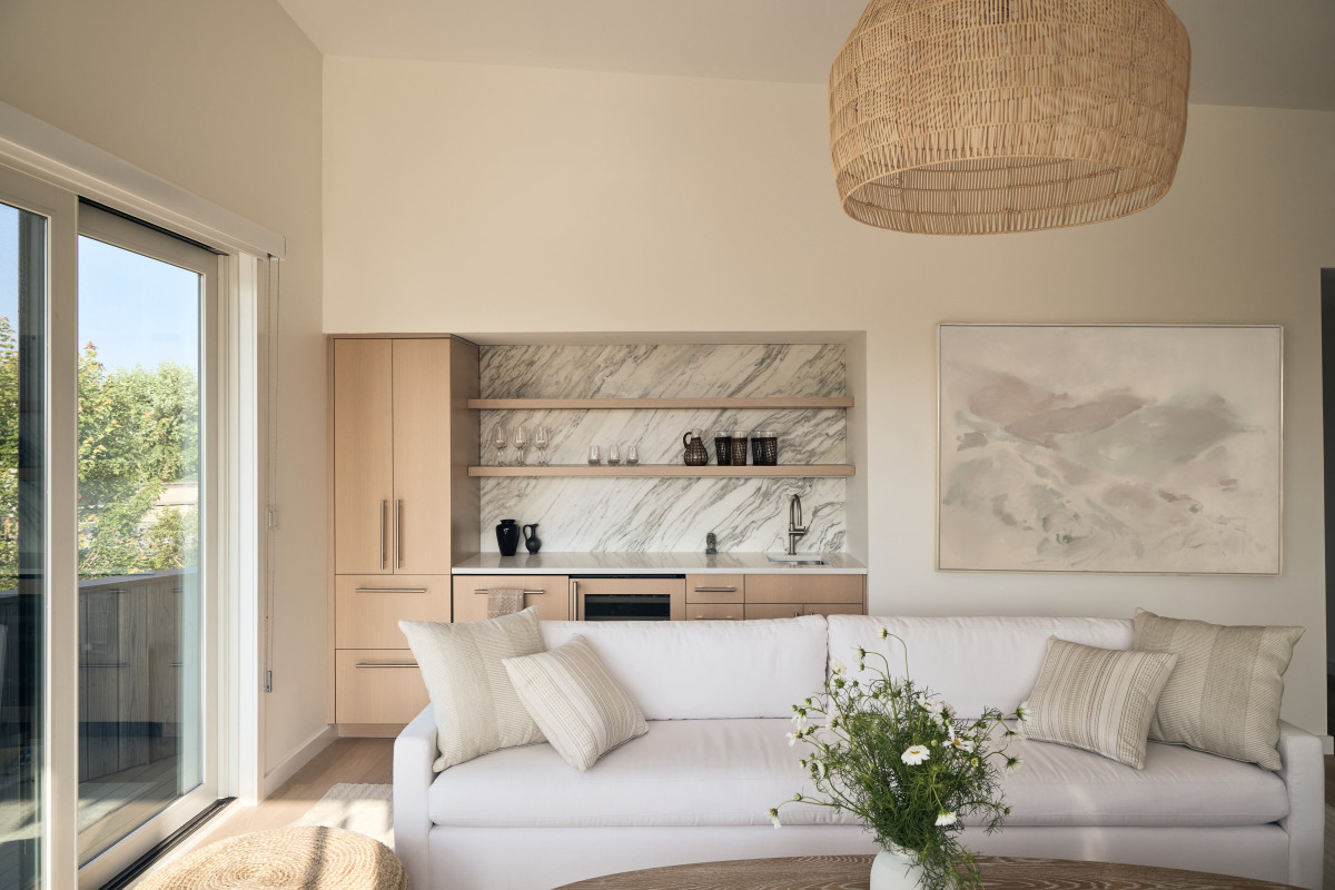 W domu dominuje stonowana, neutralna kolorystyka, która pozwala grać pierwsze skrzypce dodatkom oraz nadmorskiemu krajobrazowi widzianemu z okien. Wnętrza zaprojektowane przez Andrew Ludingtona to wyważony zbór elementów i materiałów, które razem tworzą przytulną, ale jednocześnie elegancką przestrzeń. Projektant zadbał również o staranny dobór dodatków oraz mebli, które nadają aranżacji unikatowego charakteru. Paleta oparta na bieli i beżu płynnie łączy się z naturalnymi materiałami, takimi jak wiklina, rattan, biały dąb, terazzo i kamień (tu na szczególną uwagę zasługuje marmur Arabascatto, który zdobi bar w strefie dziennej).