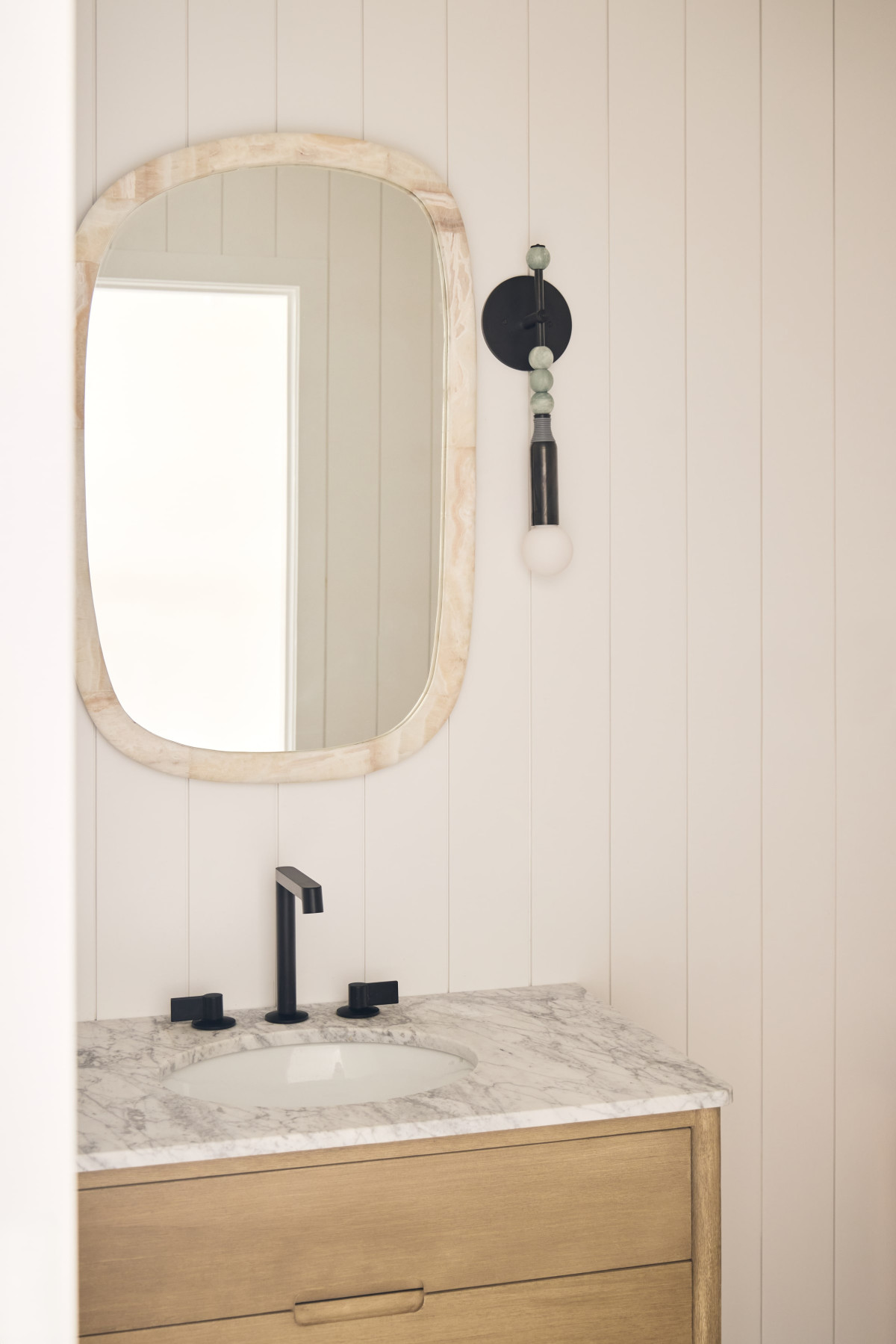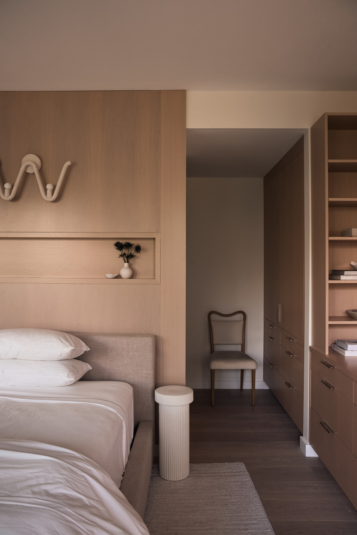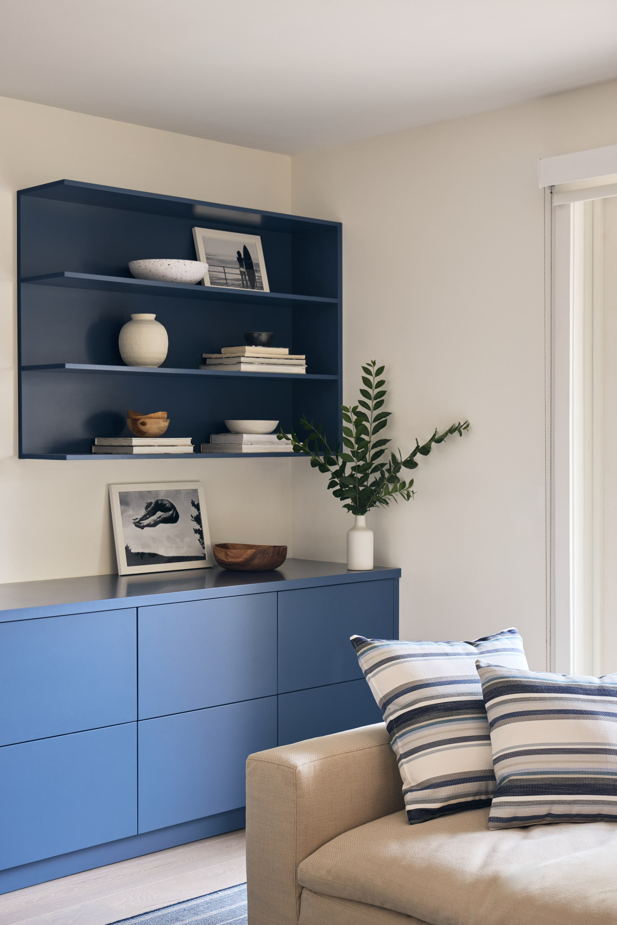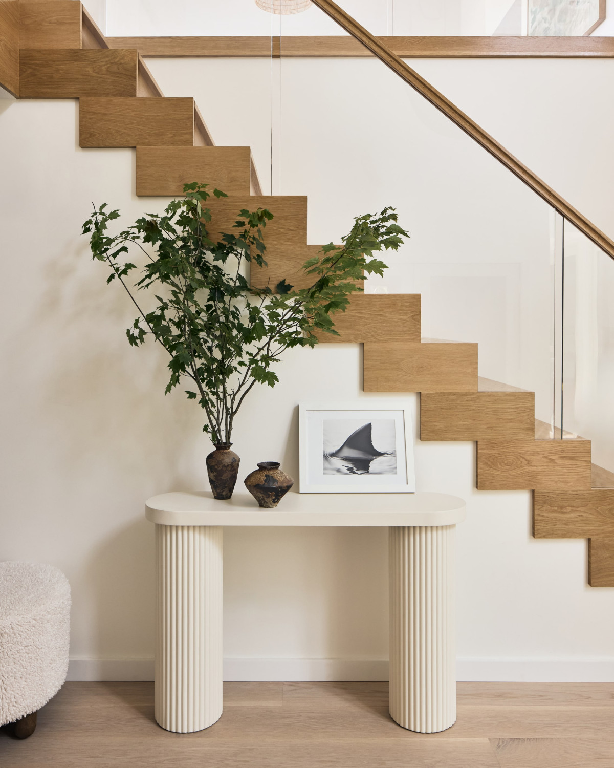 W domu dominuje stonowana, neutralna kolorystyka, która pozwala grać pierwsze skrzypce dodatkom oraz nadmorskiemu krajobrazowi widzianemu z okien. Wnętrza zaprojektowane przez Andrew Ludingtona to wyważony zbór elementów i materiałów, które razem tworzą przytulną, ale jednocześnie elegancką przestrzeń. Projektant zadbał również o staranny dobór dodatków oraz mebli, które nadają aranżacji unikatowego charakteru. Paleta oparta na bieli i beżu płynnie łączy się z naturalnymi materiałami, takimi jak wiklina, rattan, biały dąb, terazzo i kamień (tu na szczególną uwagę zasługuje marmur Arabascatto, który zdobi bar w strefie dziennej).