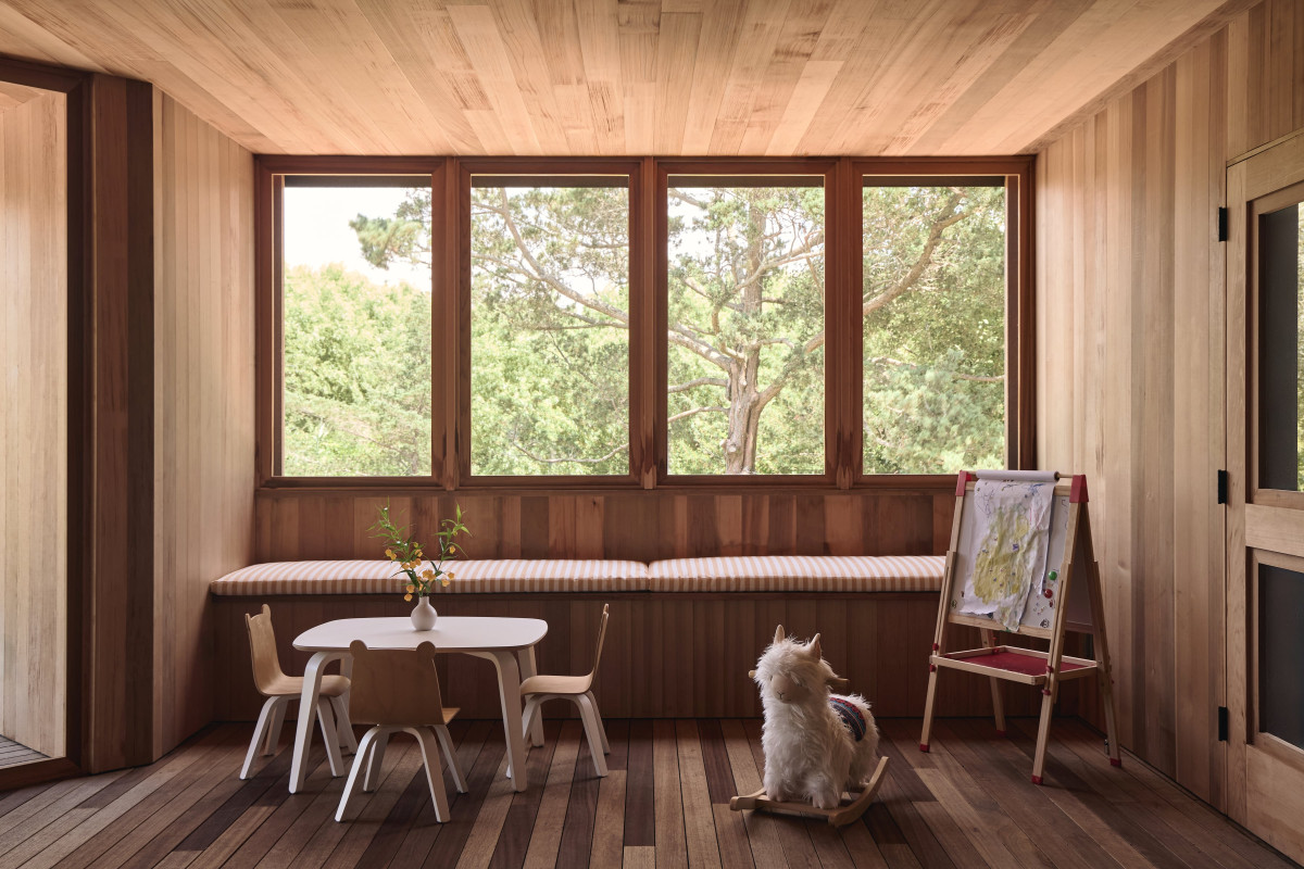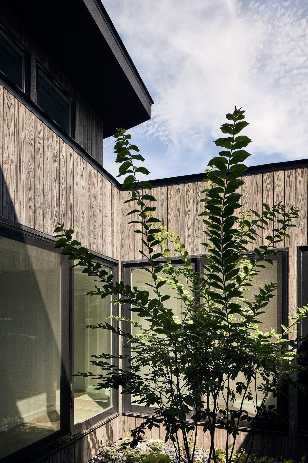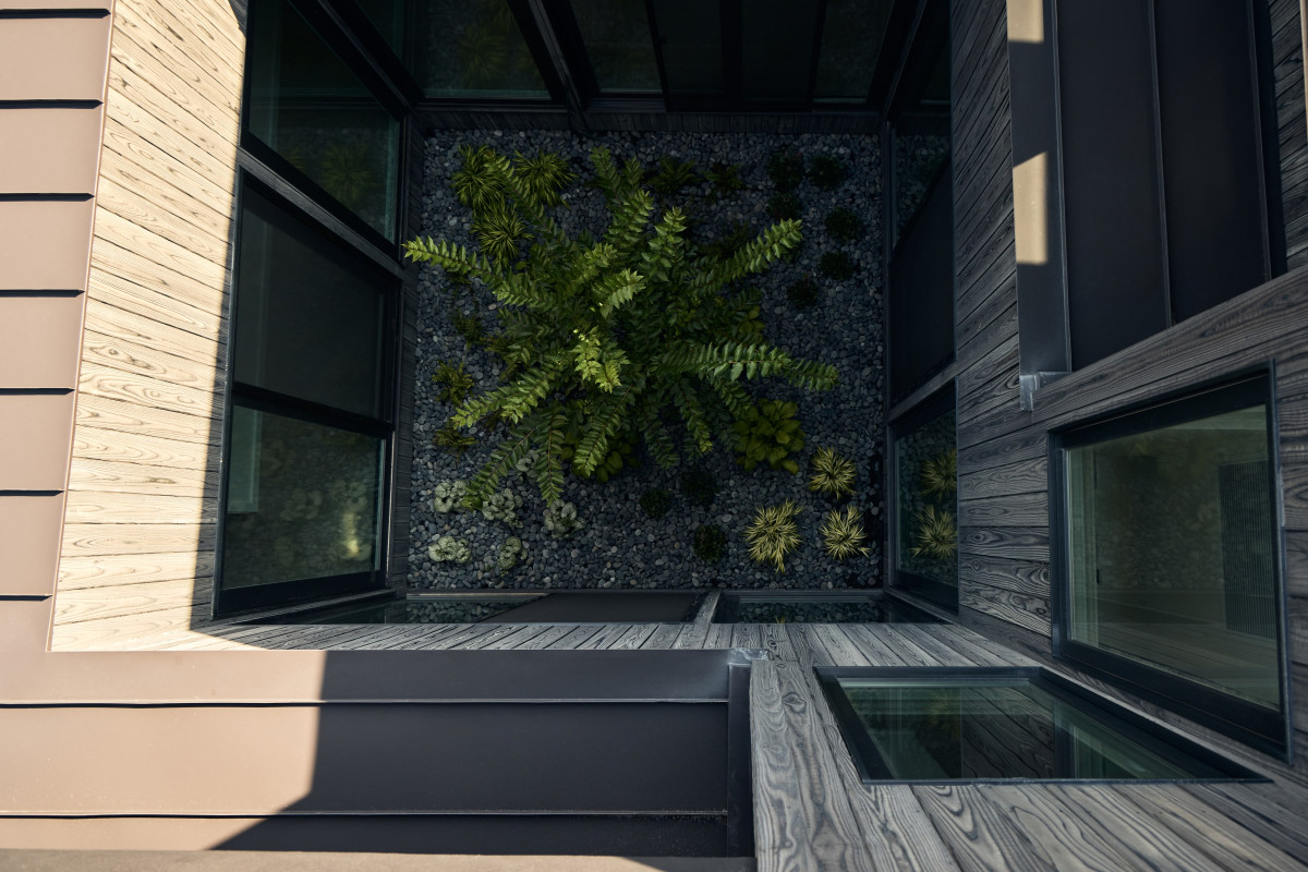 Uwagę zwraca również drewniana elewacja wykonana w japońskiej technice shou sugi ban, a także centralny dziedziniec oraz przestronny taras widokowy na piętrze. Pokój zabaw i mniejszy salon zostały wykończone drewnem cedrowym, dzięki czemu nabrały ciepłego, przytulnego charakteru. Z kolei duże przeszklenia i okna dachowe w jadalni nie tylko zapewniają piękne widoki, ale również zacierają granicę między wnętrzem a zewnętrzem, podkreślając więź człowieka z naturą.