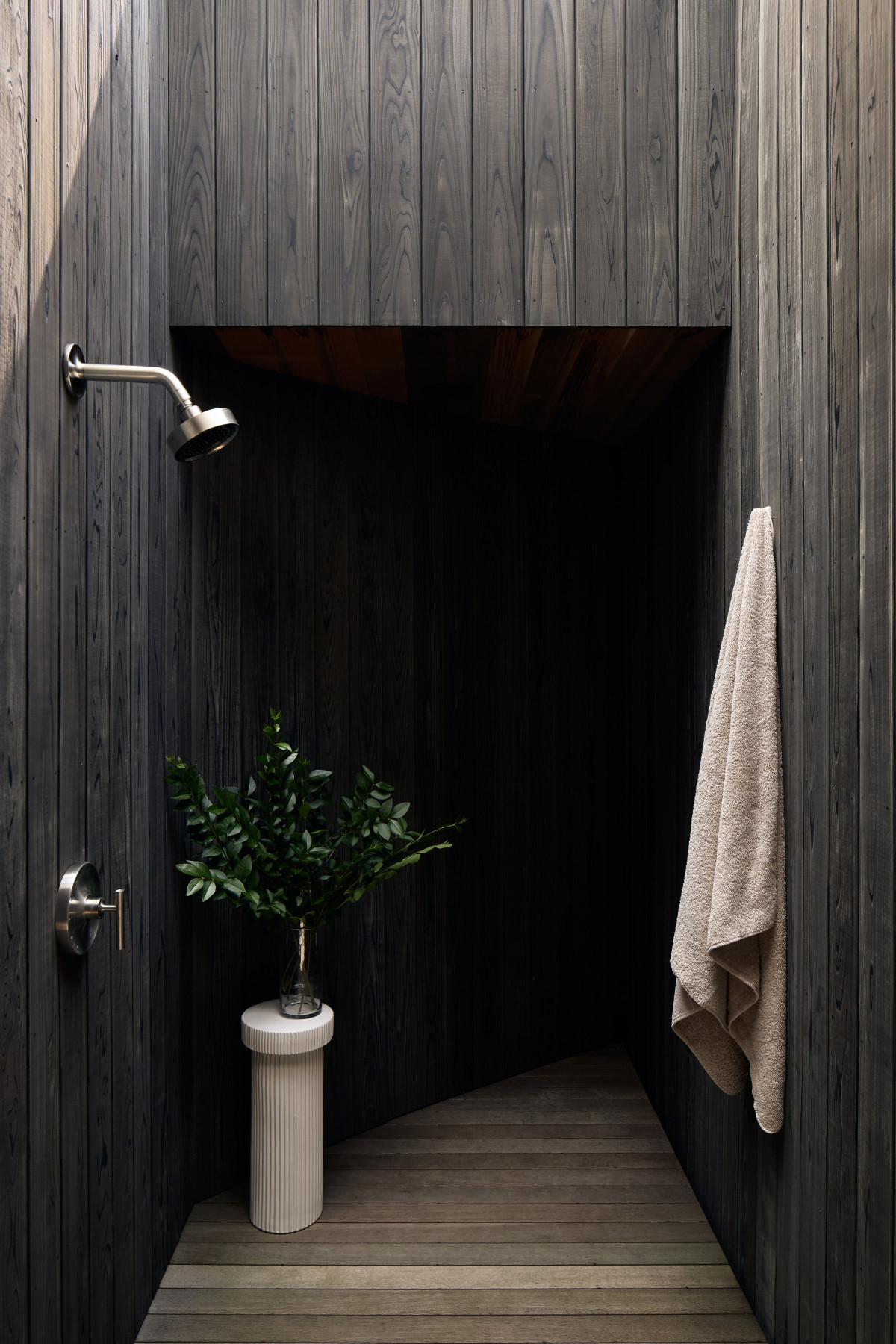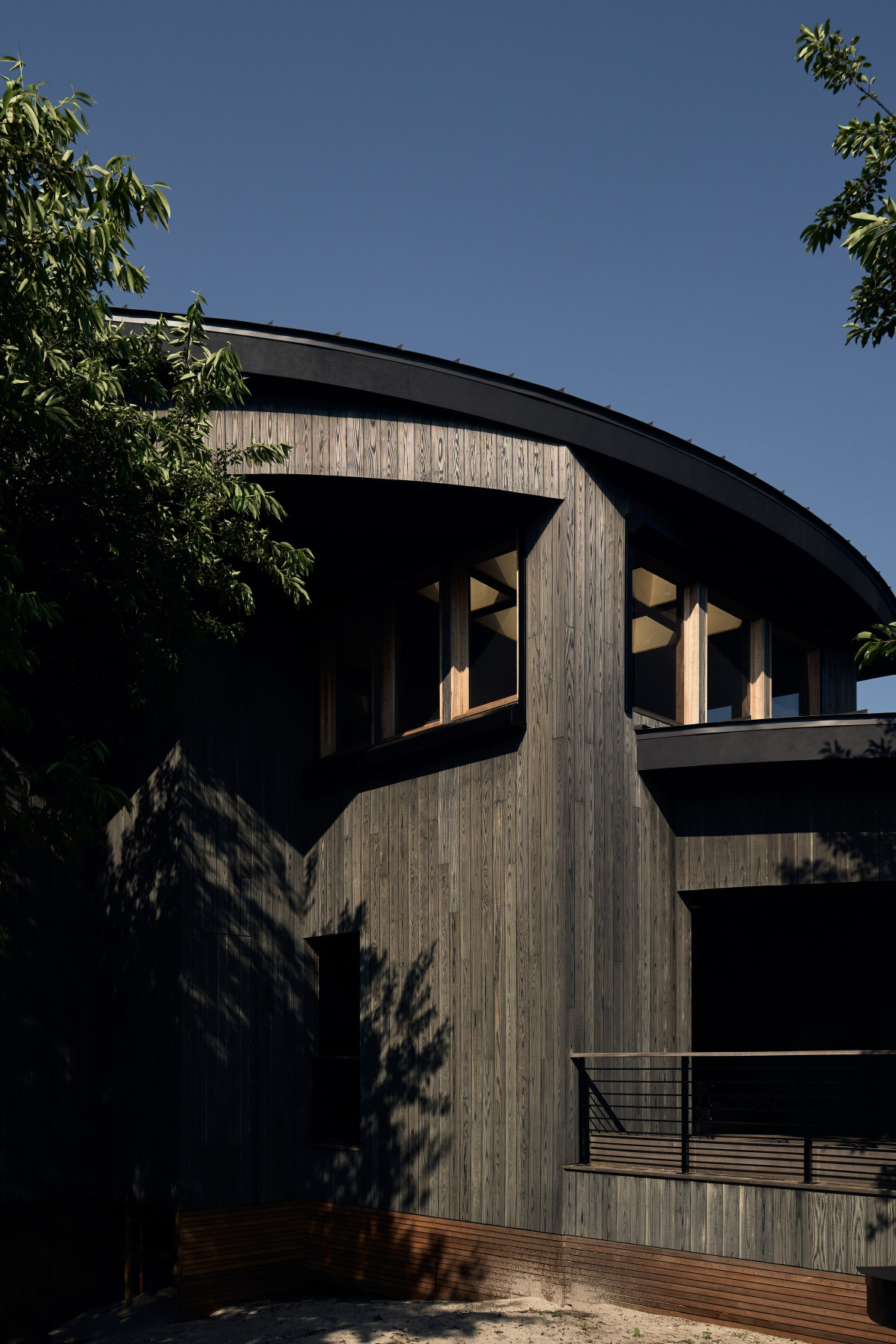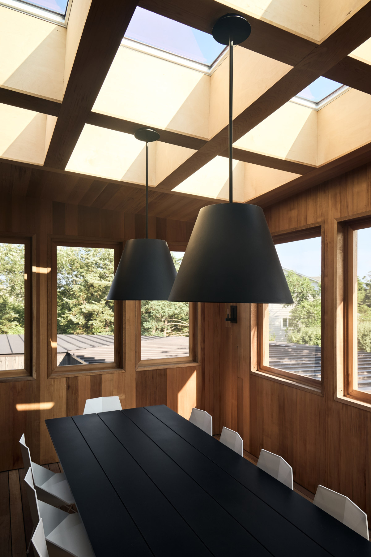 Uwagę zwraca również drewniana elewacja wykonana w japońskiej technice shou sugi ban, a także centralny dziedziniec oraz przestronny taras widokowy na piętrze. Pokój zabaw i mniejszy salon zostały wykończone drewnem cedrowym, dzięki czemu nabrały ciepłego, przytulnego charakteru. Z kolei duże przeszklenia i okna dachowe w jadalni nie tylko zapewniają piękne widoki, ale również zacierają granicę między wnętrzem a zewnętrzem, podkreślając więź człowieka z naturą.