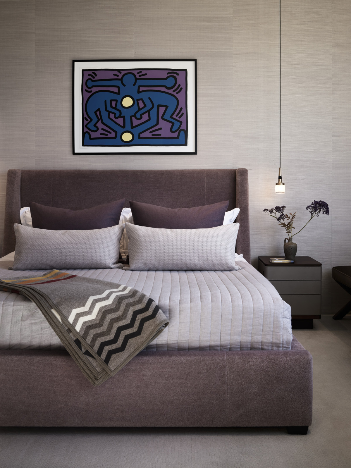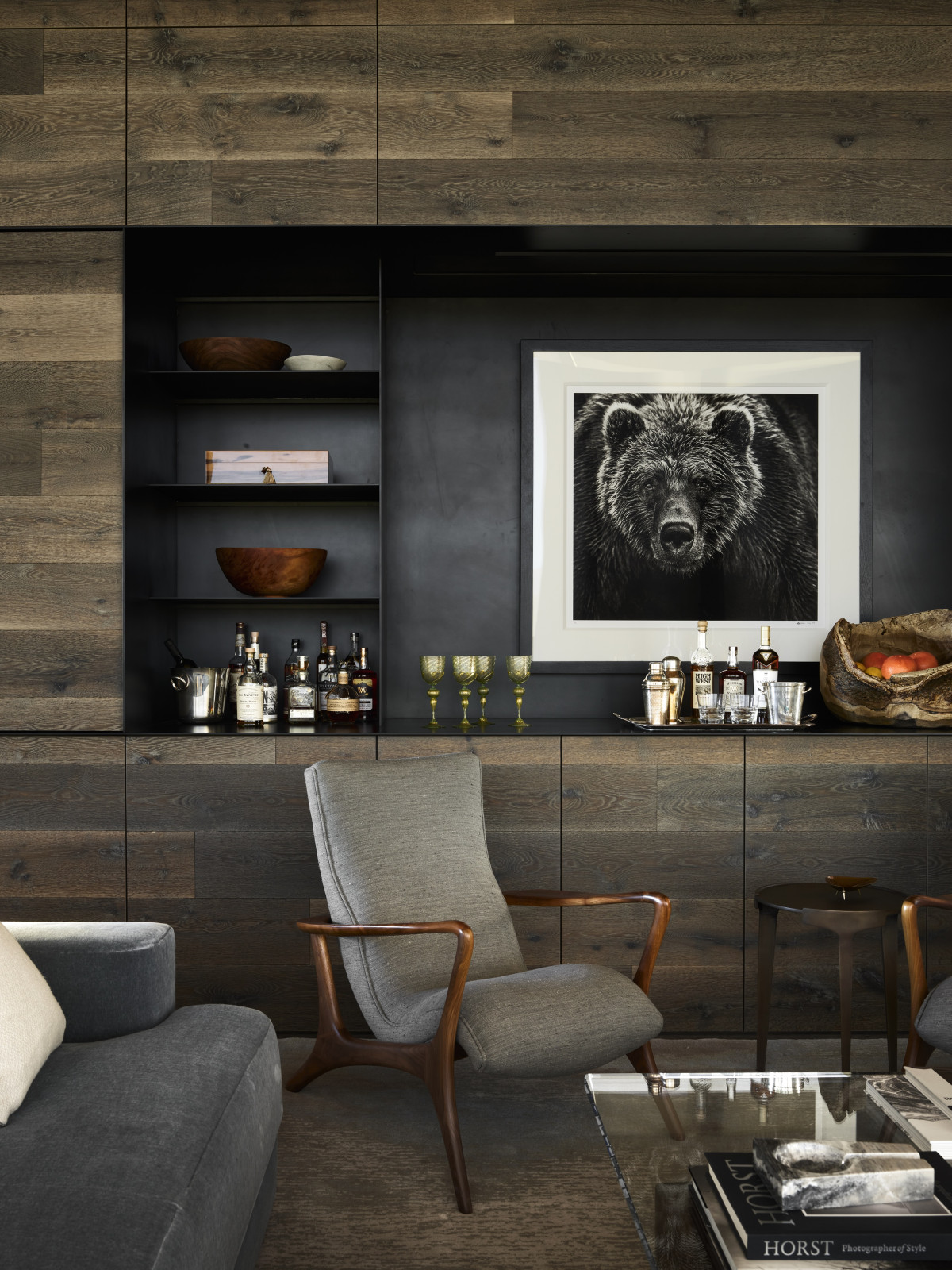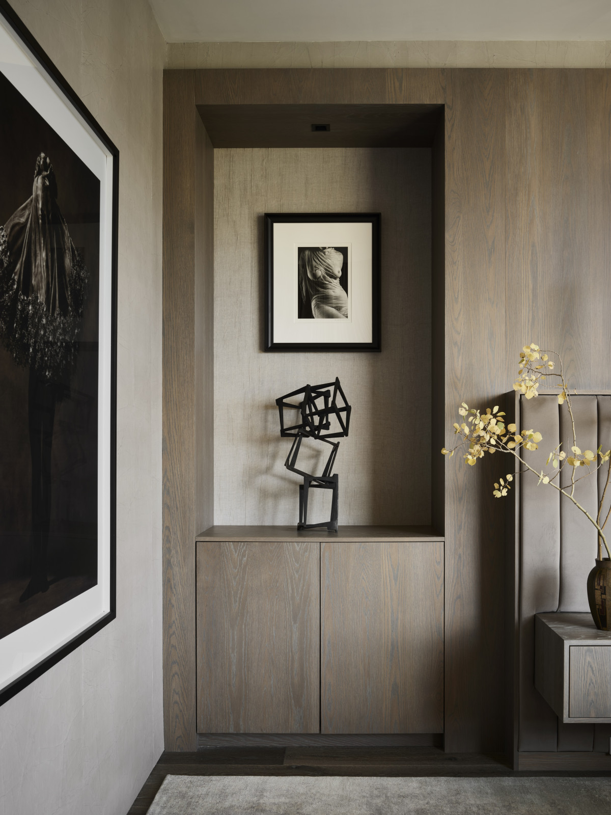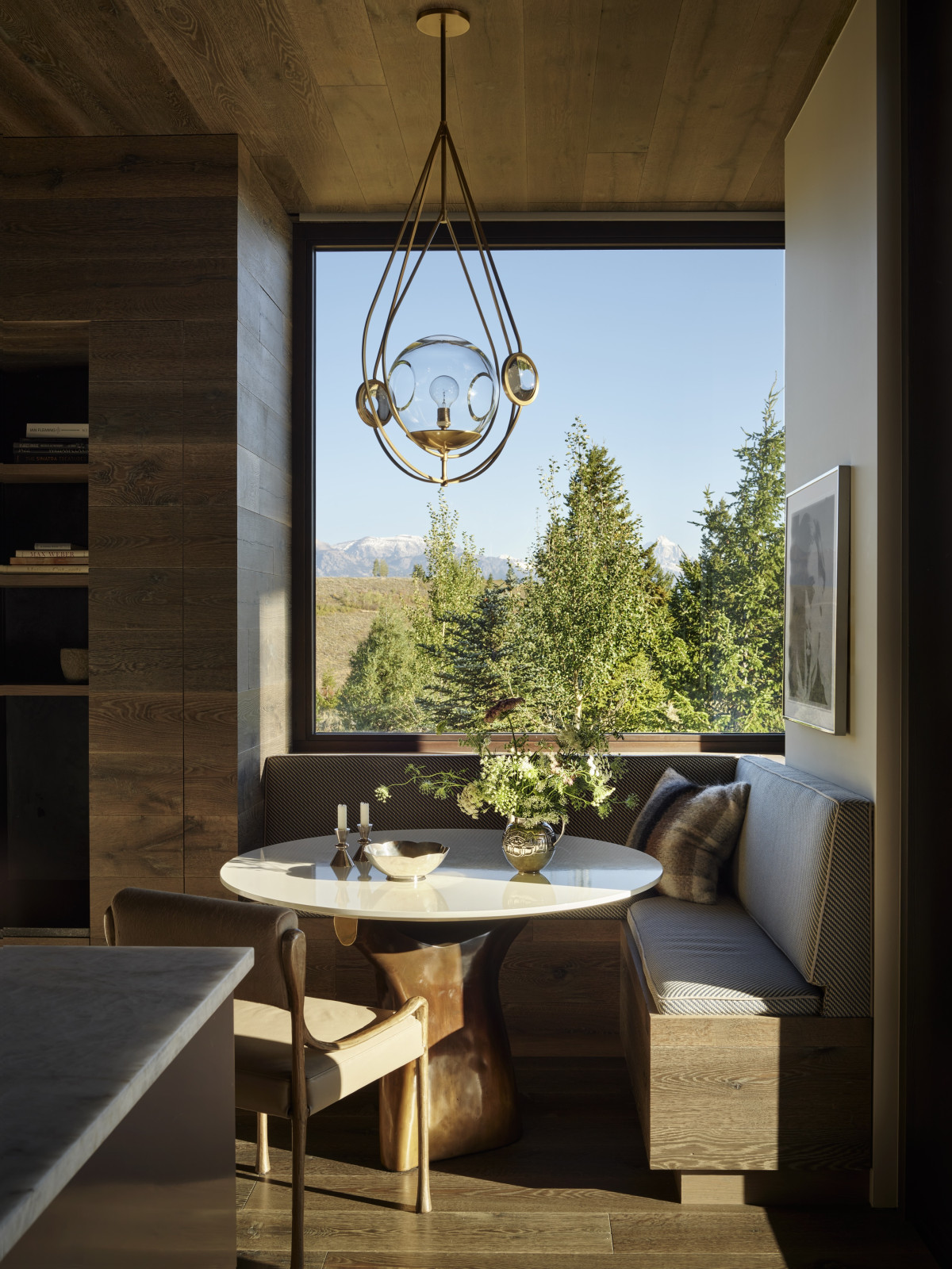 W całym domu dominują czyste linie i nowoczesne meble utrzymane w spokojnej, neutralnej palecie barwnej. Naturalne tkaniny jak moher, len, alpaka, wełna, skóra i metale jak mosiądz i brąz tworzą zestaw elegancki i jednocześnie ponadczasowy, opierając się przemijającym modom. Z kolei materiały wykończeniowe jak drewno dębowe, wapienne podłogi i blaty z kwarcytu tworzą subtelne, ale wyrafinowane tło dla sztuki.
