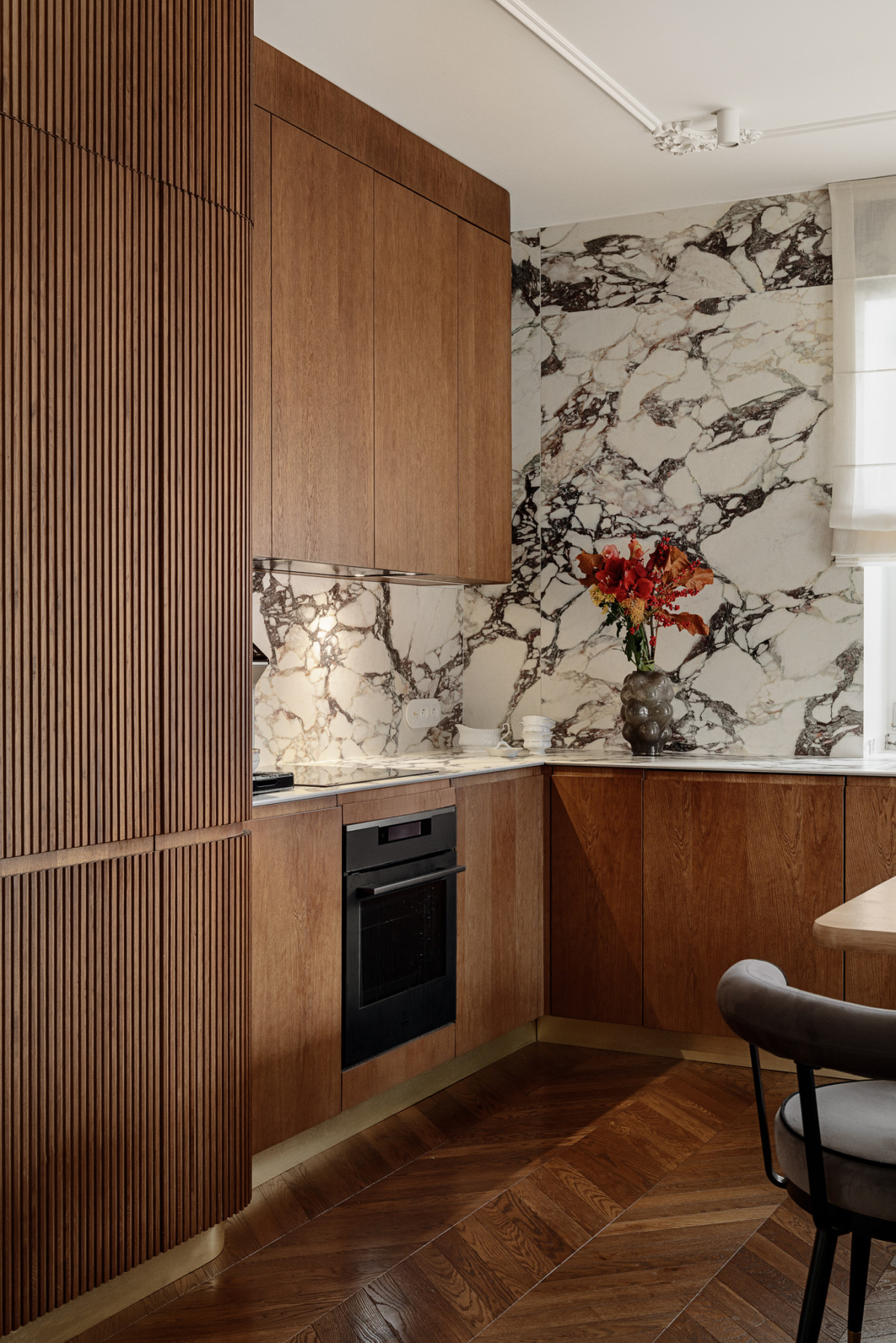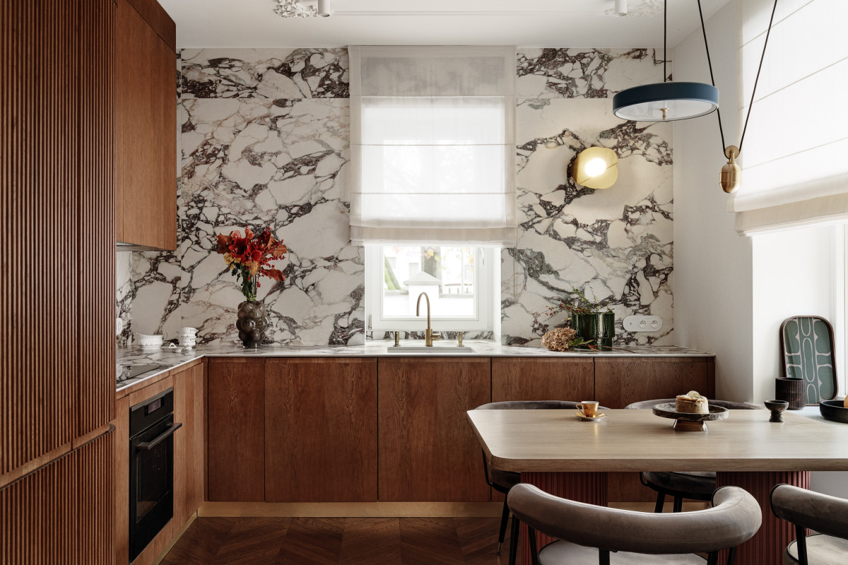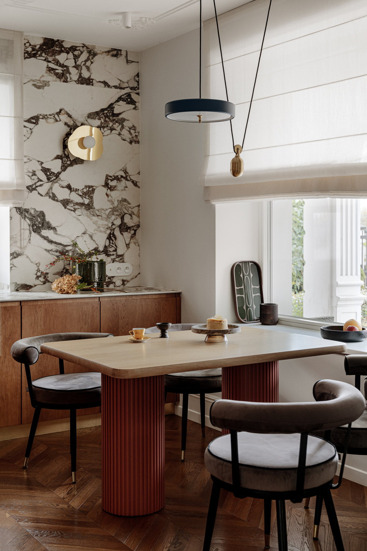 Wszystkie elementy wyposażenia kuchni, łącznie z niewielkim stołem, zostały wykonane na zamówienie według projektu pracowni Magma. W pomieszczeniu uwagę zwraca okładzina ścienna oraz blat z kamienia Calacatta Viola o charakterystycznym, wyrazistym rysunku, który przełamuje klasyczną formę zabudowy.