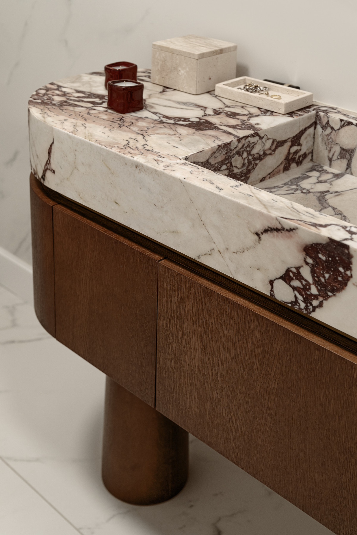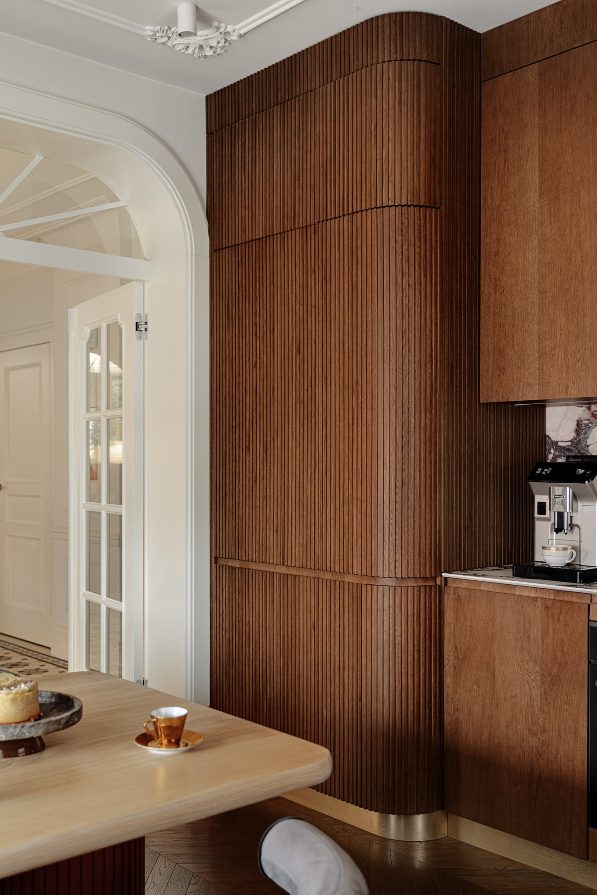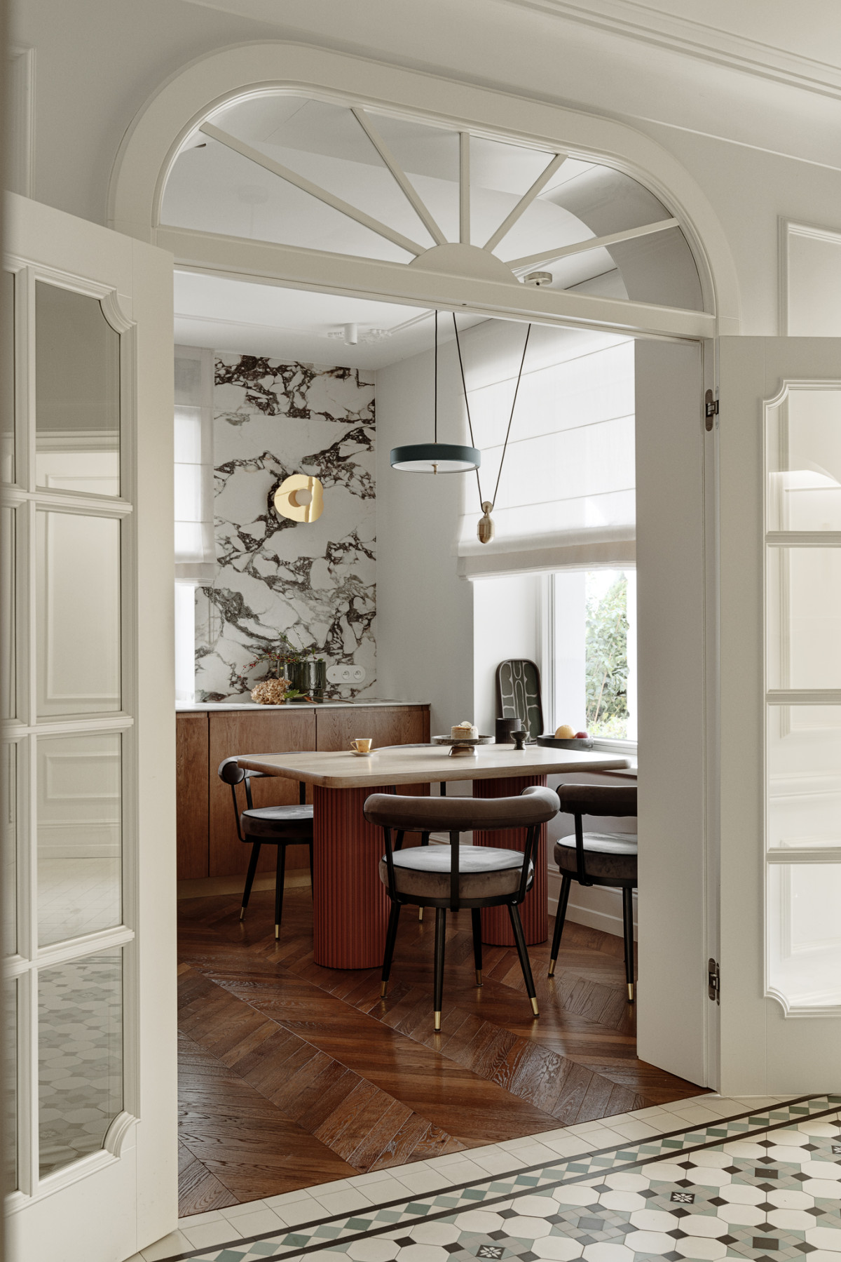 Wszystkie elementy wyposażenia kuchni, łącznie z niewielkim stołem, zostały wykonane na zamówienie według projektu pracowni Magma. W pomieszczeniu uwagę zwraca okładzina ścienna oraz blat z kamienia Calacatta Viola o charakterystycznym, wyrazistym rysunku, który przełamuje klasyczną formę zabudowy.