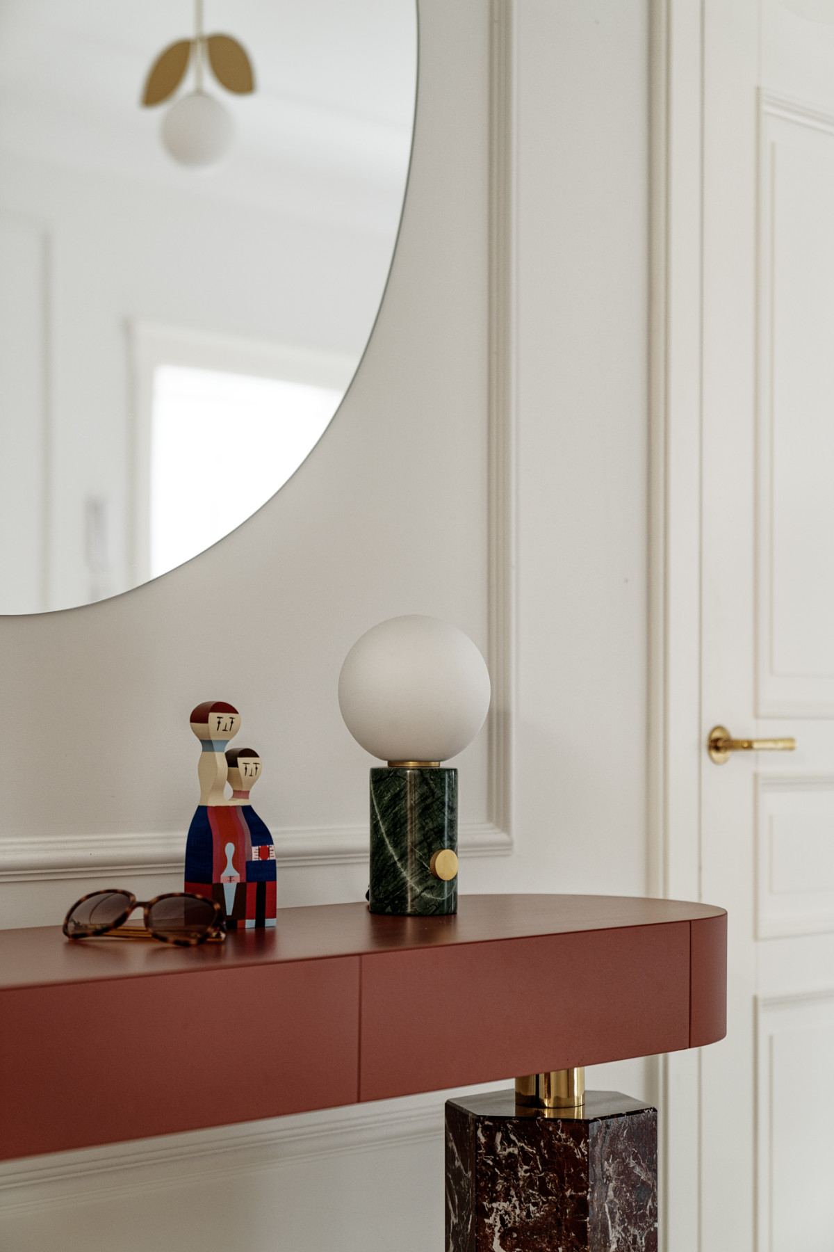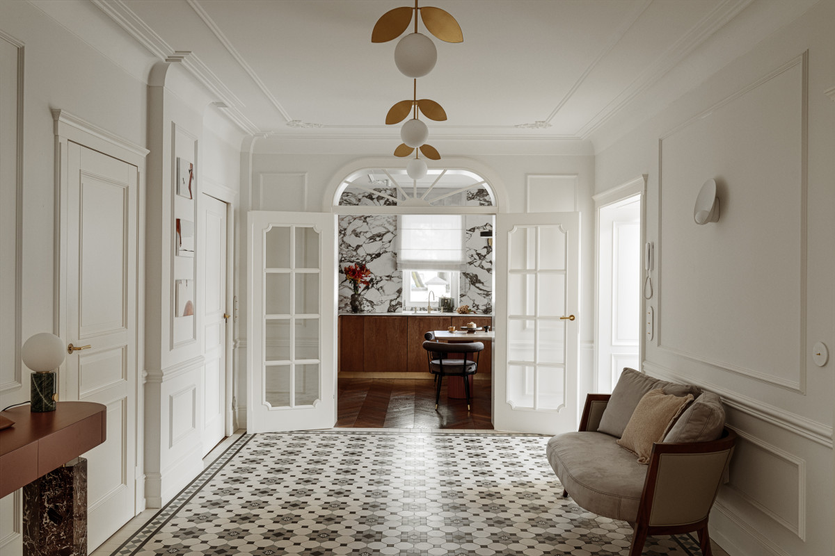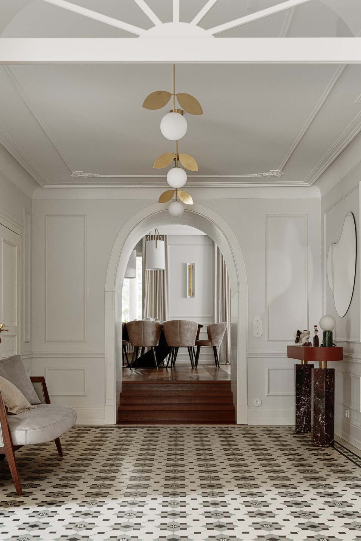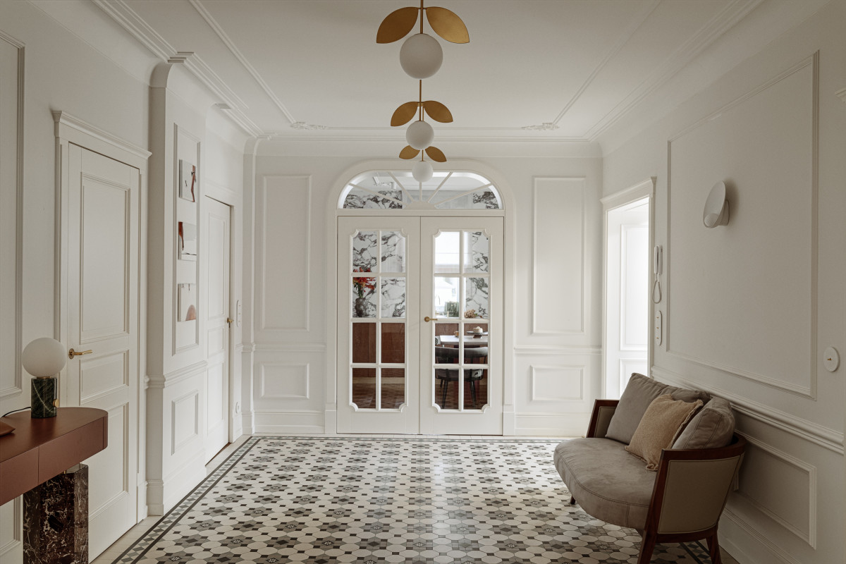 W strefie wejścia uwagę przykuwa charakterystyczna posadzka z klasycznym wzorem z bordiurą ułożoną z mozaiki Winckelmans. Zastosowana tu paleta kolorystyczna opiera się na neutralnych, ciepłych beżach i bielach, tworząc eleganckie i spokojne tło dla wyrazistych detali. Ściany i sufity ozdobiono sztukateriami oraz wysokimi listwami przypodłogowymi, by jeszcze bardziej podkreślić klasyczny charakter aranżacji. Dopełnieniem są osiowo rozmieszczone, mosiężne lampy o kwiatowej formie oraz tryptyk autorstwa Julity Malinowskiej.