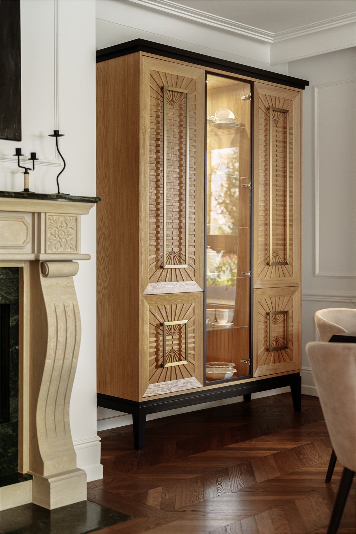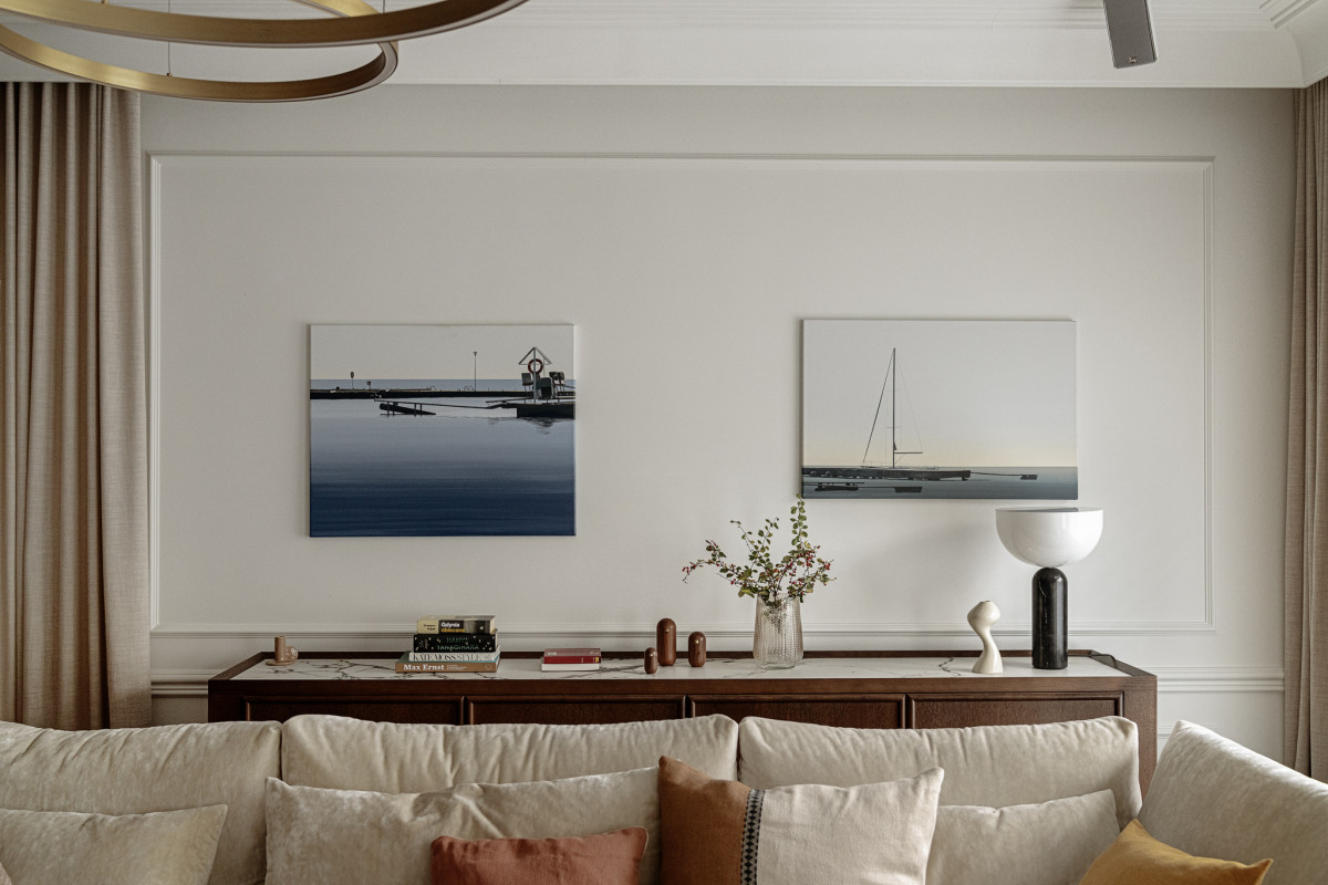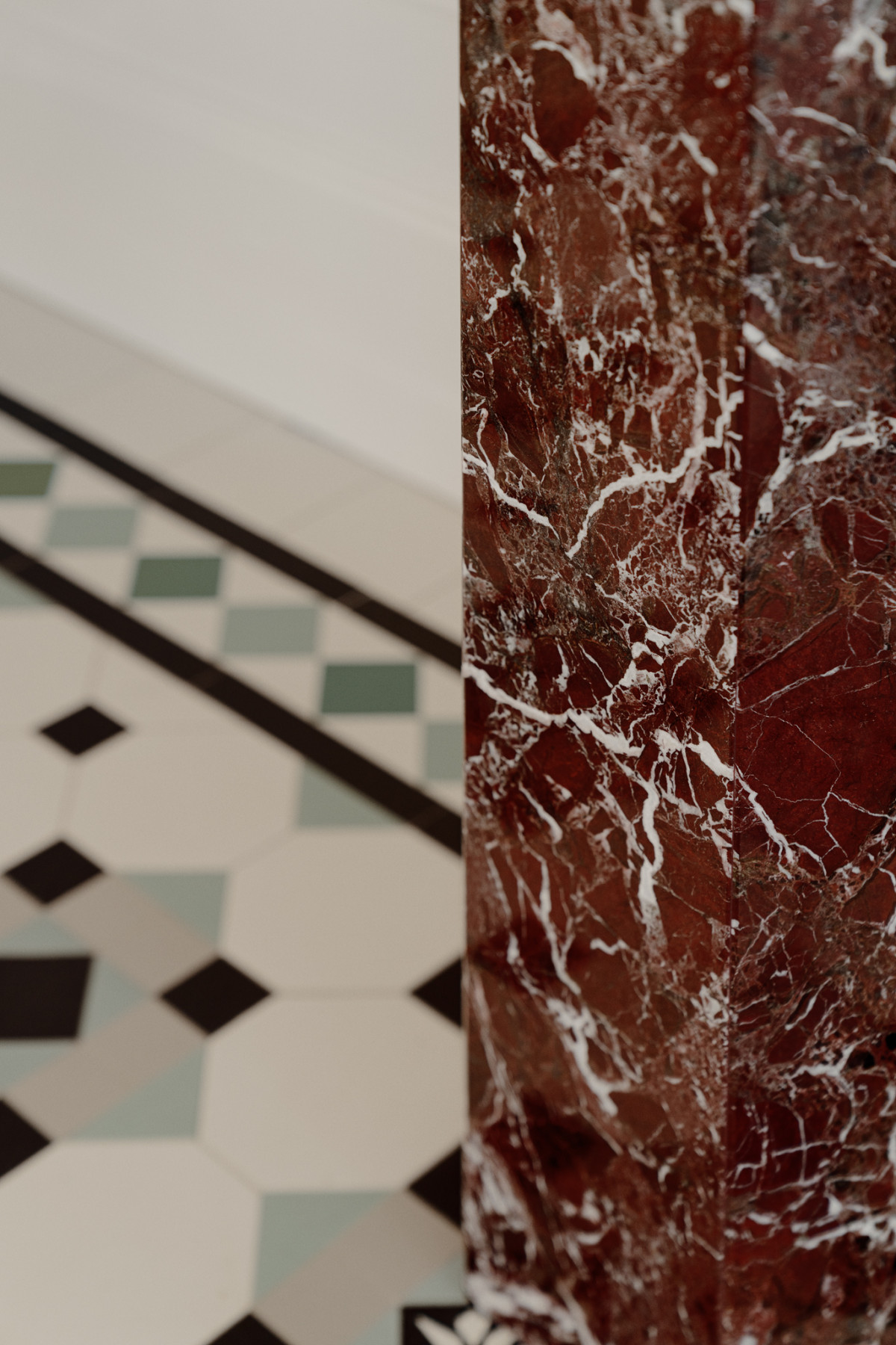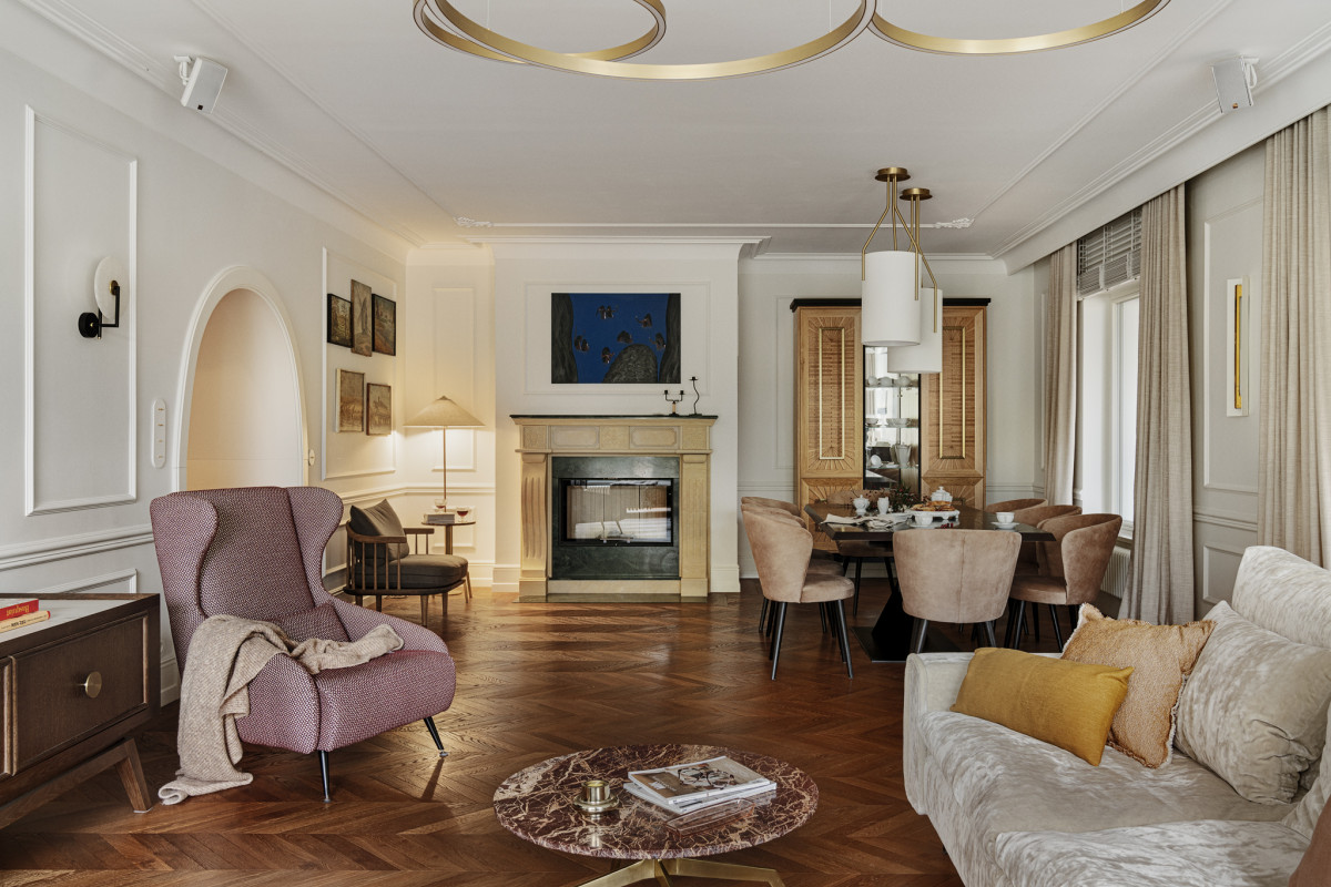 W strefie wejścia uwagę przykuwa charakterystyczna posadzka z klasycznym wzorem z bordiurą ułożoną z mozaiki Winckelmans. Zastosowana tu paleta kolorystyczna opiera się na neutralnych, ciepłych beżach i bielach, tworząc eleganckie i spokojne tło dla wyrazistych detali. Ściany i sufity ozdobiono sztukateriami oraz wysokimi listwami przypodłogowymi, by jeszcze bardziej podkreślić klasyczny charakter aranżacji. Dopełnieniem są osiowo rozmieszczone, mosiężne lampy o kwiatowej formie oraz tryptyk autorstwa Julity Malinowskiej.